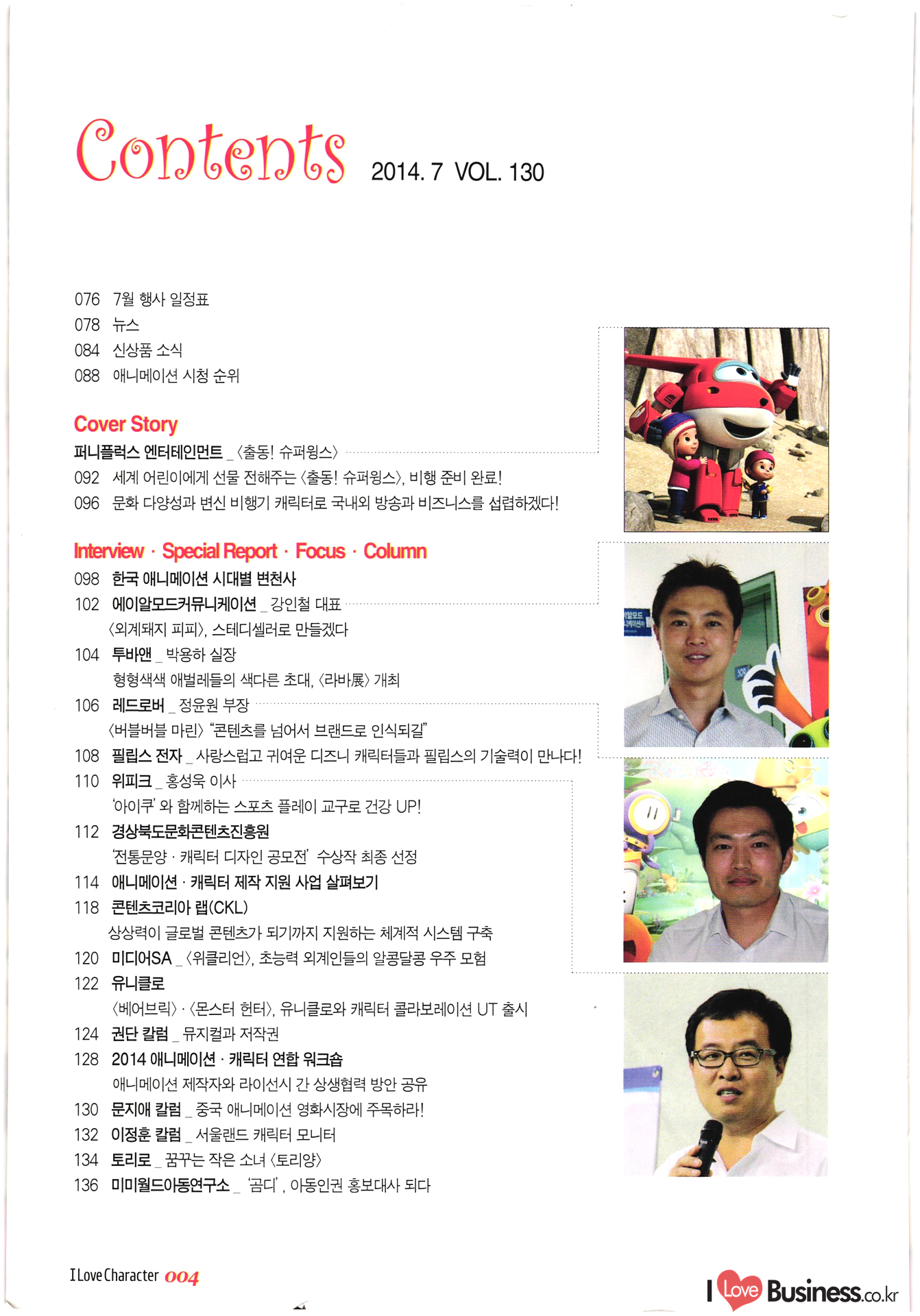 Cover Story 퍼니플럭스 엔터테인먼트 출동! 슈퍼윙스) 092 세계 어린이에게 선물 전해주는 출동! 슈퍼윙스〉, 비행 준비 완료!! 096 문화 다양성과 변신 비행기 캐릭터로 국내외 방송과 비즈니스를 섭렵하겠다!