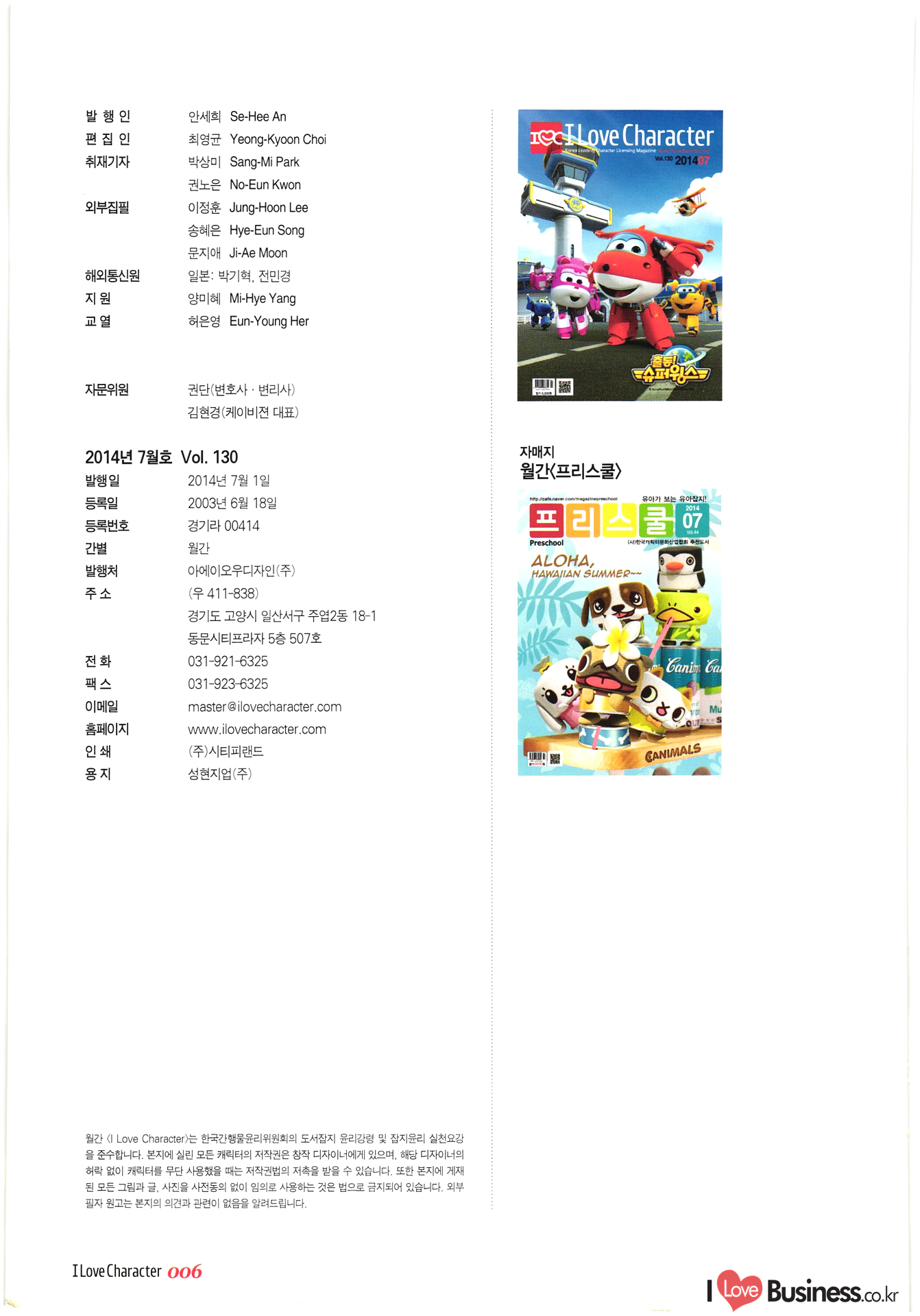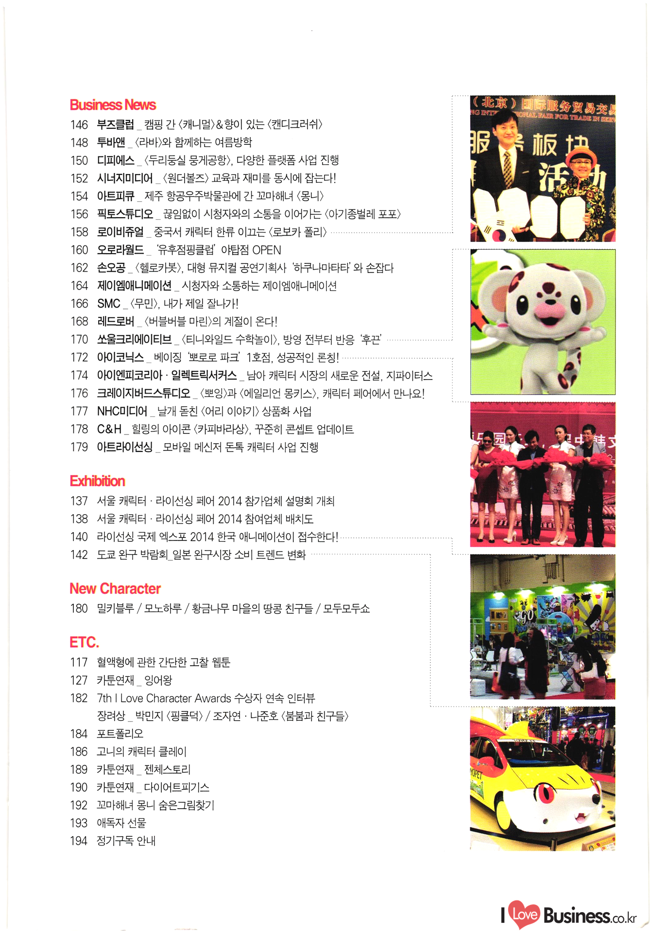 Exhibition 137 서울 캐릭터 · 라이선싱 페어 2014 참가업체 설명회 개최 138 서울 캐릭터·라이선싱 페어 2014 참여업체 배치도 140 라이선싱 국제 엑스포 2014 한국 애니메이션이 접수한다! 142 도쿄 완구 박람회 일본 완구시장 소비 트렌드 변화