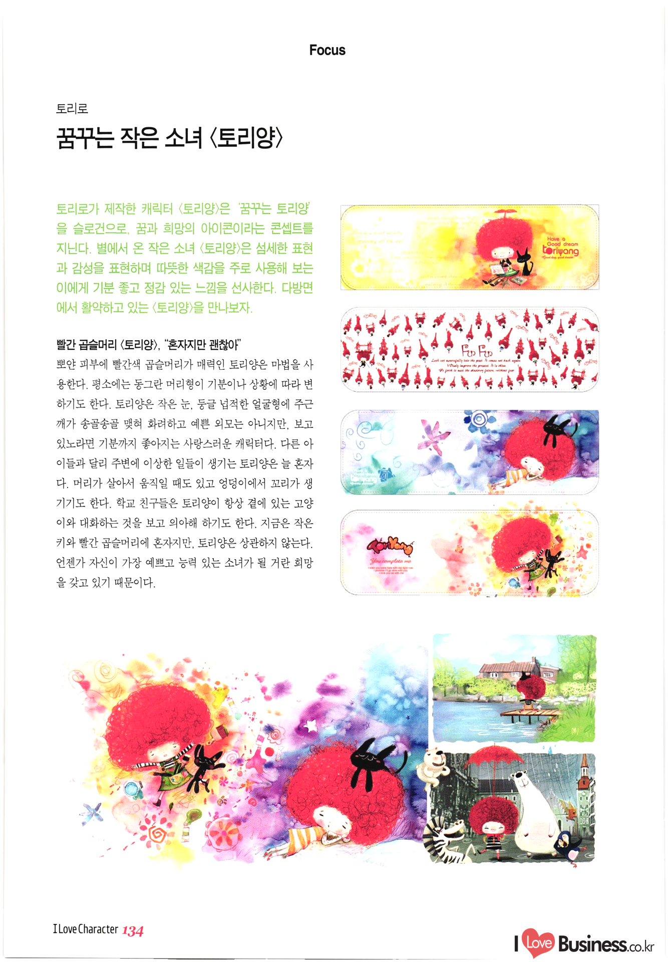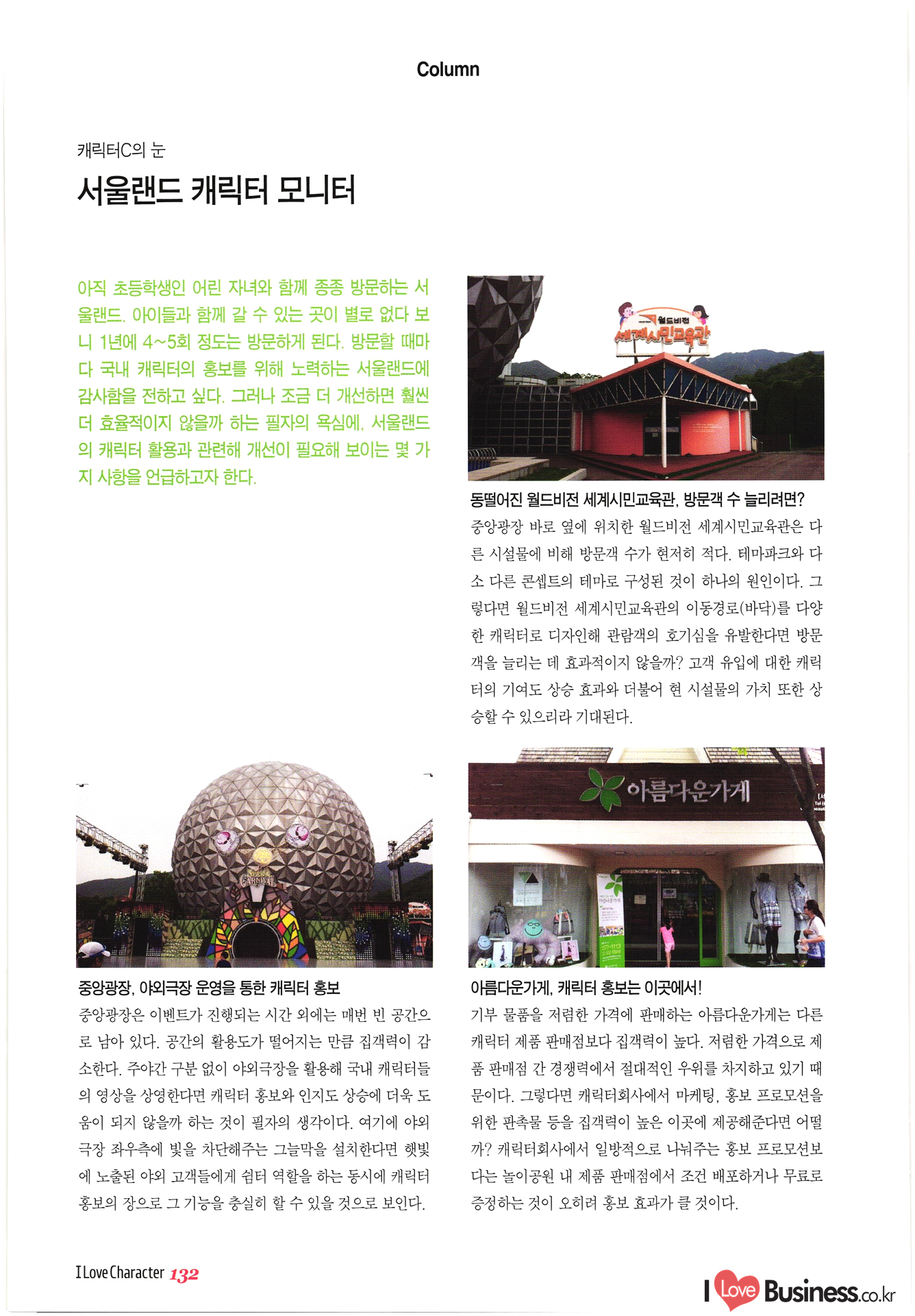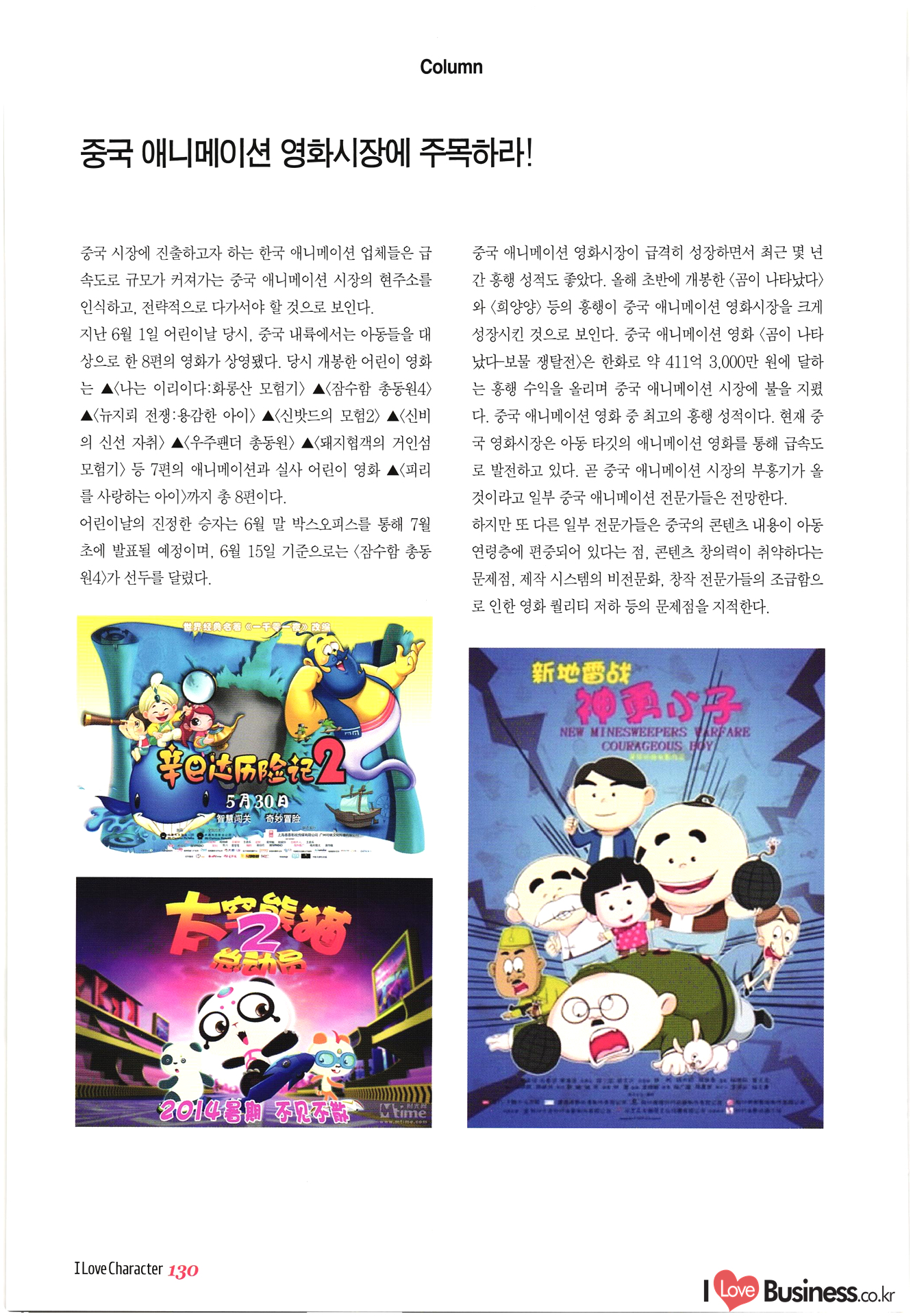 〈베어브릭〉·〈몬스터 헌터〉, 유니클로와 캐릭터 콜라보레이션 UT 출시 124 권단 칼럼 뮤지컬과 저작권 128 2014 애니메이션 · 캐릭터 연합 워크숍 | 애니메이션 제작자와 라이선시 간 상생협력 방안 공유 130 문지애 칼럼 중국 애니메이션 영화시장에 주목하라!! 132 이정훈 칼럼 서울랜드 캐릭터 모니터 134 토리로 꿈꾸는 작은 소녀 〈토리양〉 136 미미월드이동연구소 '곰디' , 아동인권 홍보대사 되다.