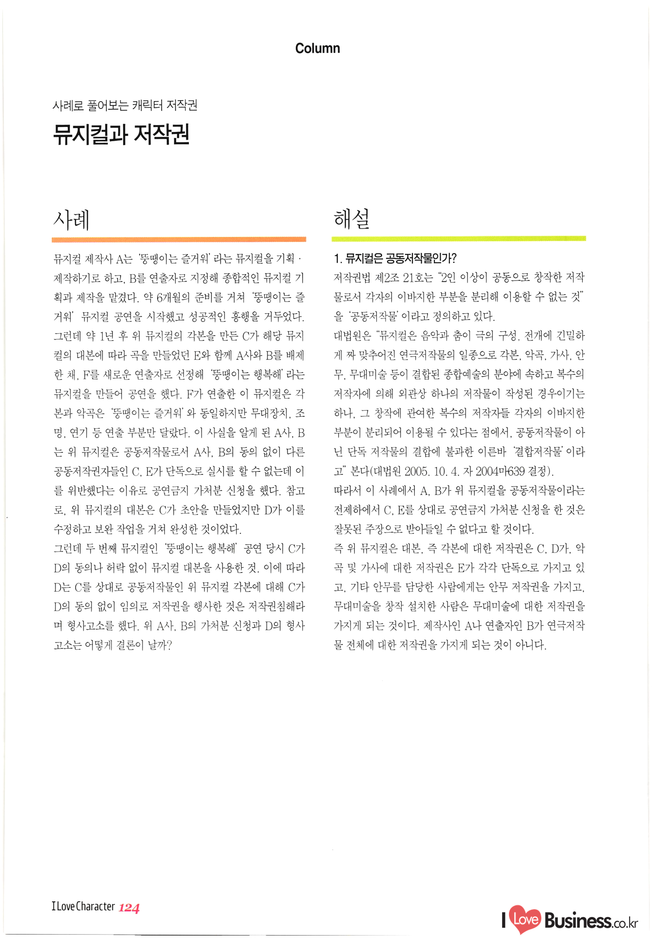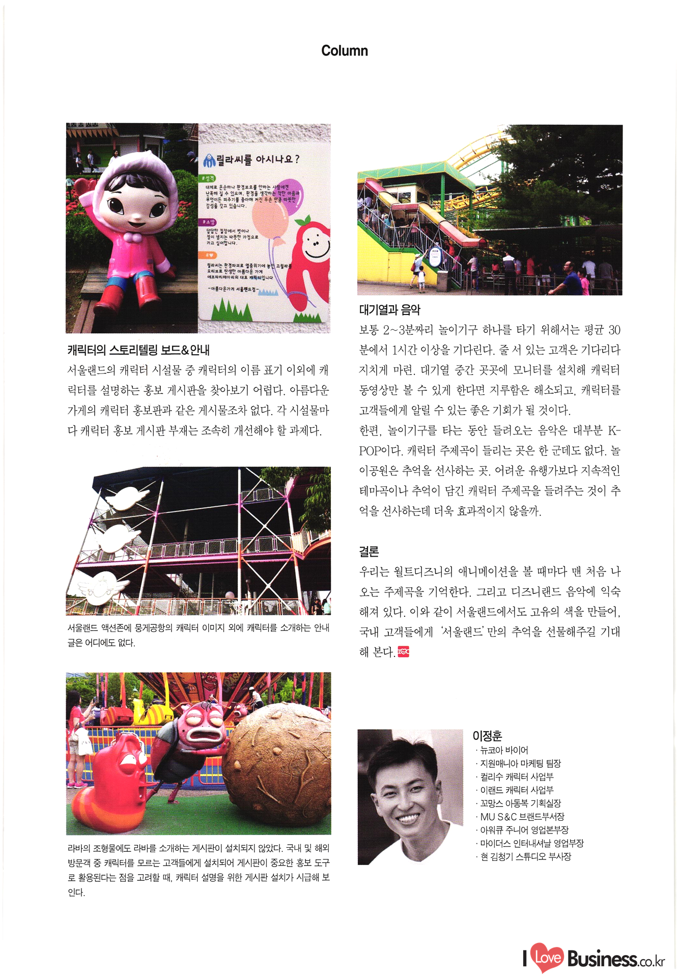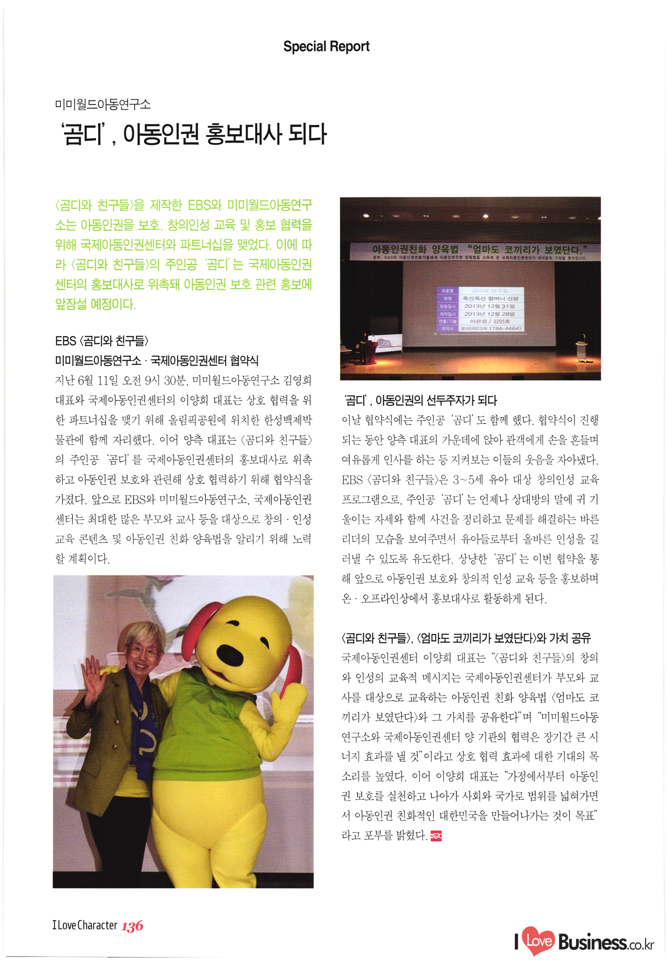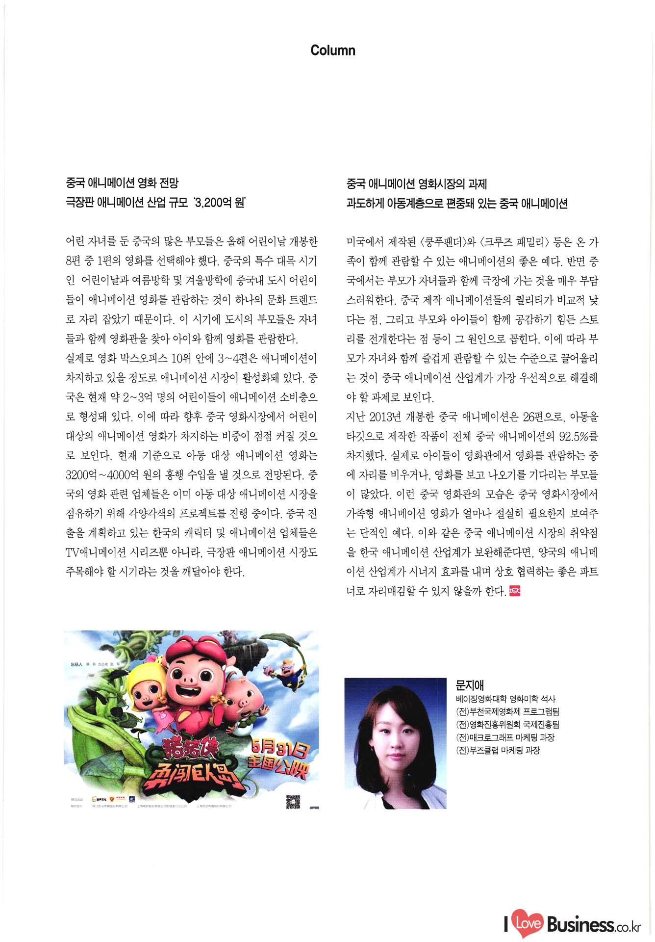 〈베어브릭〉·〈몬스터 헌터〉, 유니클로와 캐릭터 콜라보레이션 UT 출시 124 권단 칼럼 뮤지컬과 저작권 128 2014 애니메이션 · 캐릭터 연합 워크숍 | 애니메이션 제작자와 라이선시 간 상생협력 방안 공유 130 문지애 칼럼 중국 애니메이션 영화시장에 주목하라!! 132 이정훈 칼럼 서울랜드 캐릭터 모니터 134 토리로 꿈꾸는 작은 소녀 〈토리양〉 136 미미월드이동연구소 '곰디' , 아동인권 홍보대사 되다.