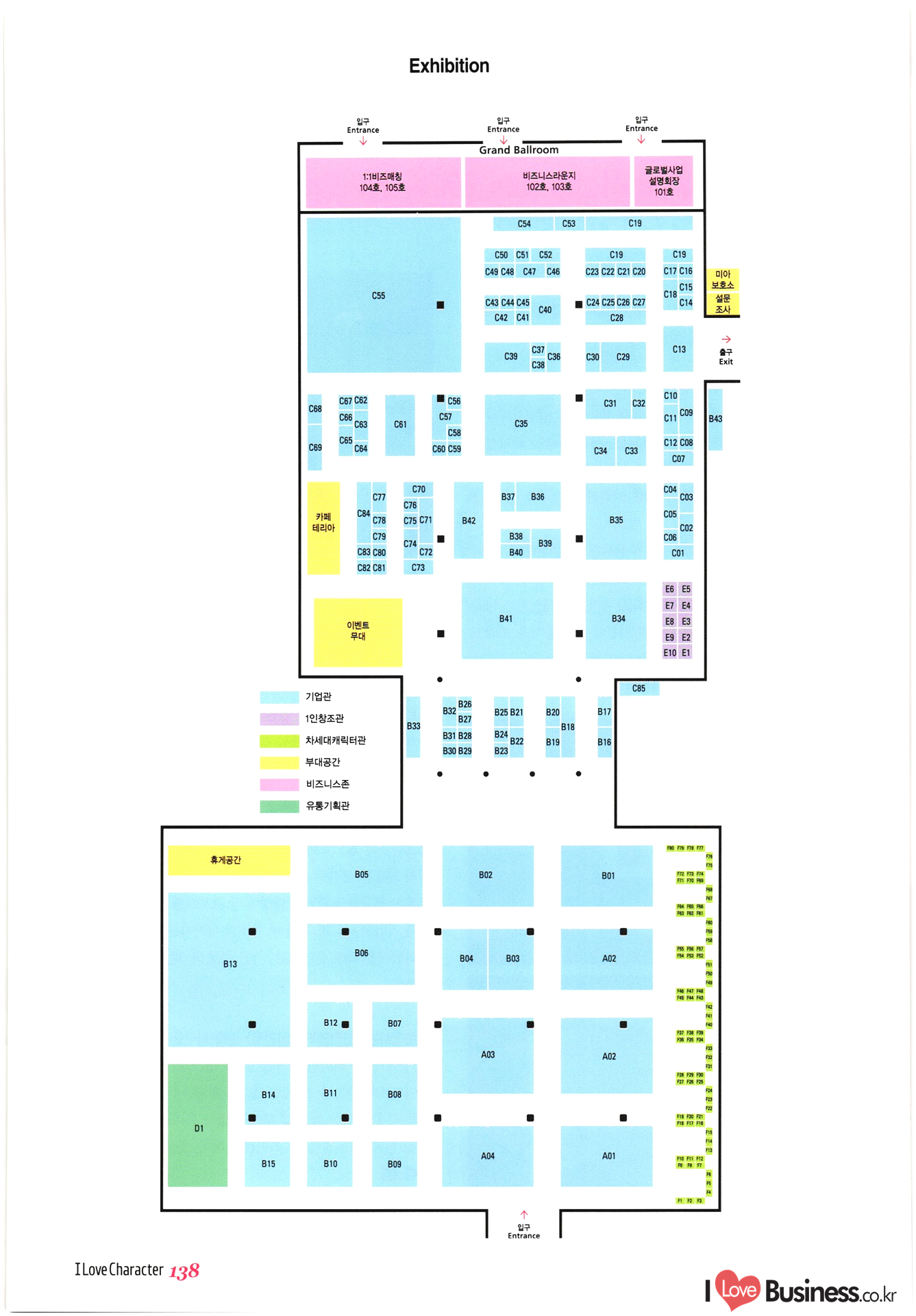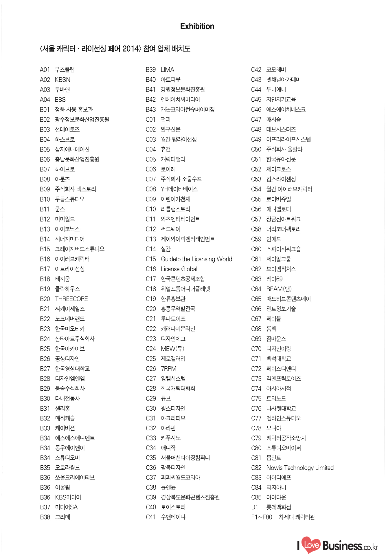 B39 LIMA B40 아트피큐 B41 강원정보문화진흥원 B42 엔에이치씨미디어 B43 캐논코리아컨슈머이미징 C01 펀피 C02 완구신문 C03 월간 탑라이선싱 C04 휴건 C05 캐릭터밸리 C06 로이레 C07 주식회사 소울수프 C08 YH데이타베이스 C09 어린이가천재 C10 리틀램스토리 C11 와츠엔터테이먼트 C12 써드웨이 C13 제이와이피엔터테인먼트 C14 실감 C15 Guideto the Licensing World C16 License Global C17 한국콘텐츠공제조합 C18 위얼프롬어나더플레넷 C19 한류홍보관 C20 홍콩무역발전국 C21 루나토이즈 C22 캐러나비온라인 C23 디자인에그 C24 MEW(뮤) C25 제로갤러리 C26 7RPM C27 잉켐시스템 C28 한국캐릭터협회 C29 큐브 C30 윙스디자인 C31 아크리티브 C32 아라핀 C33 카푸시노 C34 애니작 C35 서울머천다이징컴퍼니 C36 팔복디자인 C37 피피씨월드코리아 C38 듄앤듄 C39 경상북도문화콘텐츠진흥원 C40 토이스토리 C41 수앤데이나