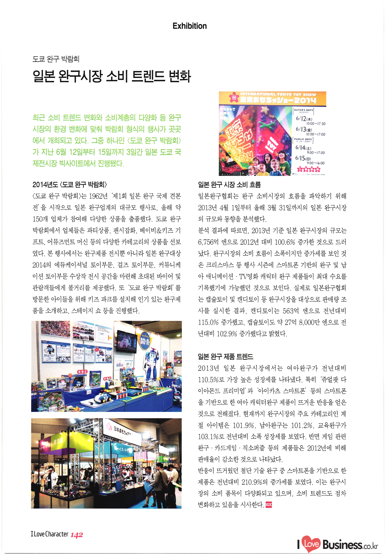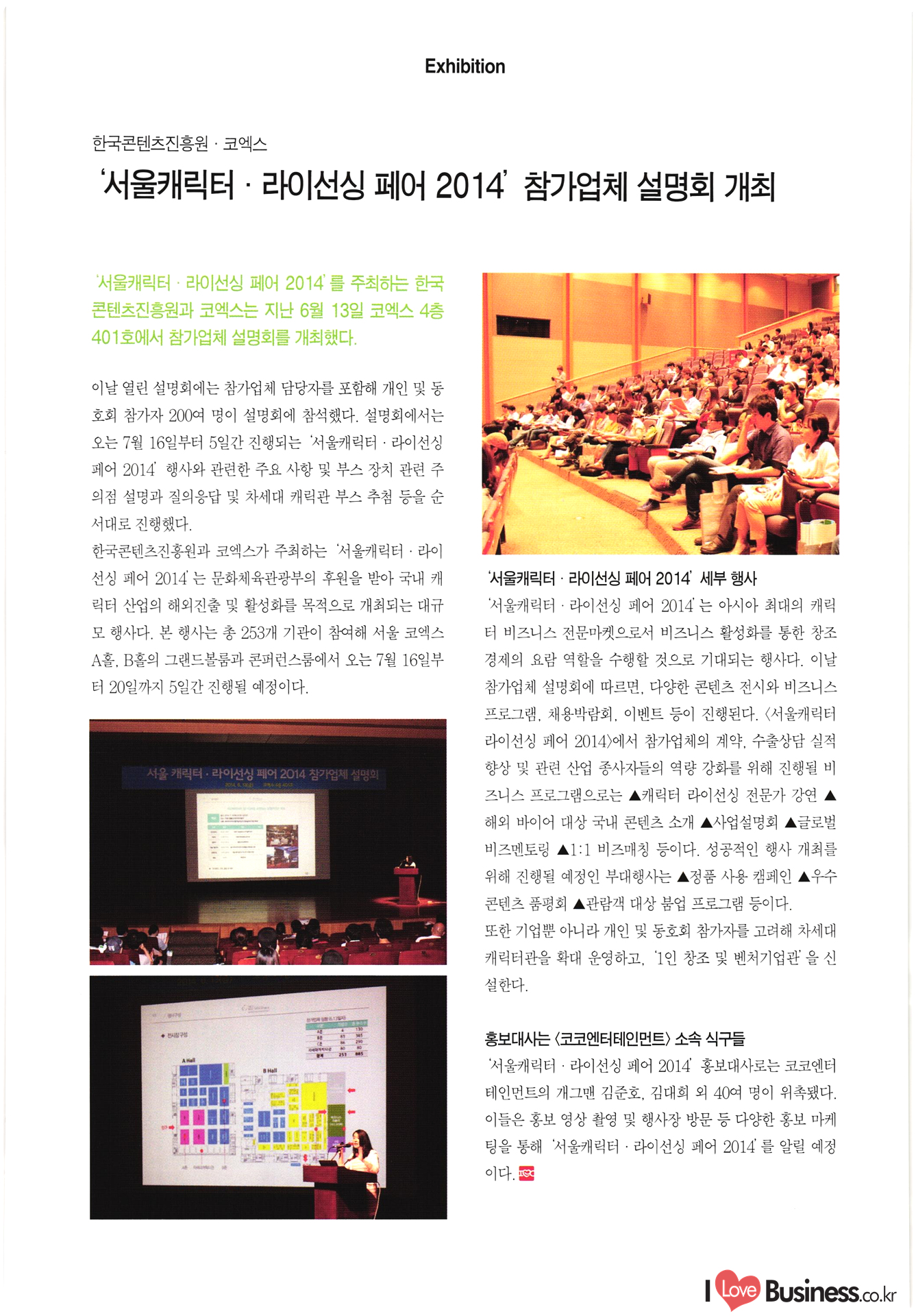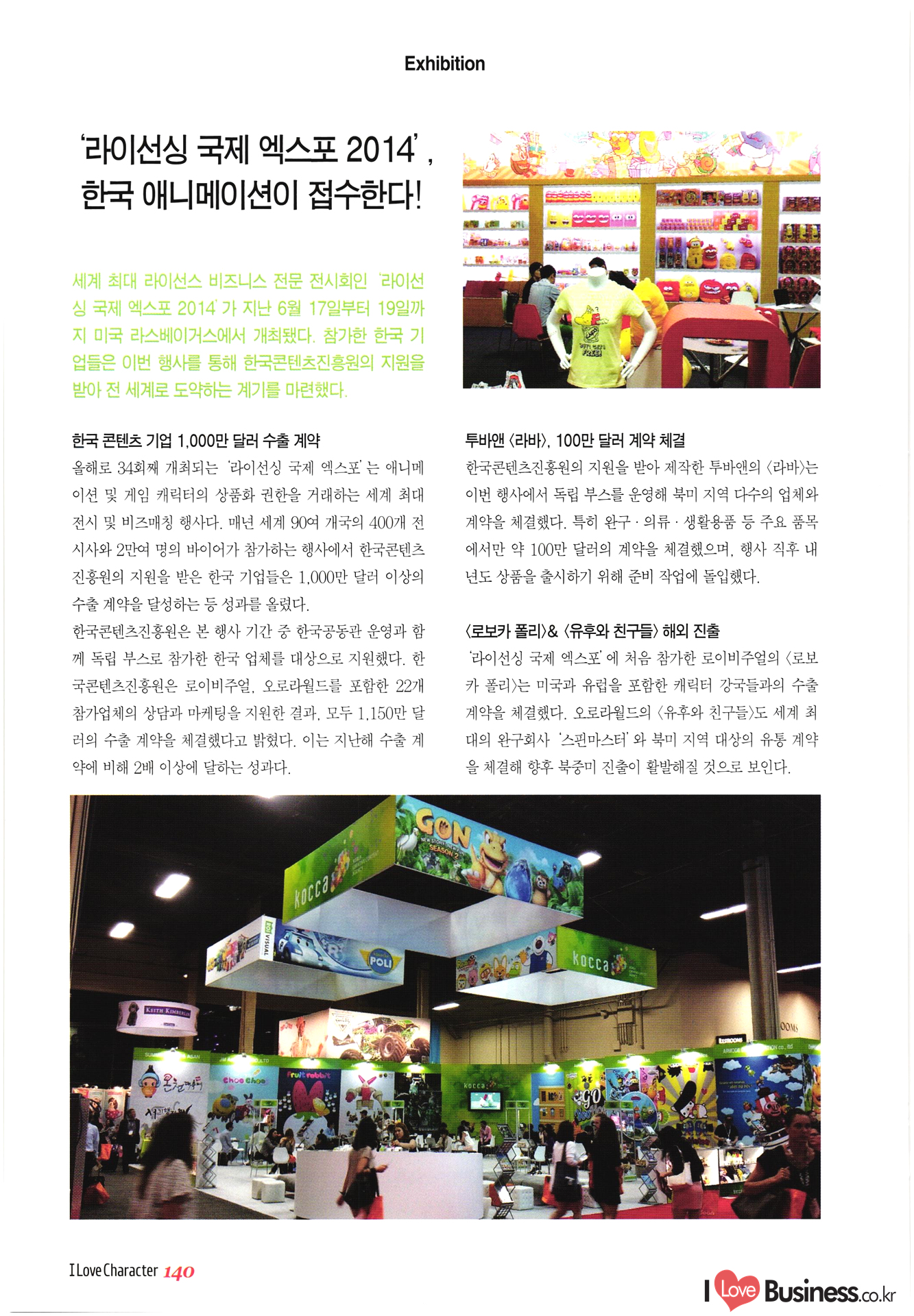Exhibition 137 서울 캐릭터 · 라이선싱 페어 2014 참가업체 설명회 개최 138 서울 캐릭터·라이선싱 페어 2014 참여업체 배치도 140 라이선싱 국제 엑스포 2014 한국 애니메이션이 접수한다! 142 도쿄 완구 박람회 일본 완구시장 소비 트렌드 변화
