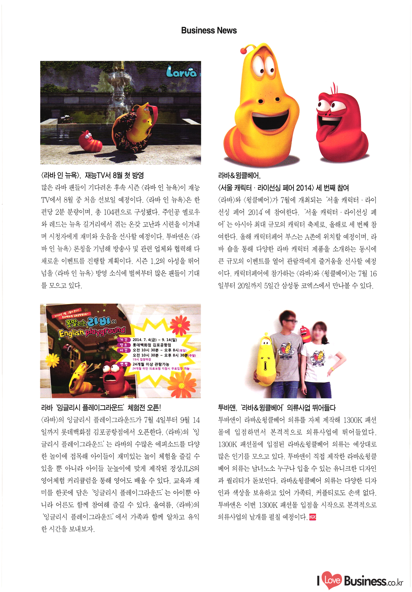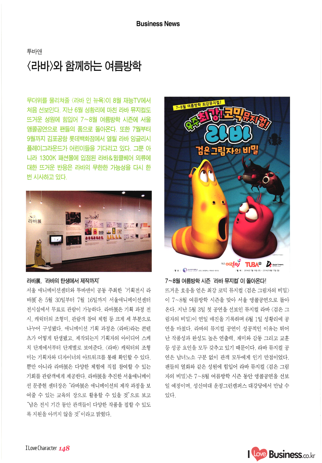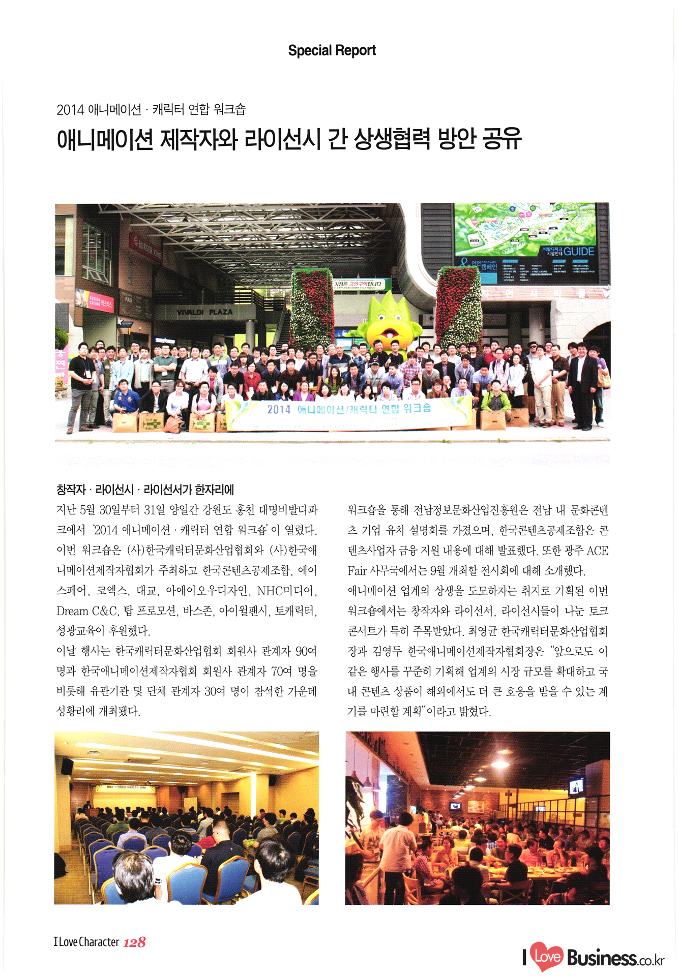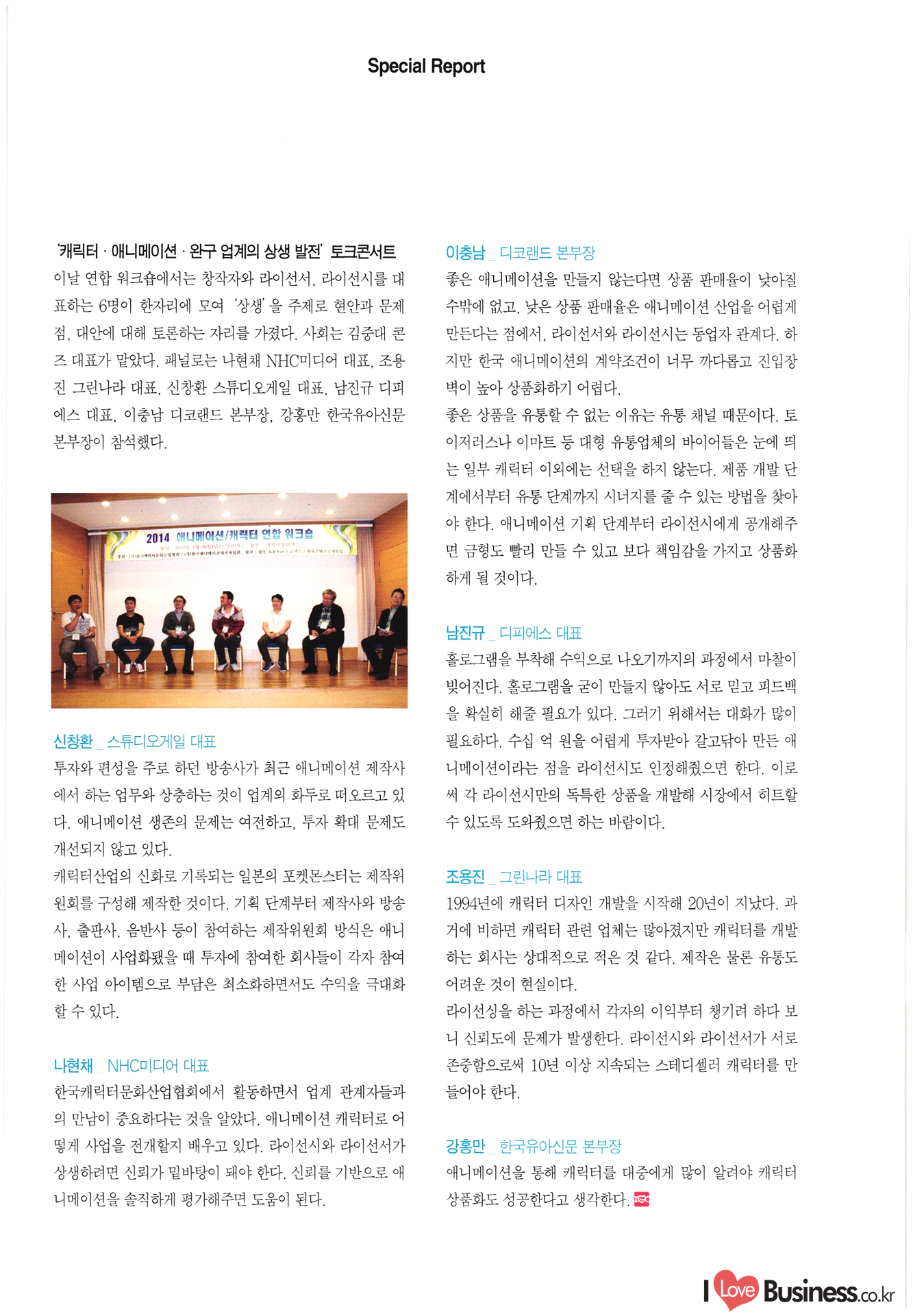 Exhibition 137 서울 캐릭터 · 라이선싱 페어 2014 참가업체 설명회 개최 138 서울 캐릭터·라이선싱 페어 2014 참여업체 배치도 140 라이선싱 국제 엑스포 2014 한국 애니메이션이 접수한다! 142 도쿄 완구 박람회 일본 완구시장 소비 트렌드 변화
