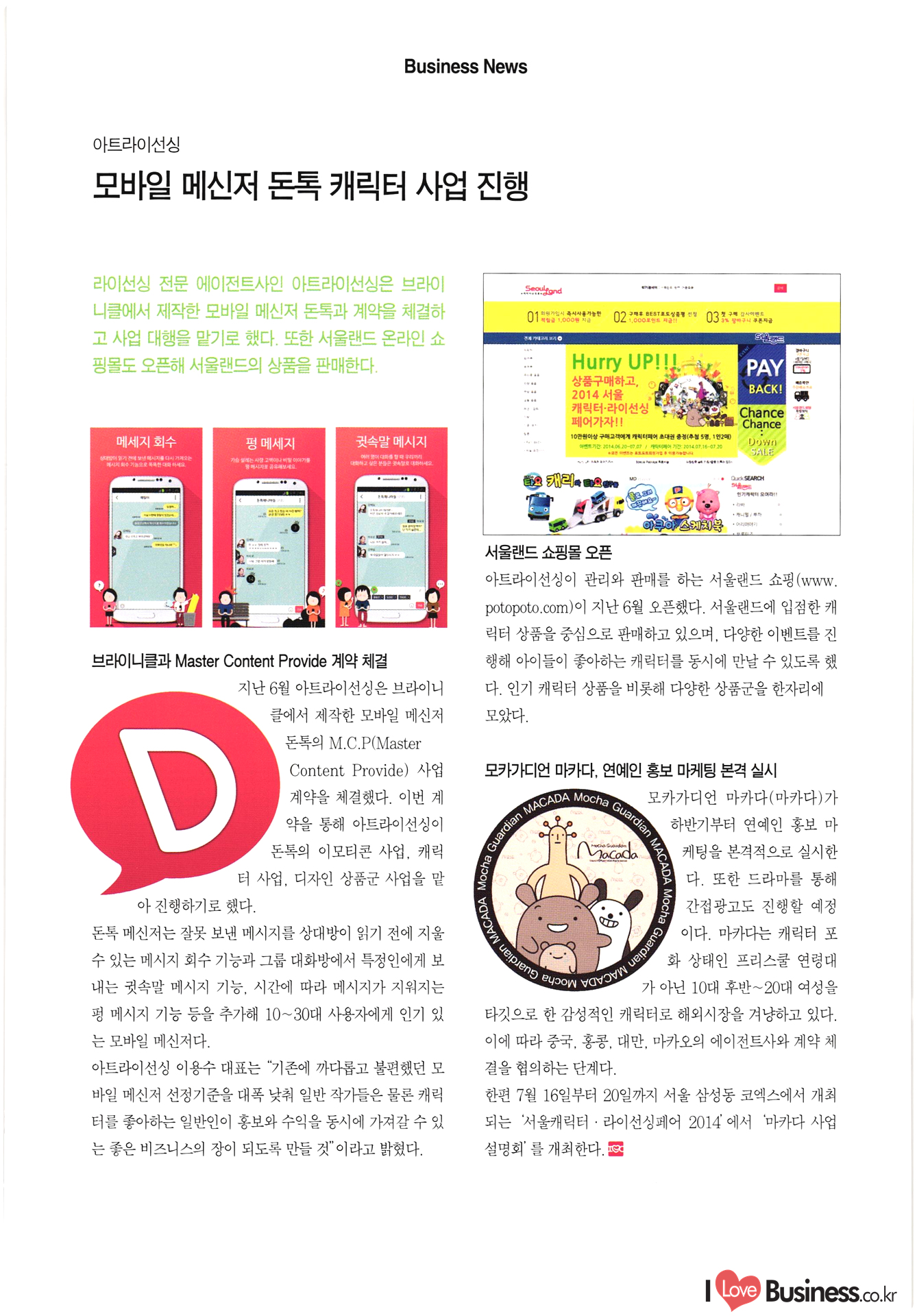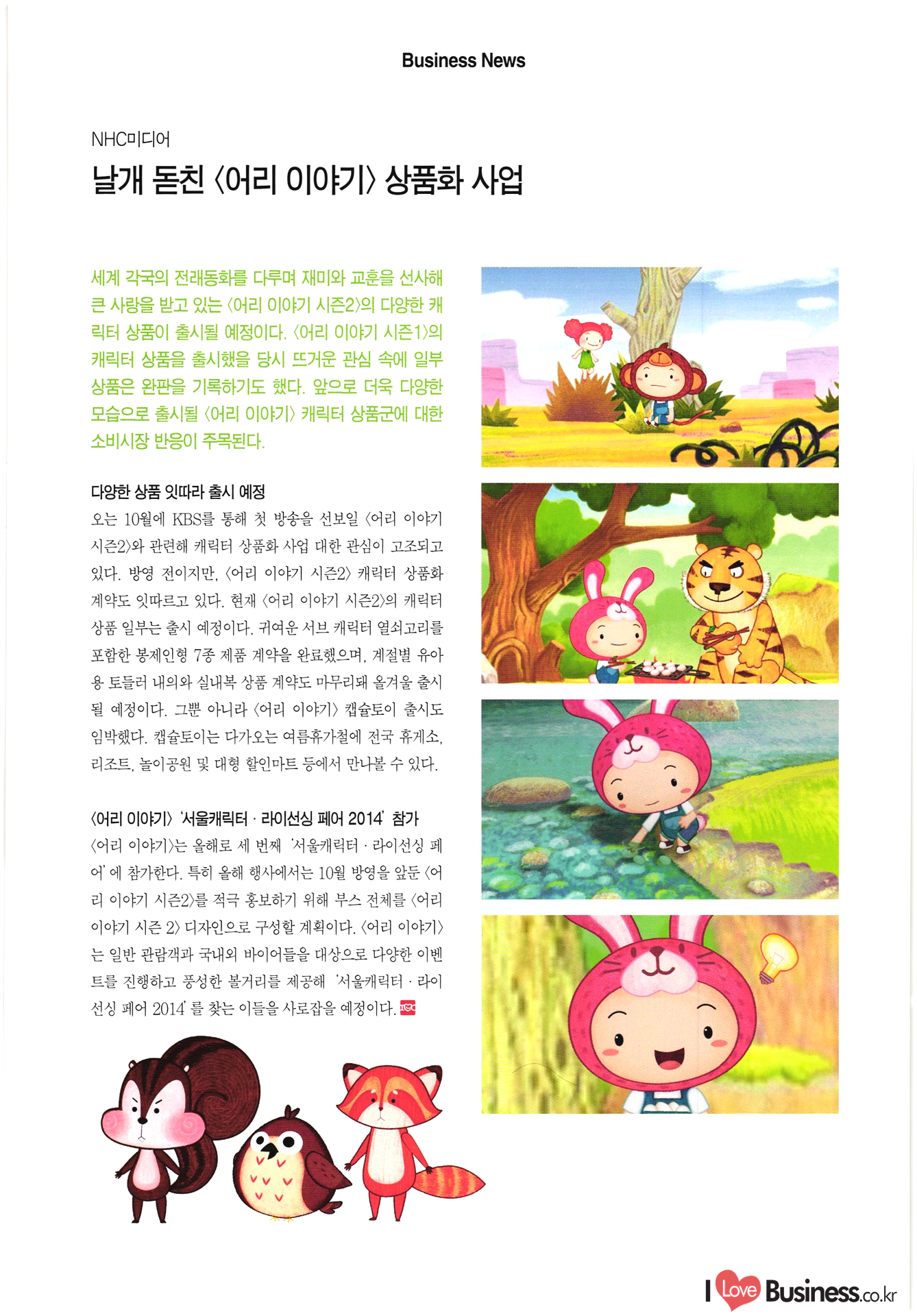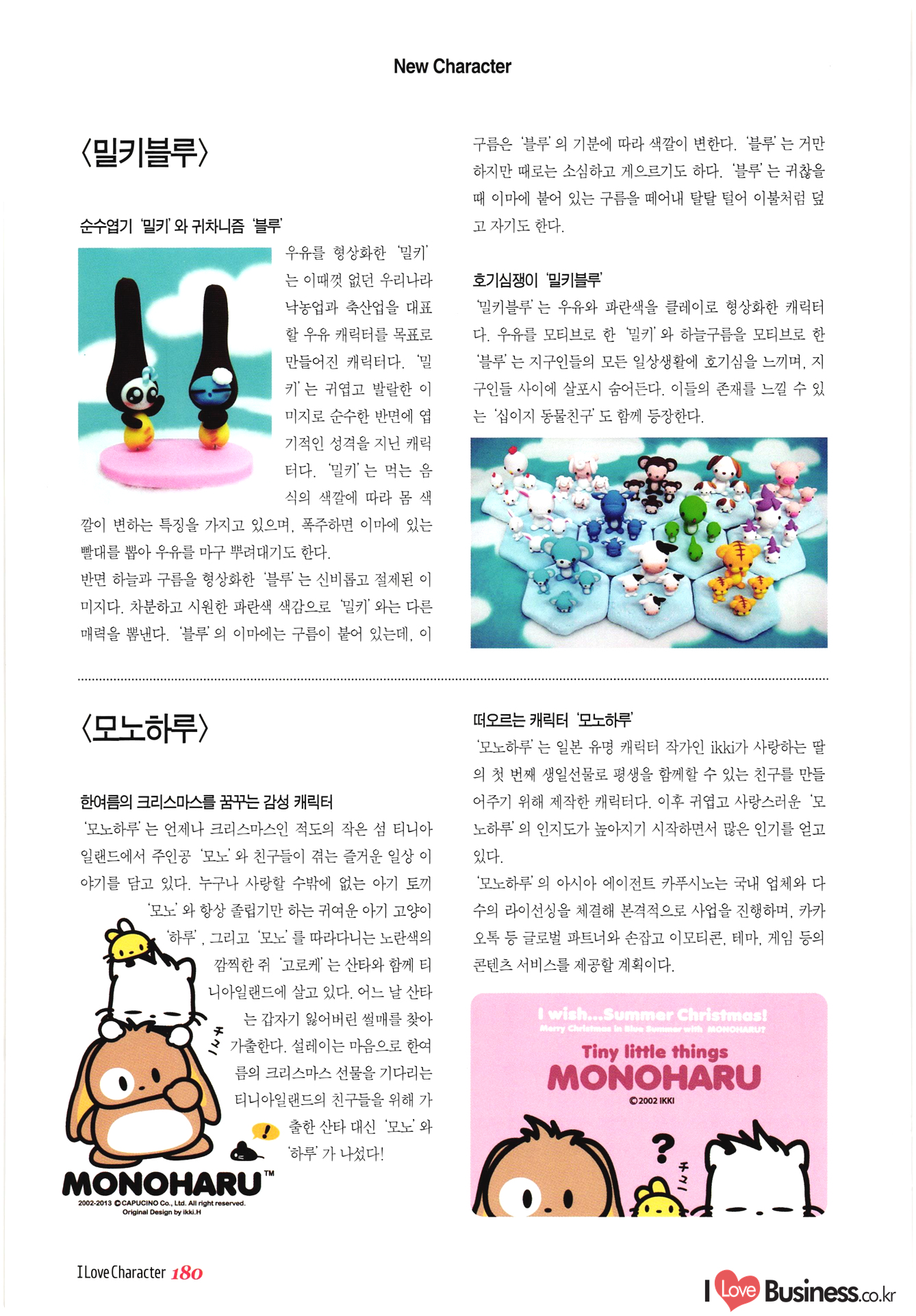 〈베어브릭〉·〈몬스터 헌터〉, 유니클로와 캐릭터 콜라보레이션 UT 출시 124 권단 칼럼 뮤지컬과 저작권 128 2014 애니메이션 · 캐릭터 연합 워크숍 | 애니메이션 제작자와 라이선시 간 상생협력 방안 공유 130 문지애 칼럼 중국 애니메이션 영화시장에 주목하라!! 132 이정훈 칼럼 서울랜드 캐릭터 모니터 134 토리로 꿈꾸는 작은 소녀 〈토리양〉 136 미미월드이동연구소 '곰디' , 아동인권 홍보대사 되다.