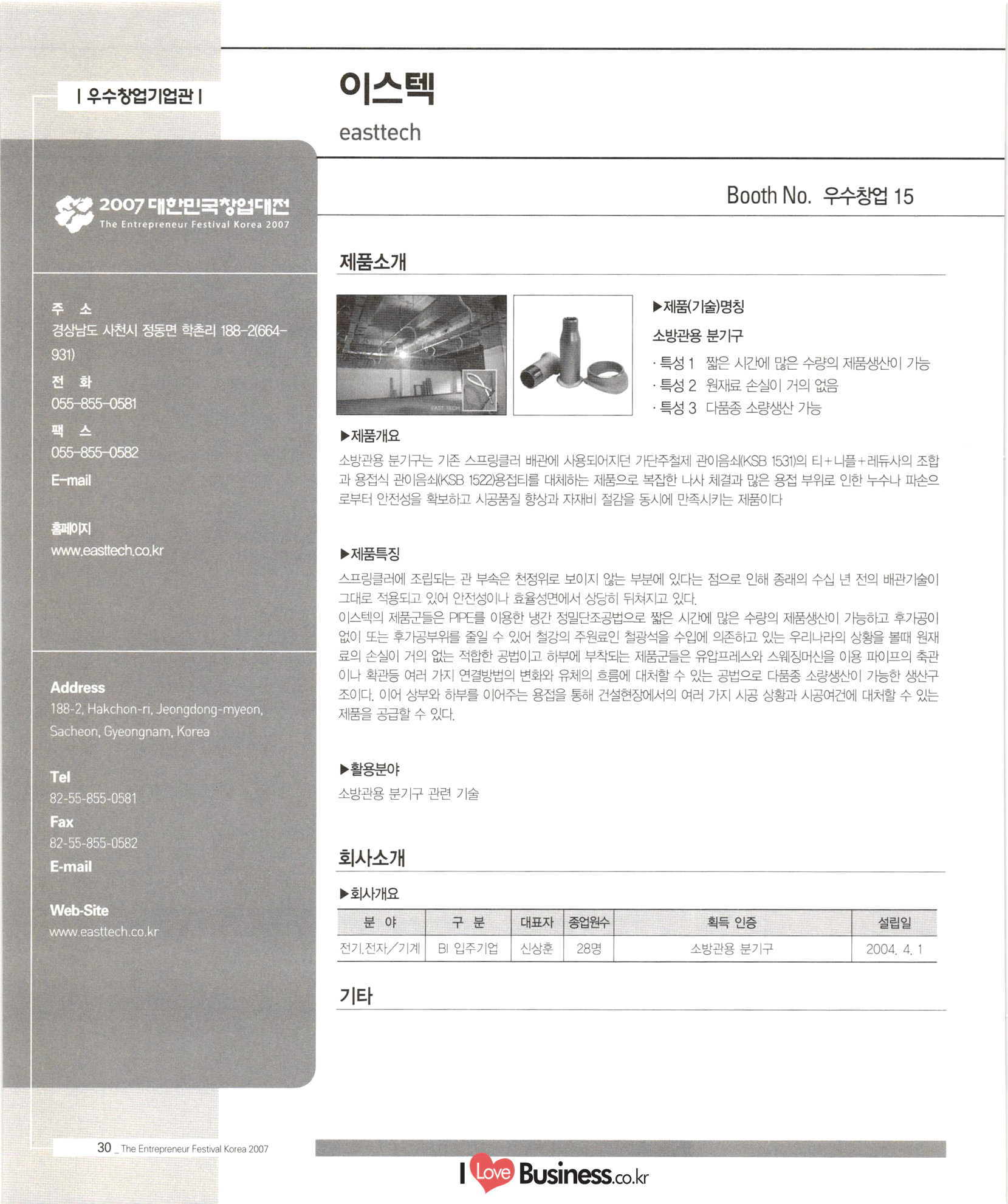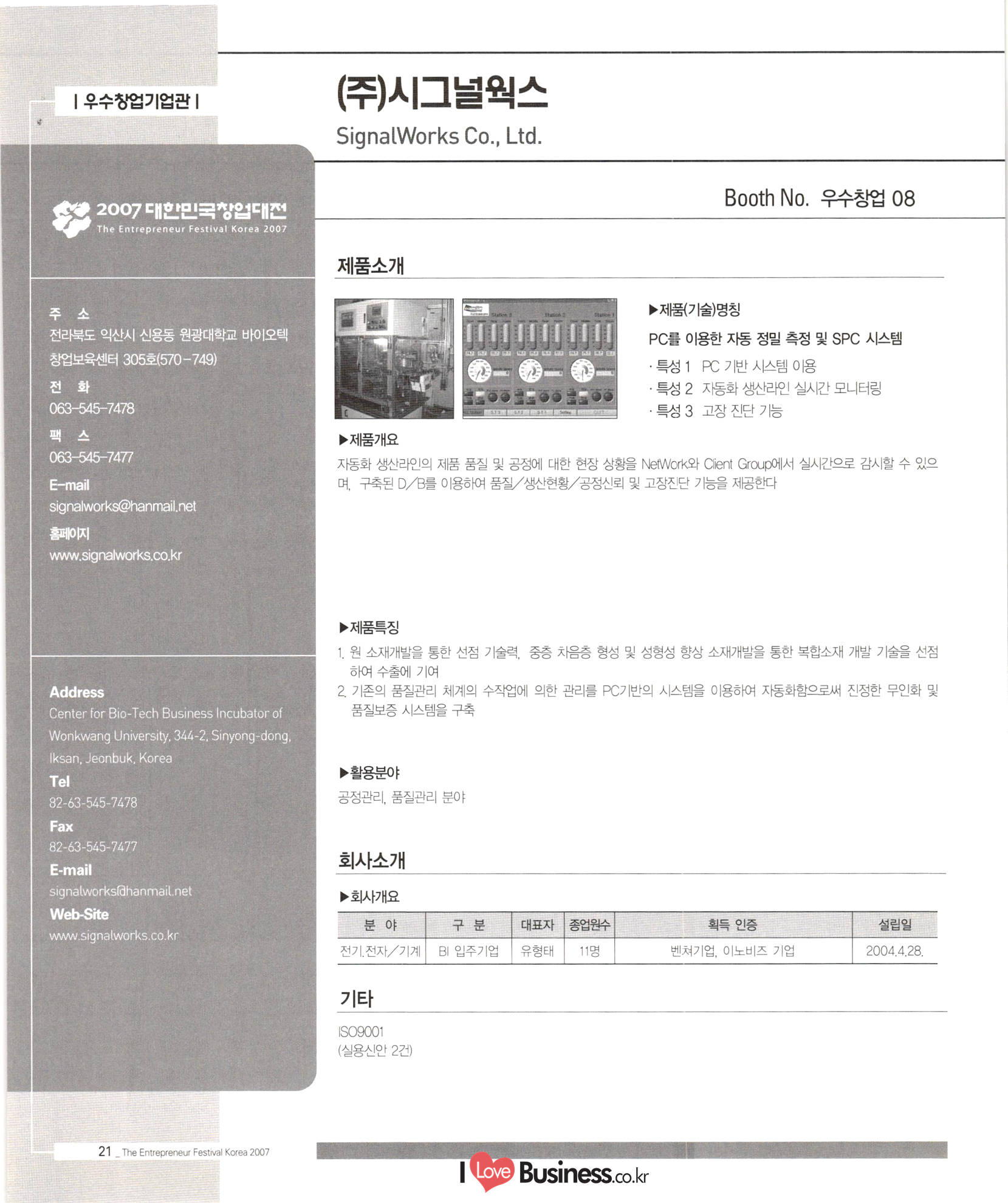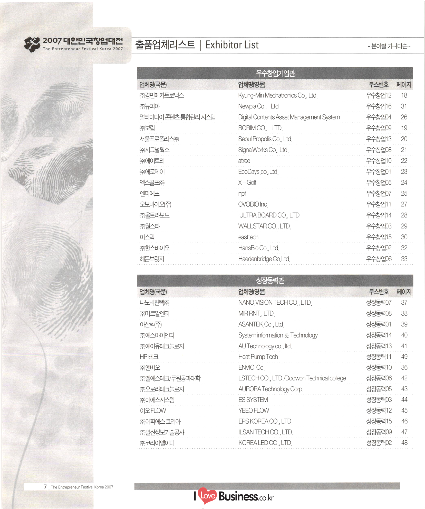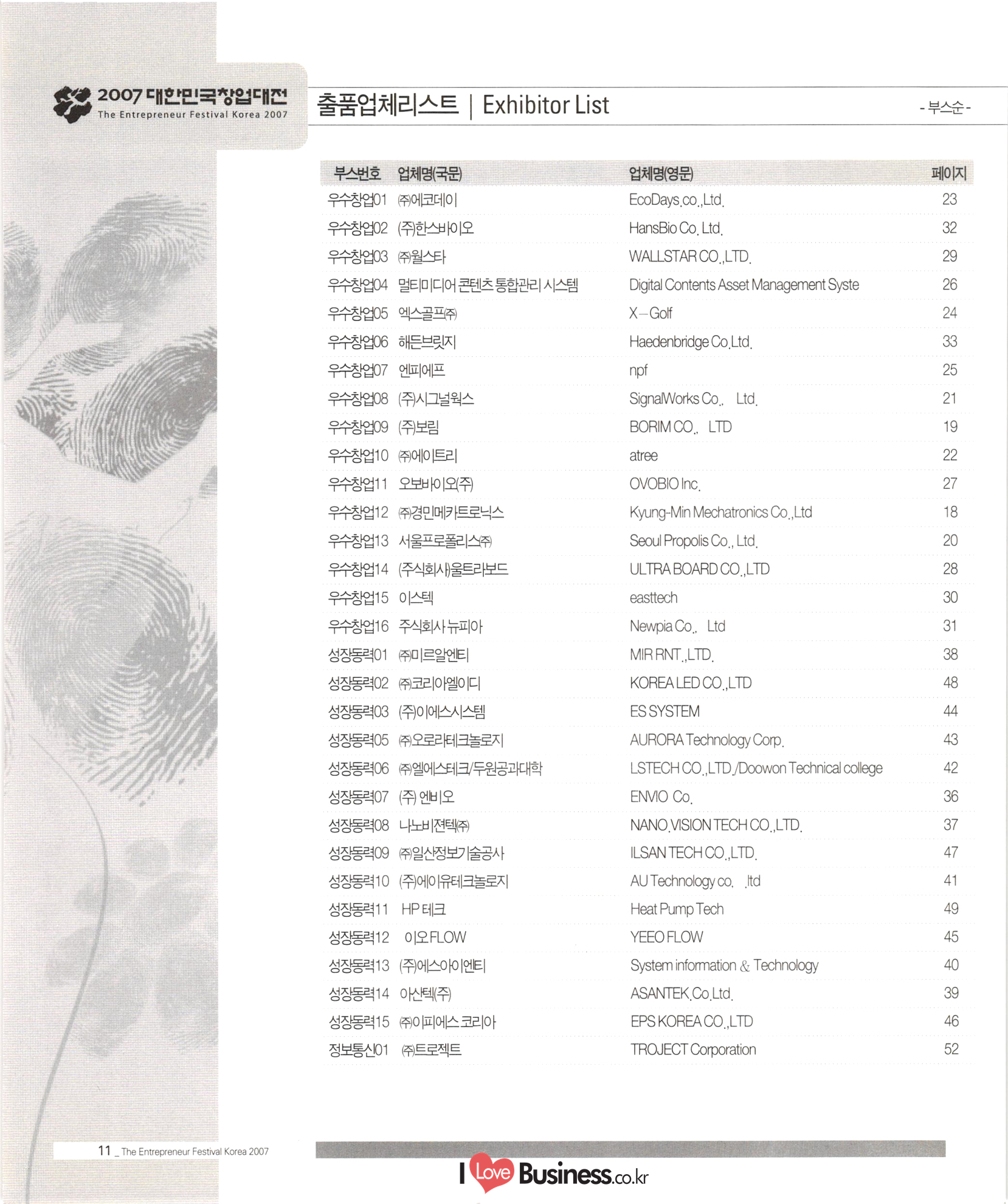 부스번호 업체명(국문) 우수창업01 주)에코데이 우수창업02 (주)한스바이오 우수창업03 (주)월스타 우수창업04 멀티미디어콘텐츠 통합관리시스템 우수창업05 엑스골프주 우수창업06 해든브릿지 우수창업07 엔피에프 우수창업08 (주)시그널웍스 우수창업09 (주)보림 우수창업10 (주)에이트리 우수창업11 오보바이오(주) 우수창업12 주경민메카트로닉스 우수창업13 서울프로폴리스주) 우수창업14 (주식회사)울트라보드 우수창업15 이스텍 우수창업16 주식회사피아 성장동력01 주미르알엔티 성장동력02 (주)코리아엘이디 성장동력03 (주)이에스시스템 성장동력05 (주)오로라테크놀로지 성장동력06 (주)엘에스테크 두원공과대학 성장동력07 (주)엔비오 성장동력08 나노비젼텍주) 성장동력09 (주)일산정보기술공사 성장동력10 (주)에이유테크놀로지 성장동력11 HP 테크 성장동력12 이오FLOW 성장동력13 (주)에스아이엔티 성장동력14 아산텍(주) 성장동력15 주이피에스코리아 정보통신01 (주)트로젝트