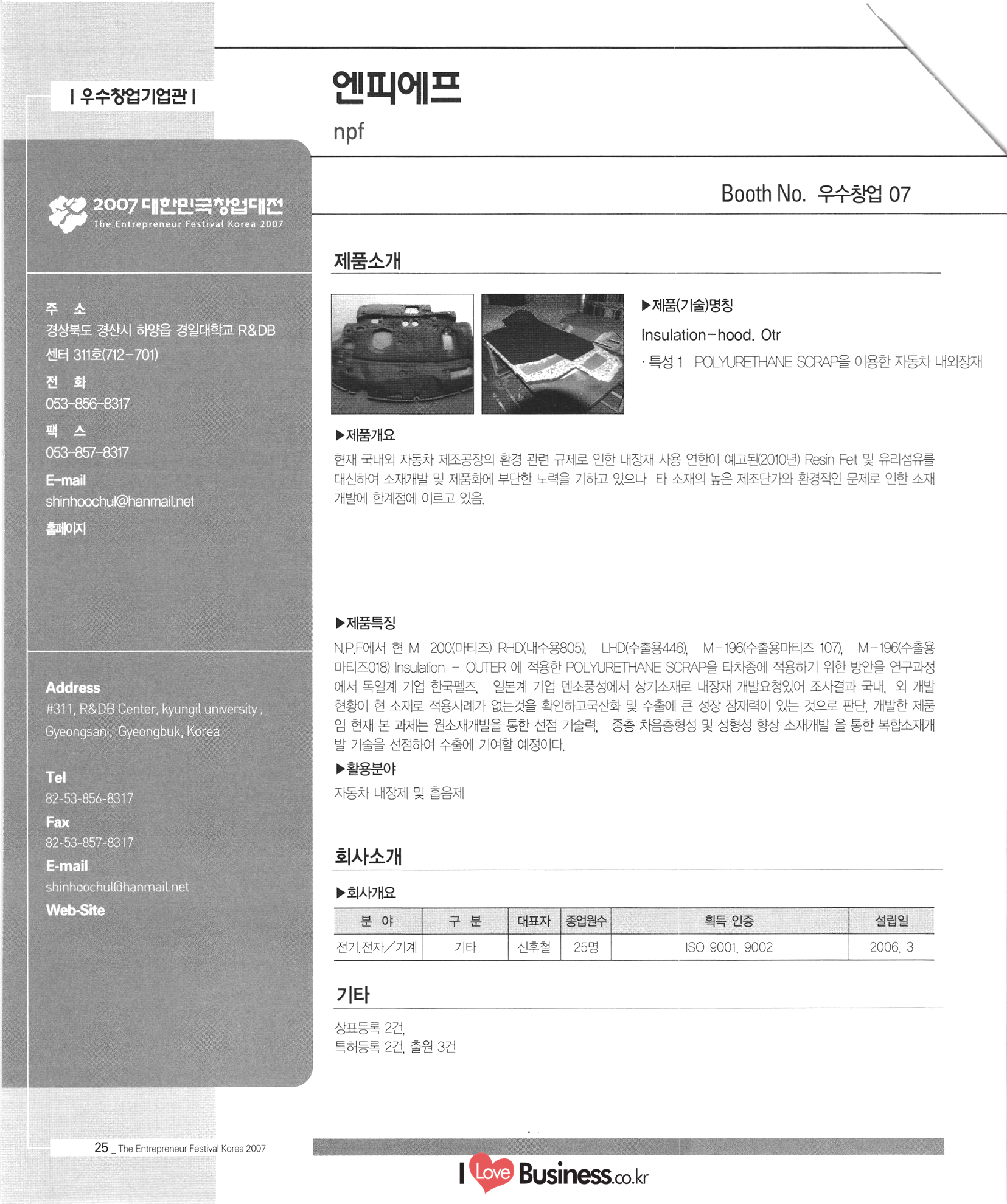 우수창업기업관 업체명(영문) Kyung-Min Mechatronics Co., Ltd. Newpia Co., Ltd Digital Contents Asset Management System BORIM CO., LTD. Seoul Propolis Co., Ltd. SignalWorks Co., Ltd. atree EcoDays.co.,Ltd. X-Golf npf OVOBIO Inc. ULTRA BOARD CO., LTD WALLSTAR CO., LTD. easttech HansBio Co., Ltd. Haedenbridge Co.Ltd.