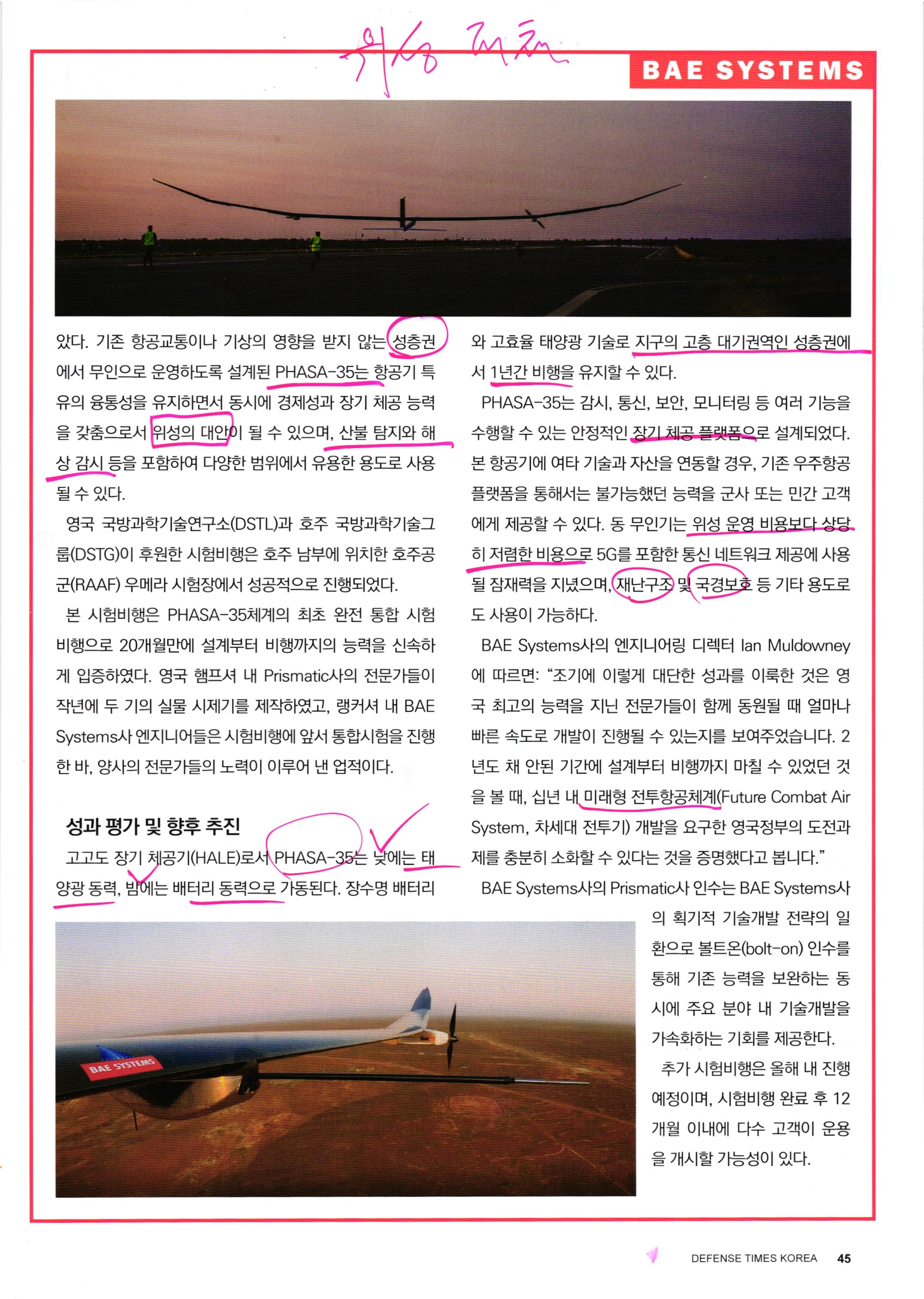 특히 태양광동력 무인항공기의 장시간 비행능력은 중요. 군사위성을 대체하거나 보완하는 기능 가능하므로..