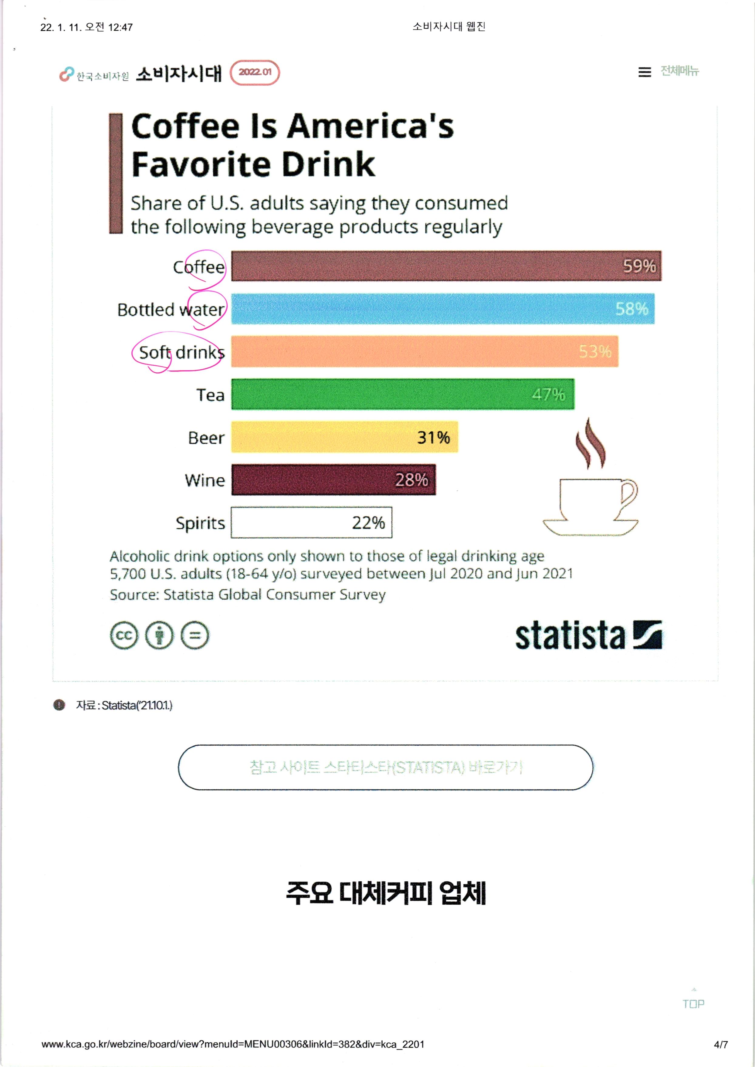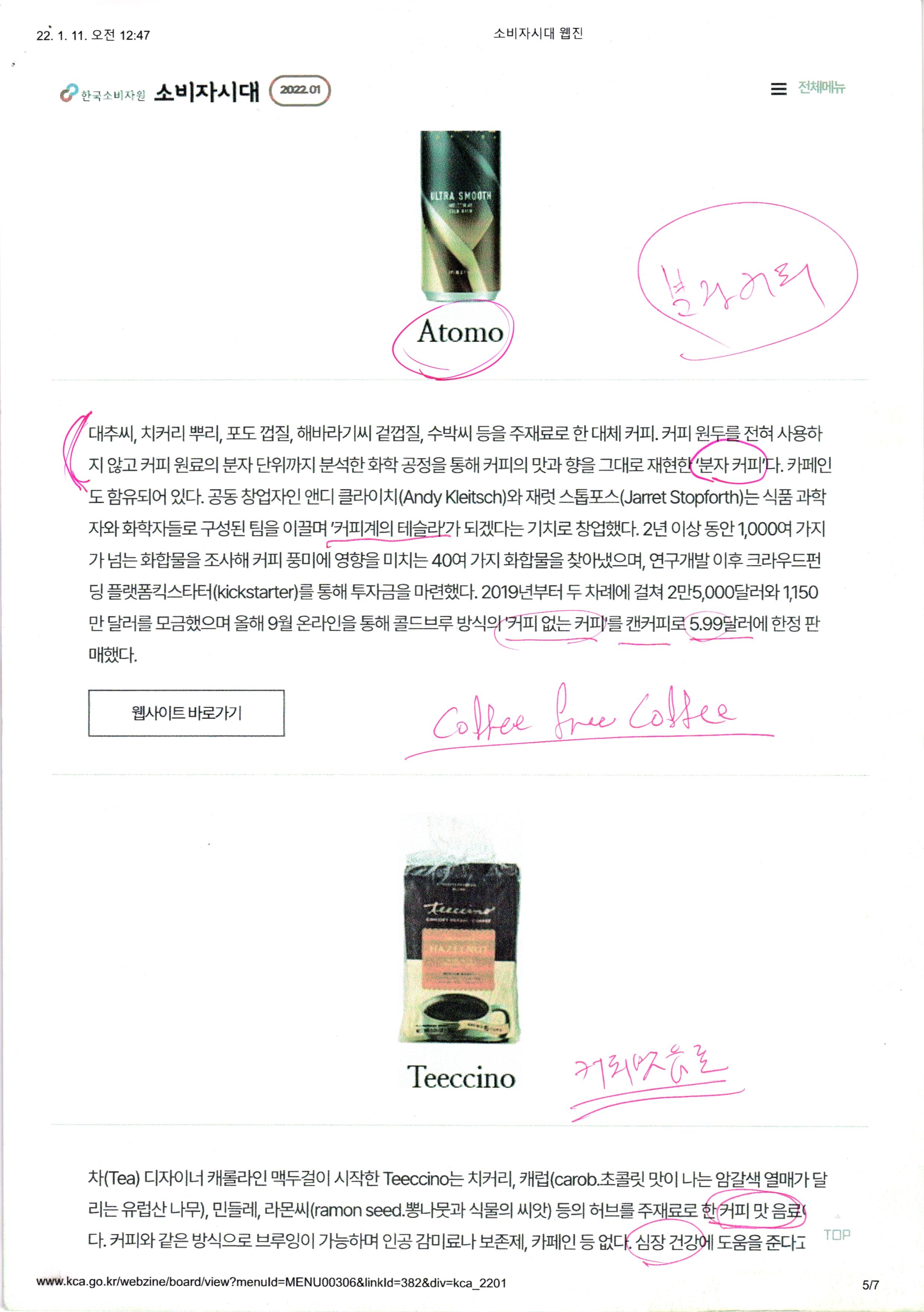 커피빈이 없는 커피(Coffee free Coffee). 즉, 커피의 향과 맛은 같지만 씨앗이나 허브 등으로 만든 ‘대체 커피’에 대한 관심이 높아지고 있다. 채식주의자들이 늘며 버거킹의 ‘임파서블 버거(대체육 버거) 등 식물성 재료로 만든 대체육이나 대체해산물, 대체우유 시장이 꾸준히 성장해온 것처럼 ‘대체 커피’ 시장이 커지고 있다. 스타벅스의 본고장인 시애틀에 창업한 대체 커피 스타트업 기업 애토모 커피(Atomo Coffee)는 2019년에 브랜드 론칭 후 올해 9월 온라인으로 콜드브루 대체 커피를 제한적 판매했으며, 2022년 소매 판매 정식 런칭을 준비 중이다. 애토모 커피는 대체 커피에 대한 소비자의 인식과 기존 커피 시장 장벽을 넘기 위한 실험으로 워싱턴대학교 학생들을 대상으로 스타벅스 커피와 대체 커피인 애토모 커피의 블라인드 테스트를 실시, 70%라는 압승을 거두며 본격적으로 전통적인 커피 업계에 도전장을 냈다. 블라인드 테스트 참가 학생들은 “아토모 커피가 일반 커피보다 부드럽고 신선하며 탄 맛이 덜한 것 같다”는 의견을 내 대체 커피에 대한 관심을 증폭시켰다.