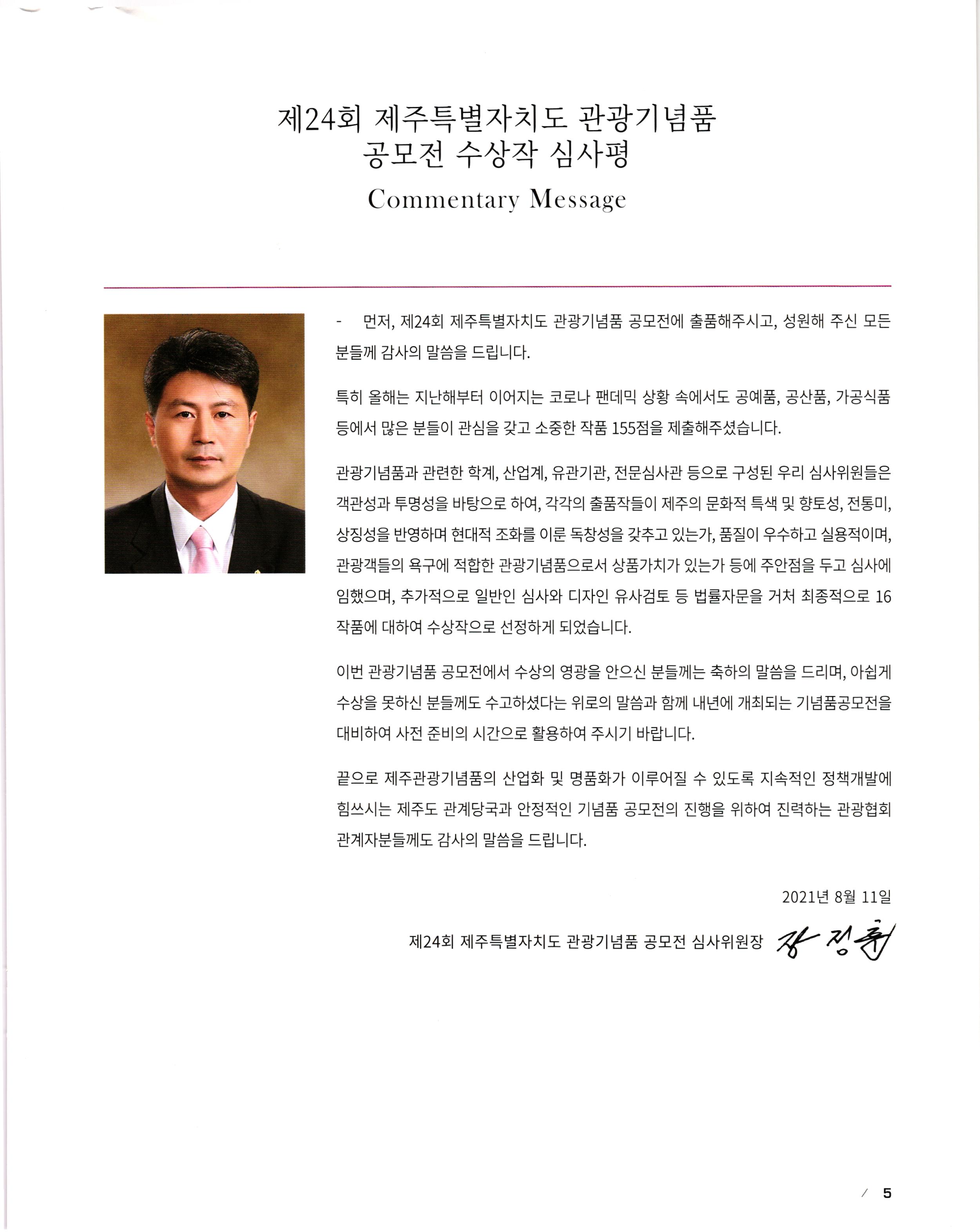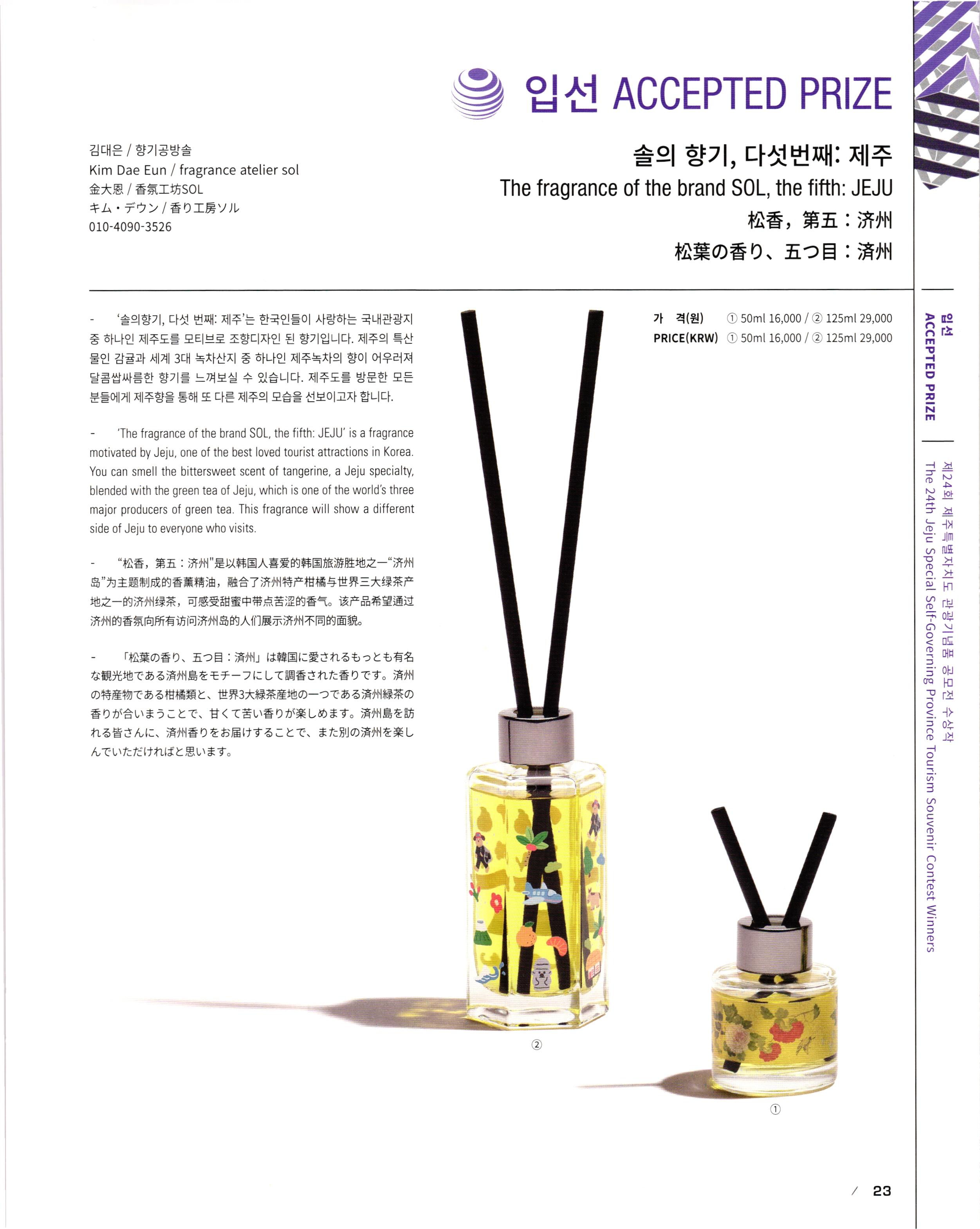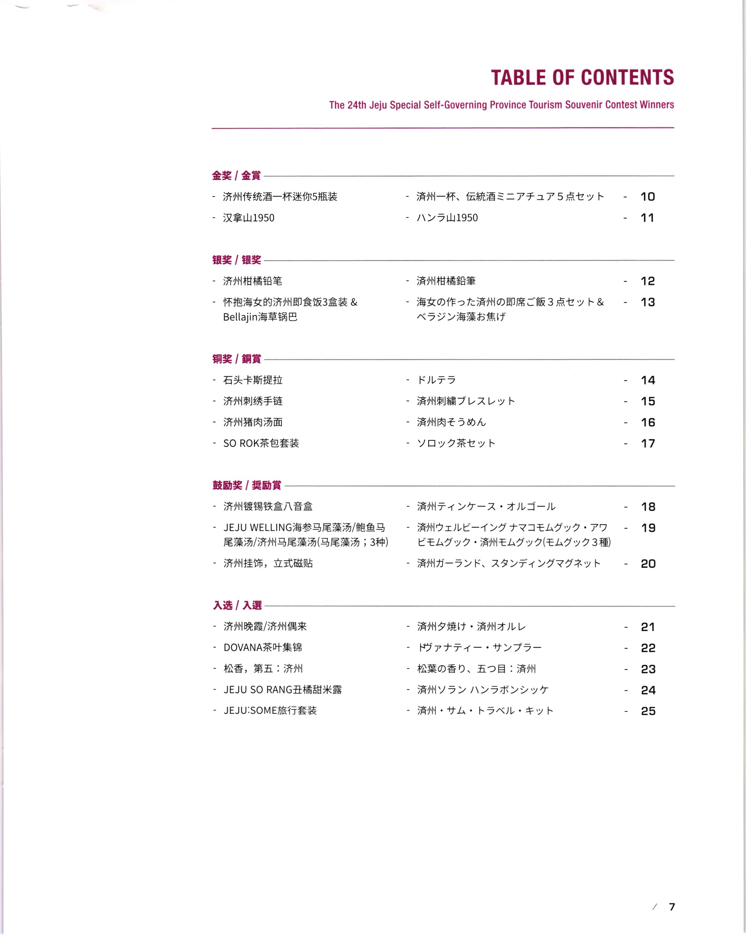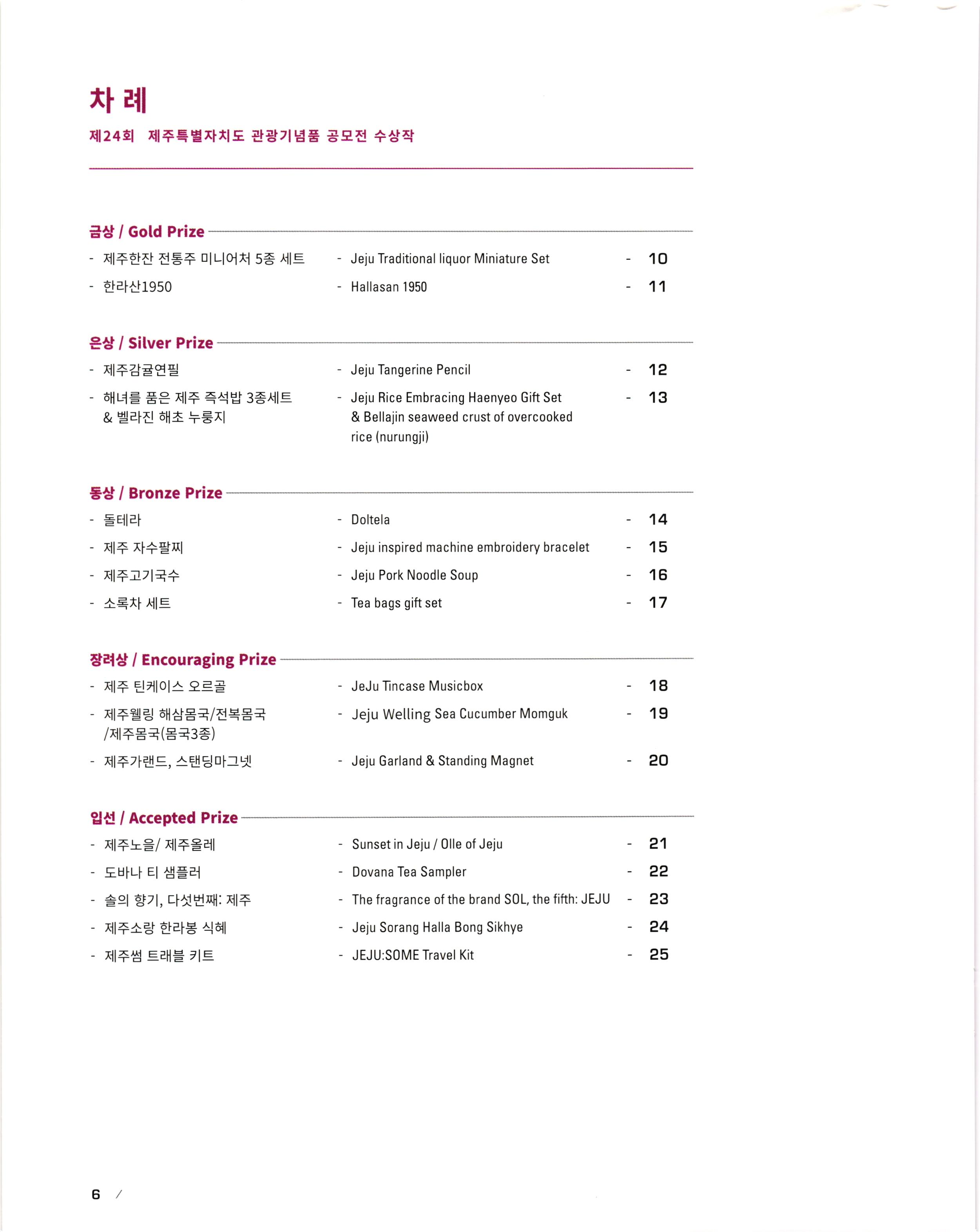 차례 제24회 제주특별자치도 관광기념품 공모전 수상작 금상 / Gold Prize: - 제주한잔 전통주 미니어처 5종 세트 - Jeju Traditional liquor Miniature Set - 10 - 11 - 한라산1950 - Hallasan 1950 은상 / Silver Prize: - 제주감귤연필 - Jeju Tangerine Pencil Jeju Rice Embracing Haenyeo Gift Set & Bellajin seaweed crust of overcooked rice (nurungji) - 12 - 13 - 해녀를 품은 제주 즉석밥 3종세트 & 벨라진 해초 누룽지 - Doltela - 14 동상 / Bronze Prize - 돌테라 - 제주 자수팔찌 - 제주고기국수 - Jeju inspired machine embroidery bracelet - Jeju Pork Noodle Soup - Tea bags gift set - 소록차 세트 장려상 / Encouraging Prize - 제주 틴케이스 오르골 - 제주웰링 해삼몸국/전복몸국 /제주몸국(몸국3종) - 제주가랜드, 스탠딩마그넷 - Jeju Tincase Musicbox - Jeju Welling Sea Cucumber Momguk - Jeju Garland & Standing Magnet amanaaaaaaoraraneo ana 입선 / Accepted Prize - 제주노을/ 제주올레 - 도바나 티 샘플러 - 솔의 향기, 다섯번째: 제주 - 제주소랑 한라봉 식혜 - Sunset in Jeju / Olle of Jeju - Dovana Tea Sampler - The fragrance of the brand SOL, the fifth: JEJU - Jeju Sorang Halla Bong Sikhye - JEJU:SOME Travel Kit - 23 - 제주썸 트래블 키트 6 /