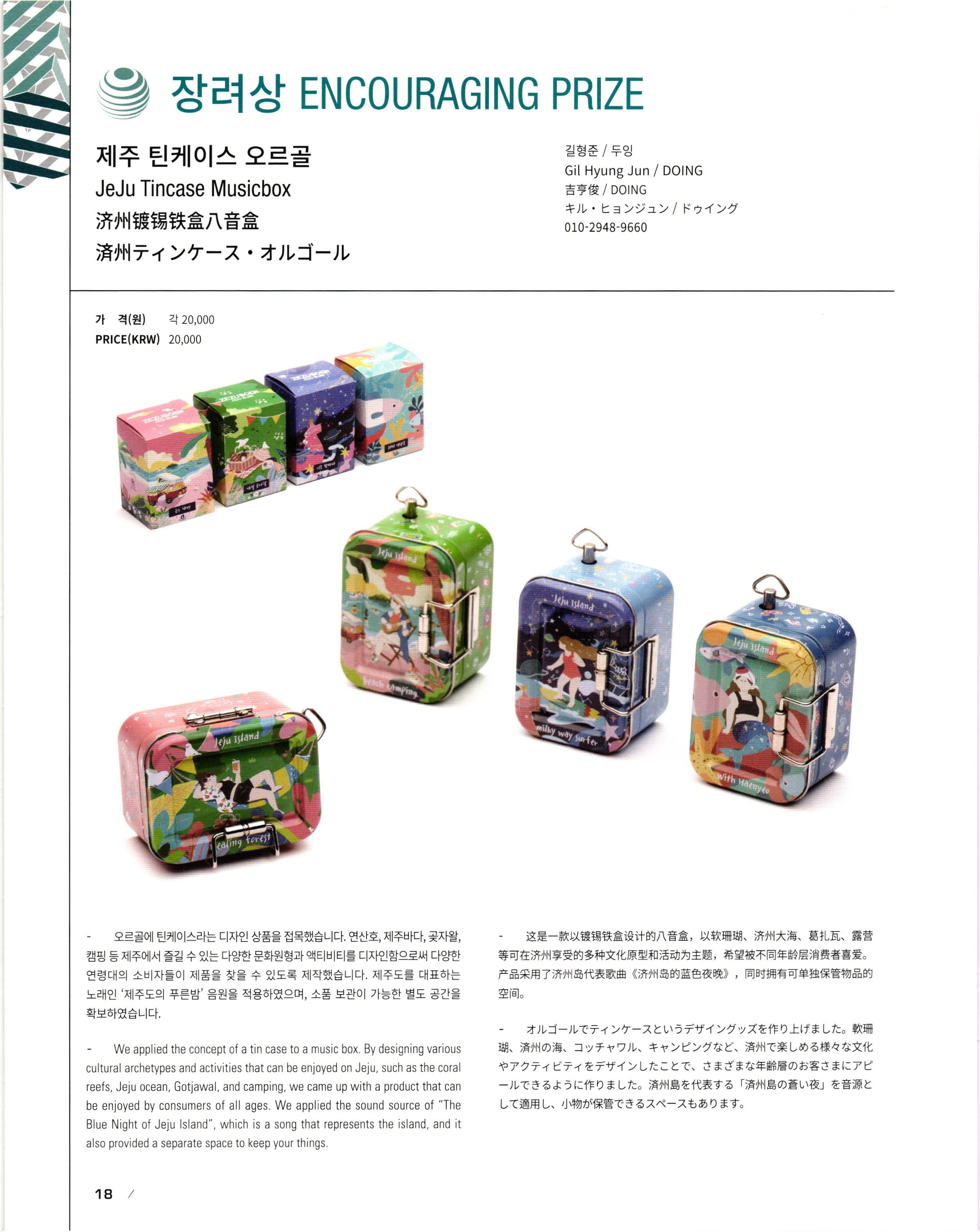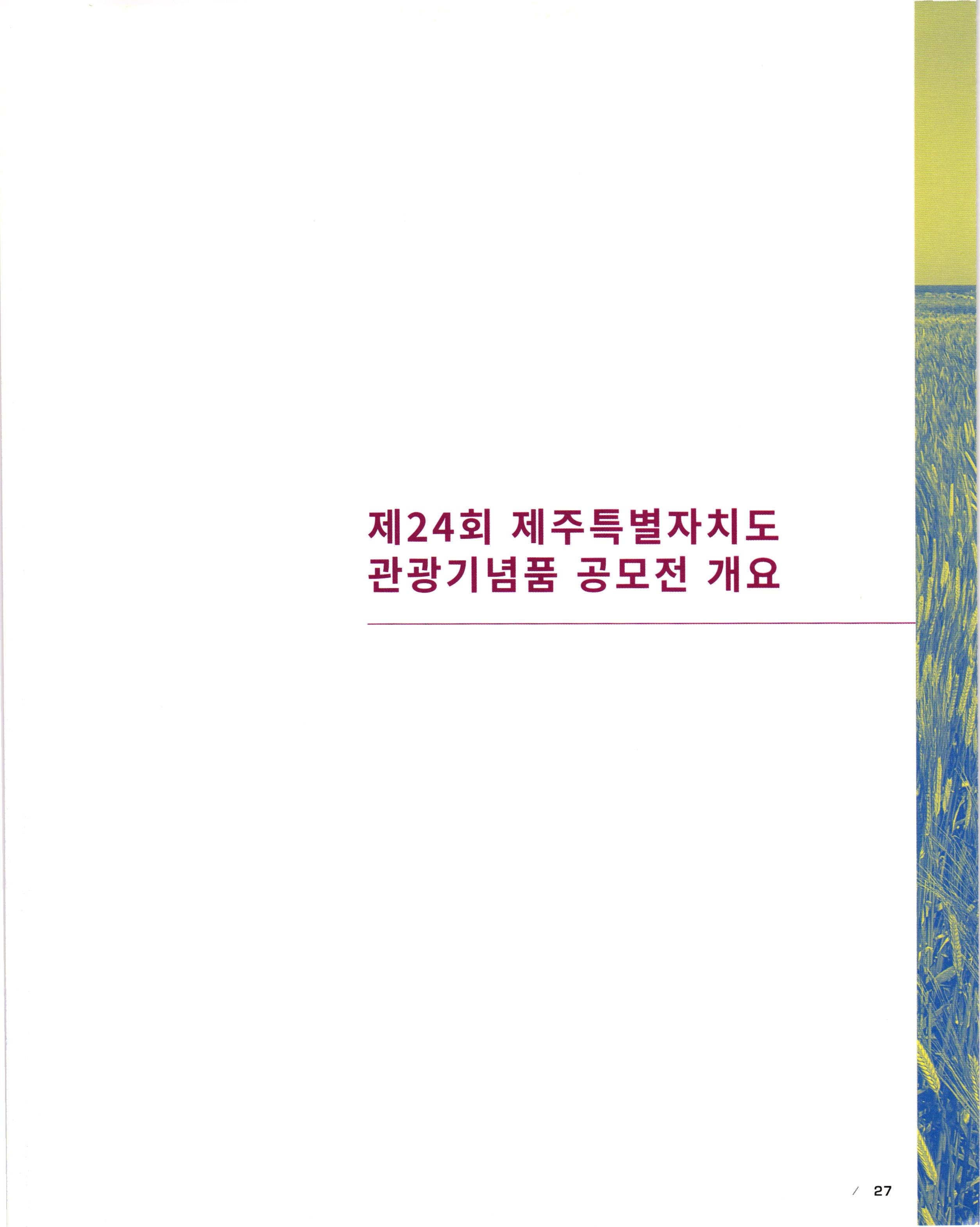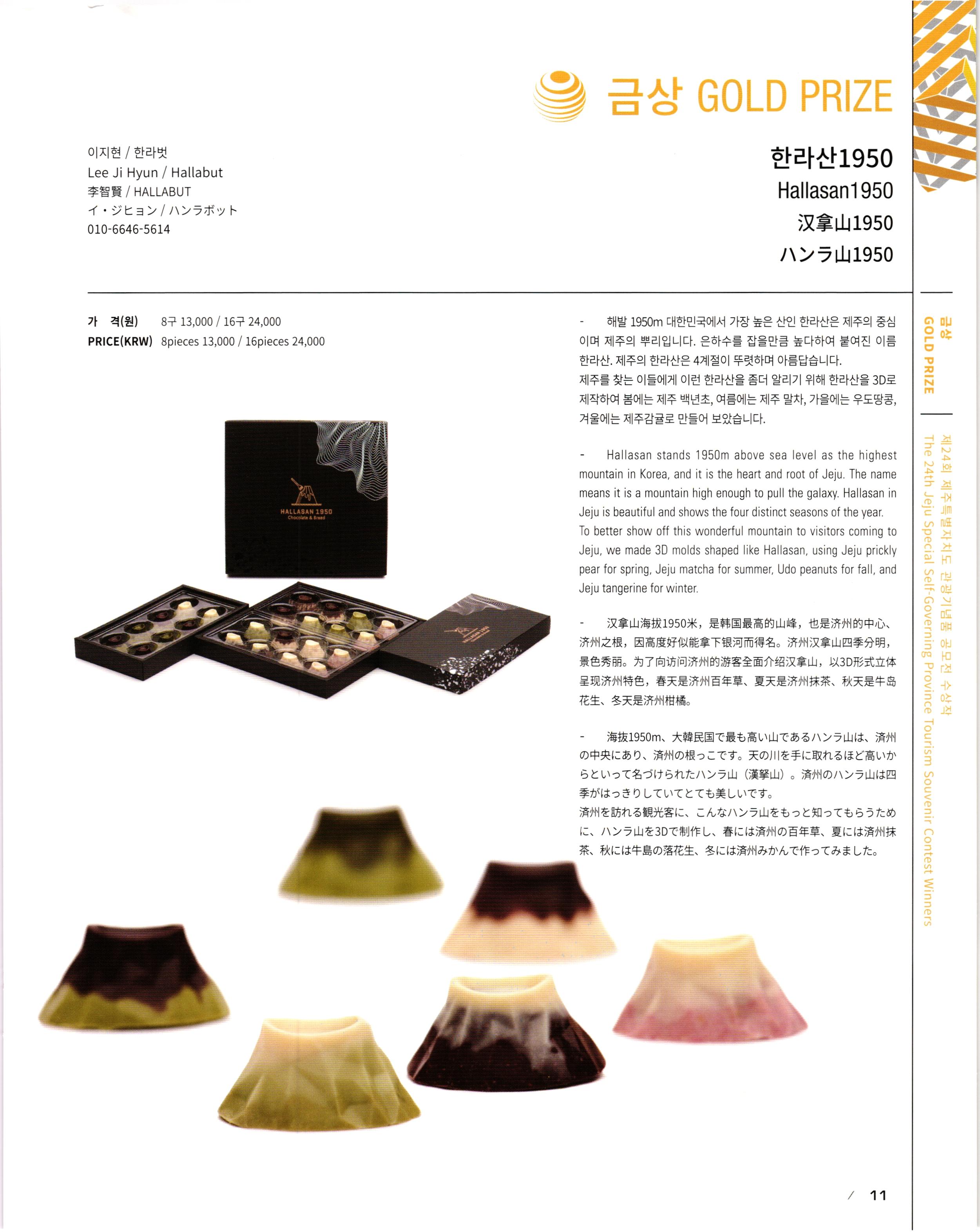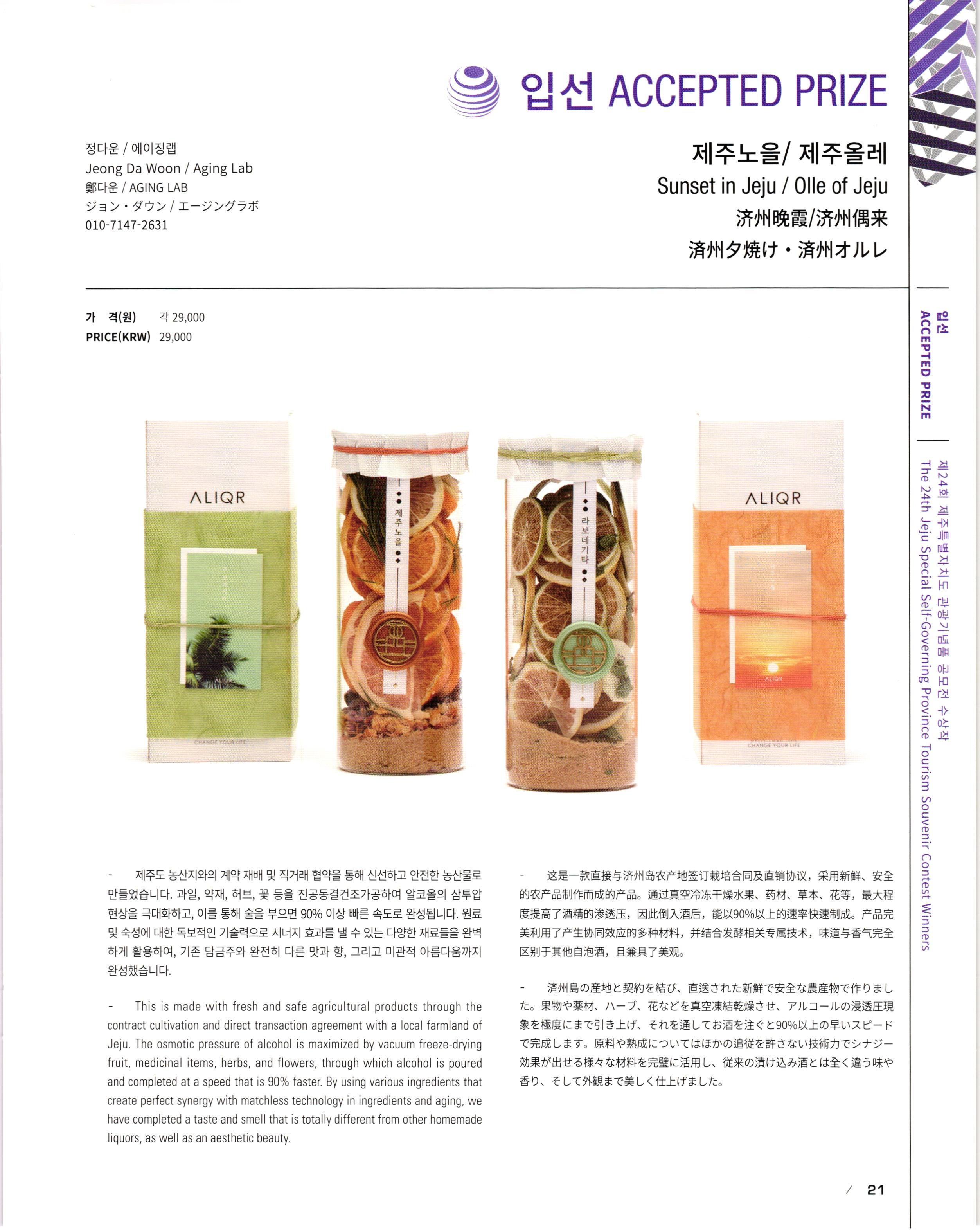 차례 제24회 제주특별자치도 관광기념품 공모전 수상작 금상 / Gold Prize: - 제주한잔 전통주 미니어처 5종 세트 - Jeju Traditional liquor Miniature Set - 10 - 11 - 한라산1950 - Hallasan 1950 은상 / Silver Prize: - 제주감귤연필 - Jeju Tangerine Pencil Jeju Rice Embracing Haenyeo Gift Set & Bellajin seaweed crust of overcooked rice (nurungji) - 12 - 13 - 해녀를 품은 제주 즉석밥 3종세트 & 벨라진 해초 누룽지 - Doltela - 14 동상 / Bronze Prize - 돌테라 - 제주 자수팔찌 - 제주고기국수 - Jeju inspired machine embroidery bracelet - Jeju Pork Noodle Soup - Tea bags gift set - 소록차 세트 장려상 / Encouraging Prize - 제주 틴케이스 오르골 - 제주웰링 해삼몸국/전복몸국 /제주몸국(몸국3종) - 제주가랜드, 스탠딩마그넷 - Jeju Tincase Musicbox - Jeju Welling Sea Cucumber Momguk - Jeju Garland & Standing Magnet amanaaaaaaoraraneo ana 입선 / Accepted Prize - 제주노을/ 제주올레 - 도바나 티 샘플러 - 솔의 향기, 다섯번째: 제주 - 제주소랑 한라봉 식혜 - Sunset in Jeju / Olle of Jeju - Dovana Tea Sampler - The fragrance of the brand SOL, the fifth: JEJU - Jeju Sorang Halla Bong Sikhye - JEJU:SOME Travel Kit - 23 - 제주썸 트래블 키트 6 /