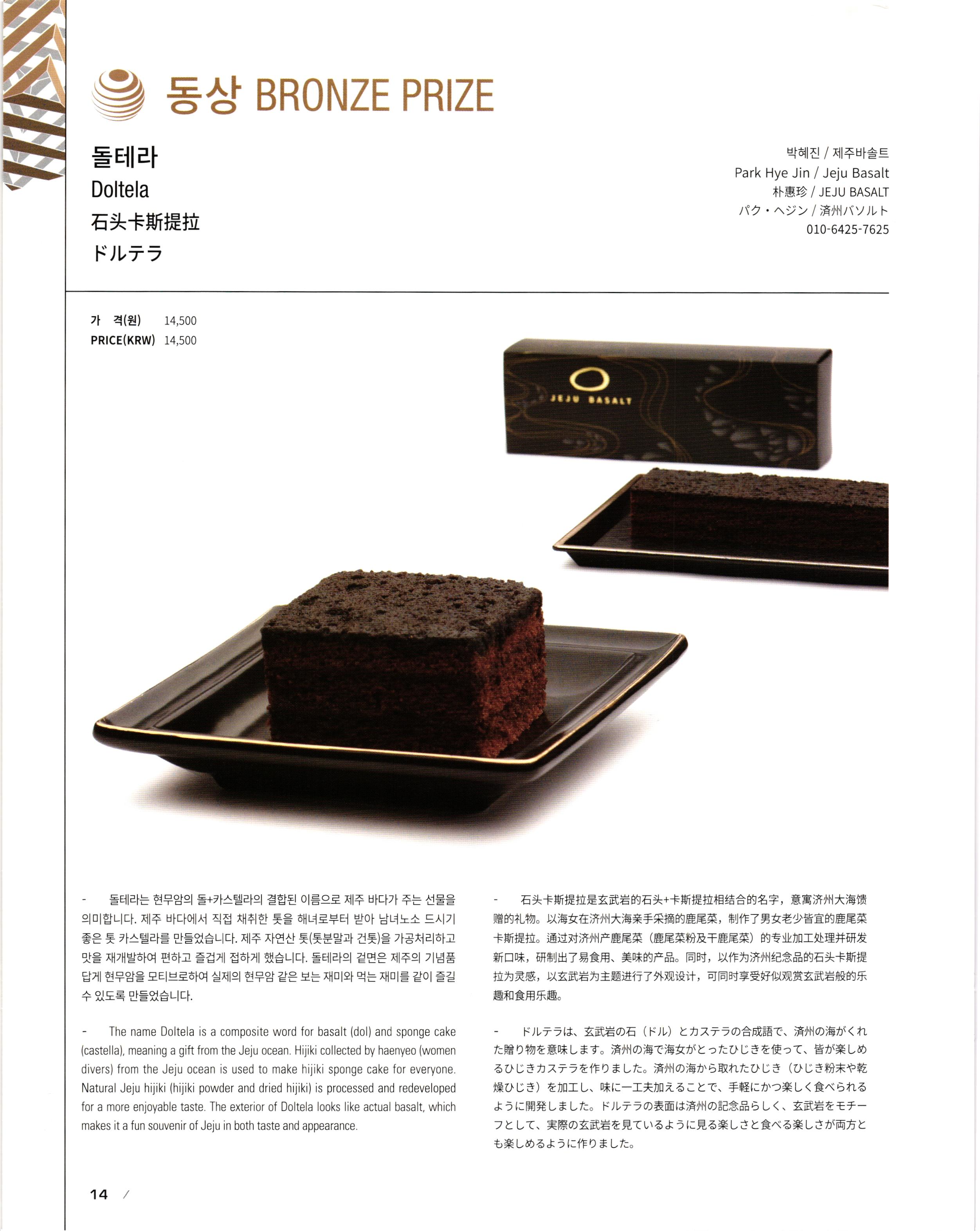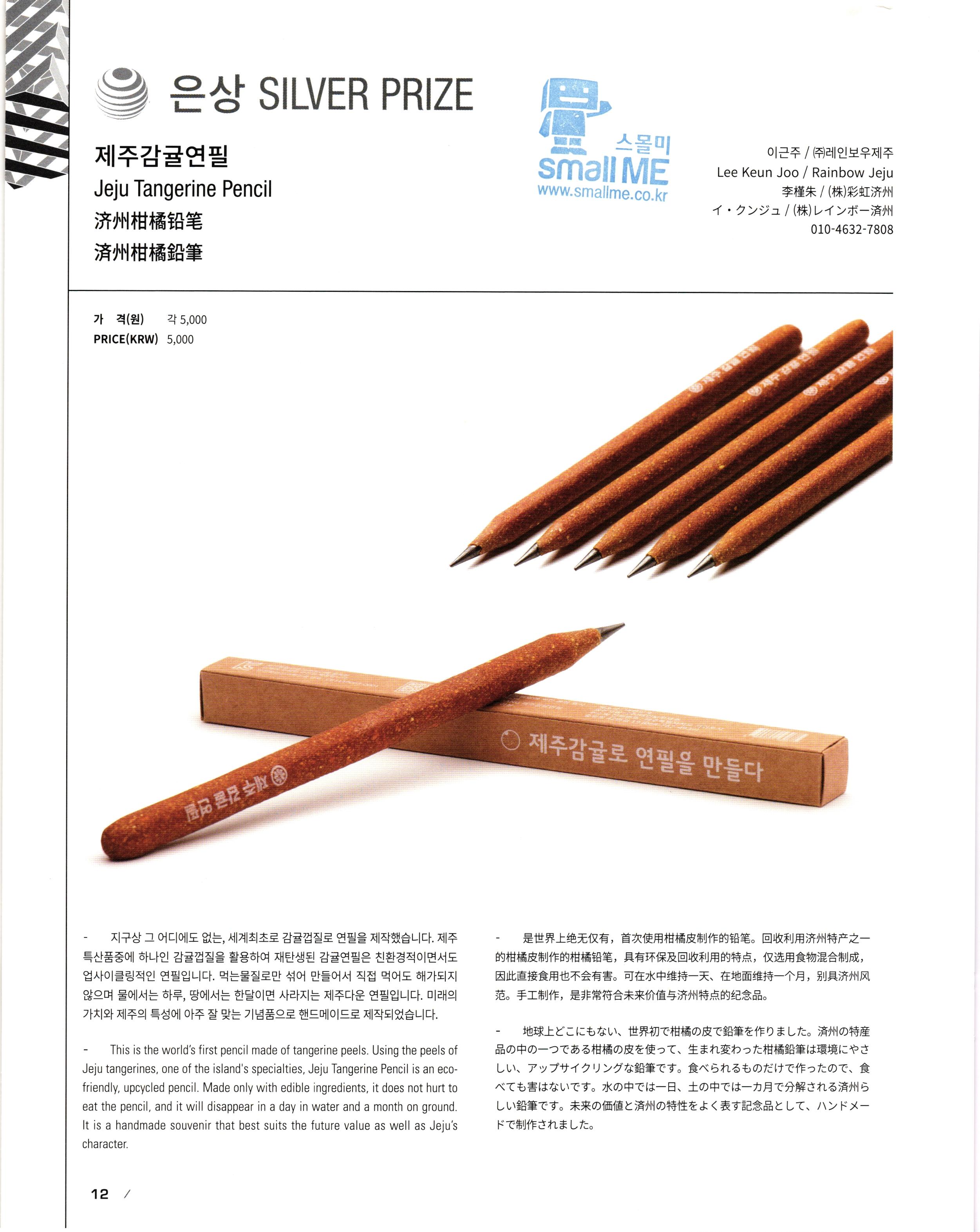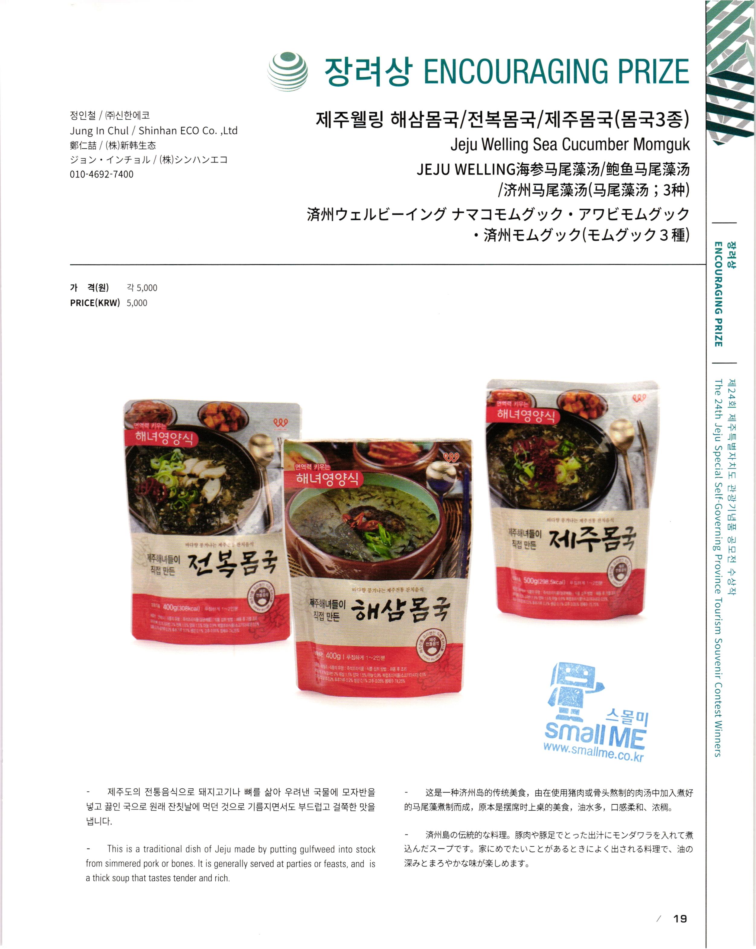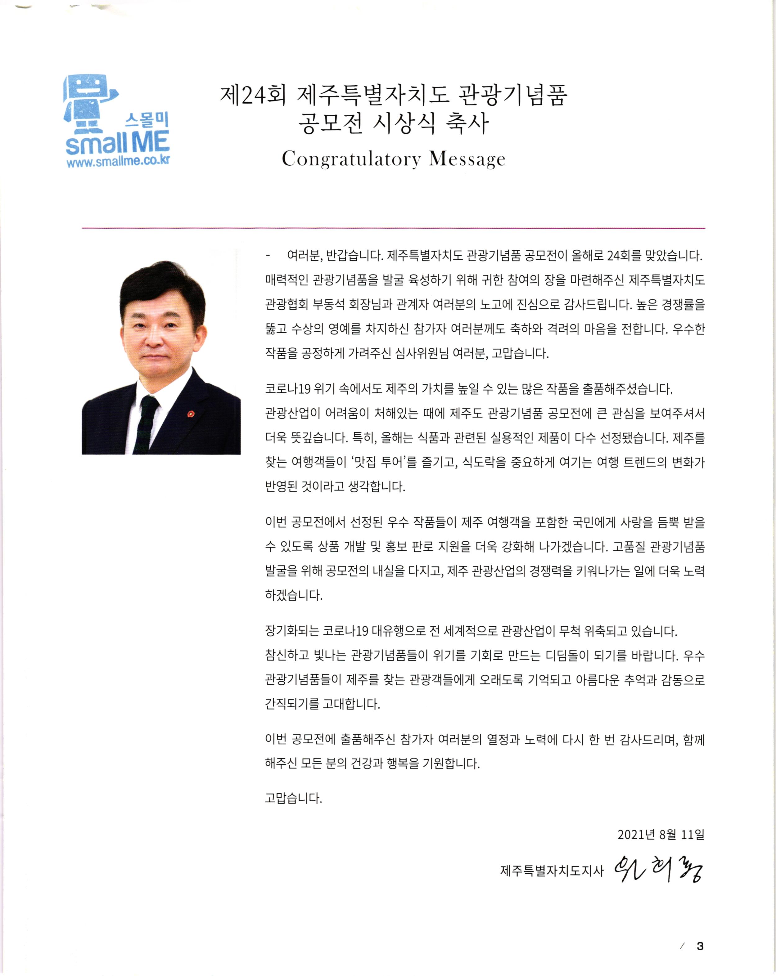 차례 제24회 제주특별자치도 관광기념품 공모전 수상작 금상 / Gold Prize: - 제주한잔 전통주 미니어처 5종 세트 - Jeju Traditional liquor Miniature Set - 10 - 11 - 한라산1950 - Hallasan 1950 은상 / Silver Prize: - 제주감귤연필 - Jeju Tangerine Pencil Jeju Rice Embracing Haenyeo Gift Set & Bellajin seaweed crust of overcooked rice (nurungji) - 12 - 13 - 해녀를 품은 제주 즉석밥 3종세트 & 벨라진 해초 누룽지 - Doltela - 14 동상 / Bronze Prize - 돌테라 - 제주 자수팔찌 - 제주고기국수 - Jeju inspired machine embroidery bracelet - Jeju Pork Noodle Soup - Tea bags gift set - 소록차 세트 장려상 / Encouraging Prize - 제주 틴케이스 오르골 - 제주웰링 해삼몸국/전복몸국 /제주몸국(몸국3종) - 제주가랜드, 스탠딩마그넷 - Jeju Tincase Musicbox - Jeju Welling Sea Cucumber Momguk - Jeju Garland & Standing Magnet amanaaaaaaoraraneo ana 입선 / Accepted Prize - 제주노을/ 제주올레 - 도바나 티 샘플러 - 솔의 향기, 다섯번째: 제주 - 제주소랑 한라봉 식혜 - Sunset in Jeju / Olle of Jeju - Dovana Tea Sampler - The fragrance of the brand SOL, the fifth: JEJU - Jeju Sorang Halla Bong Sikhye - JEJU:SOME Travel Kit - 23 - 제주썸 트래블 키트 6 /