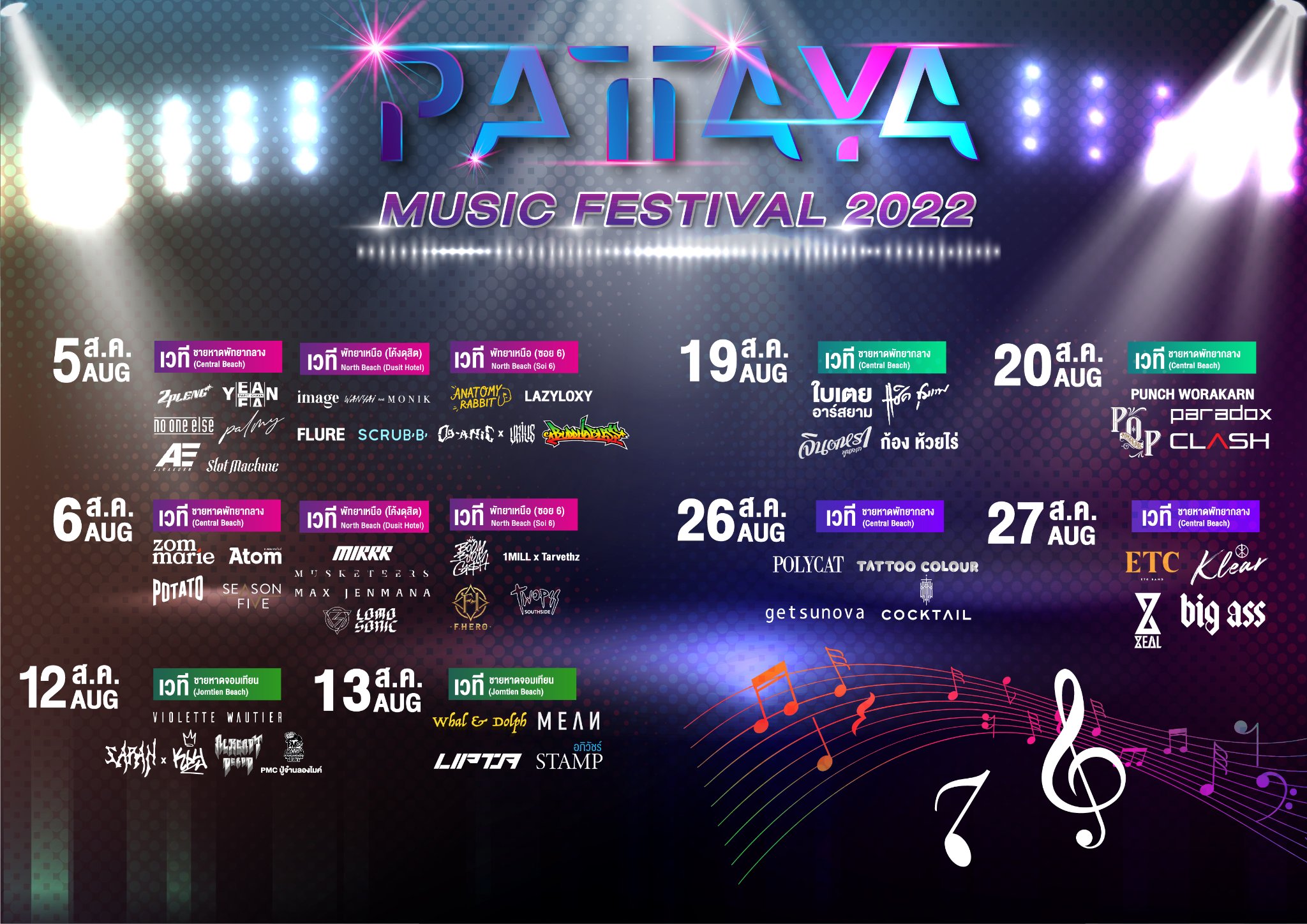 กลับมาอีกครั้งสำหรับงาน “เทศกาลดนตรี PATTAYA MUSIC FESTIVAL 2022” ที่ได้กำหนดการจัด งานใหม่ล่าสุด ให้เต็มอิ่มจุใจตลอดเดือนสิงหาคมกับการจัดงานแบบ 4 สัปดาห์เต็ม พร้อมเข้าชมฟรีกับขบวนศิลปินมากมาย อาทิ LAZYLOXY, CLASH, POTATO, Season Five, Lipta, Tattoo Colour, Getsunova, Cocktail, Klear และ Big ass เป็นต้น พร้อมจัดเต็มกับเวทีการแสดงดังนี้