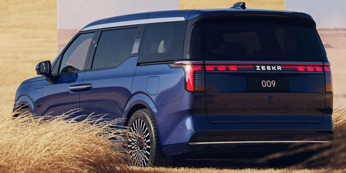 측면에서 009는 멀티 스포크 투톤 알로이 휠, 슬림한 도어 핸들, C-필러 앞의 벨트 라인이 특징입니다. 후면에는 SEA 플랫폼 기반의 전기 MPV가 T자 형태의 엔드 투 엔드 콤비네이션 라이트 구조와 블록 글자 Zeekr 브랜딩이 있습니다.