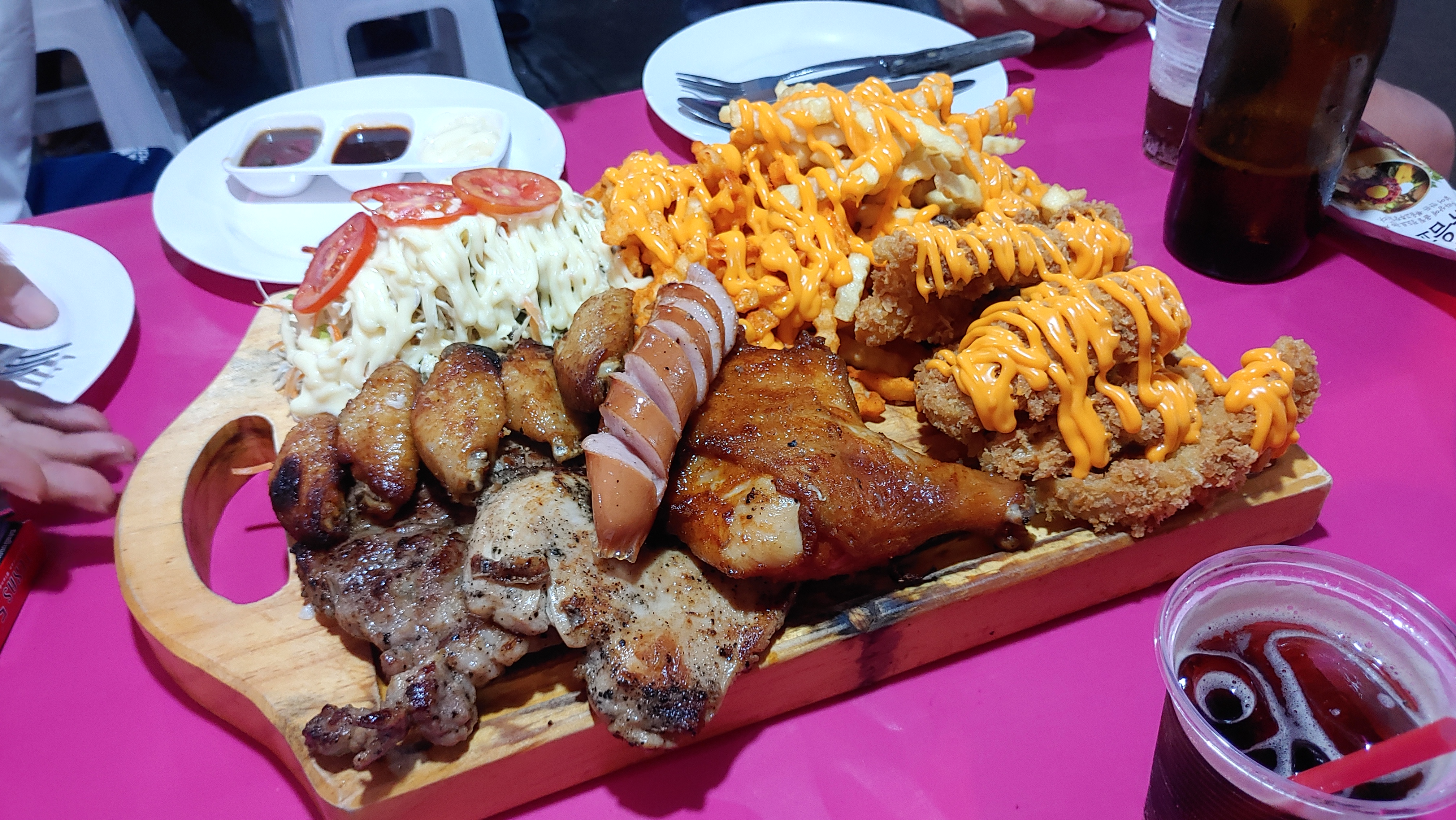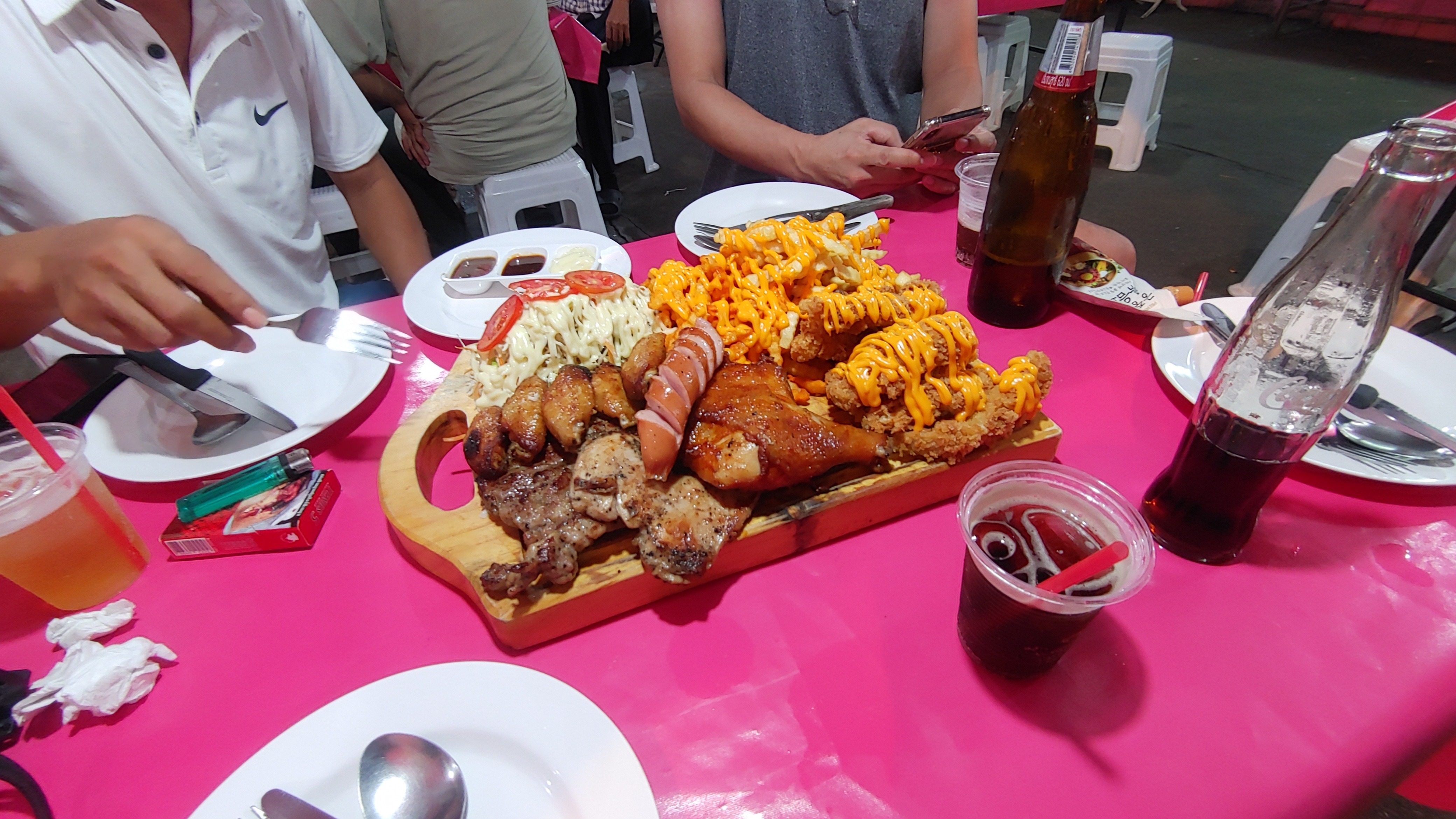 소고기 스테이크와 돼지고기 스테이크 그리고 닭갈비 닭다리 소시지 새우튀김 생선튀김 샐러드 감자튀김 등등