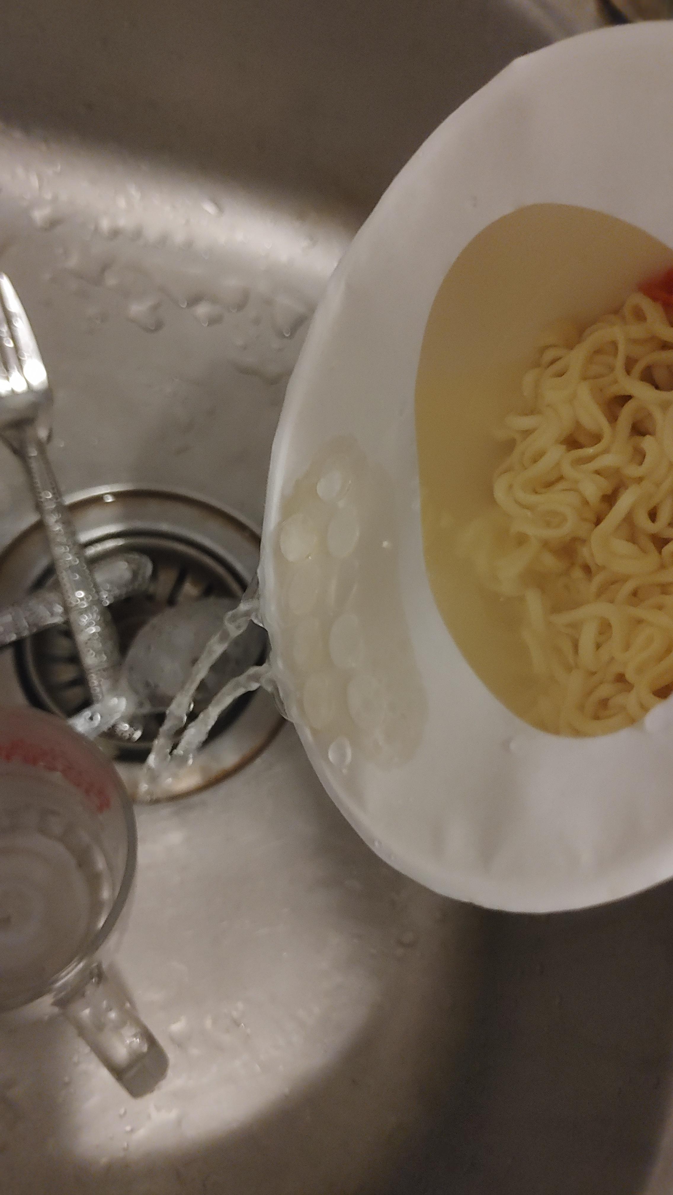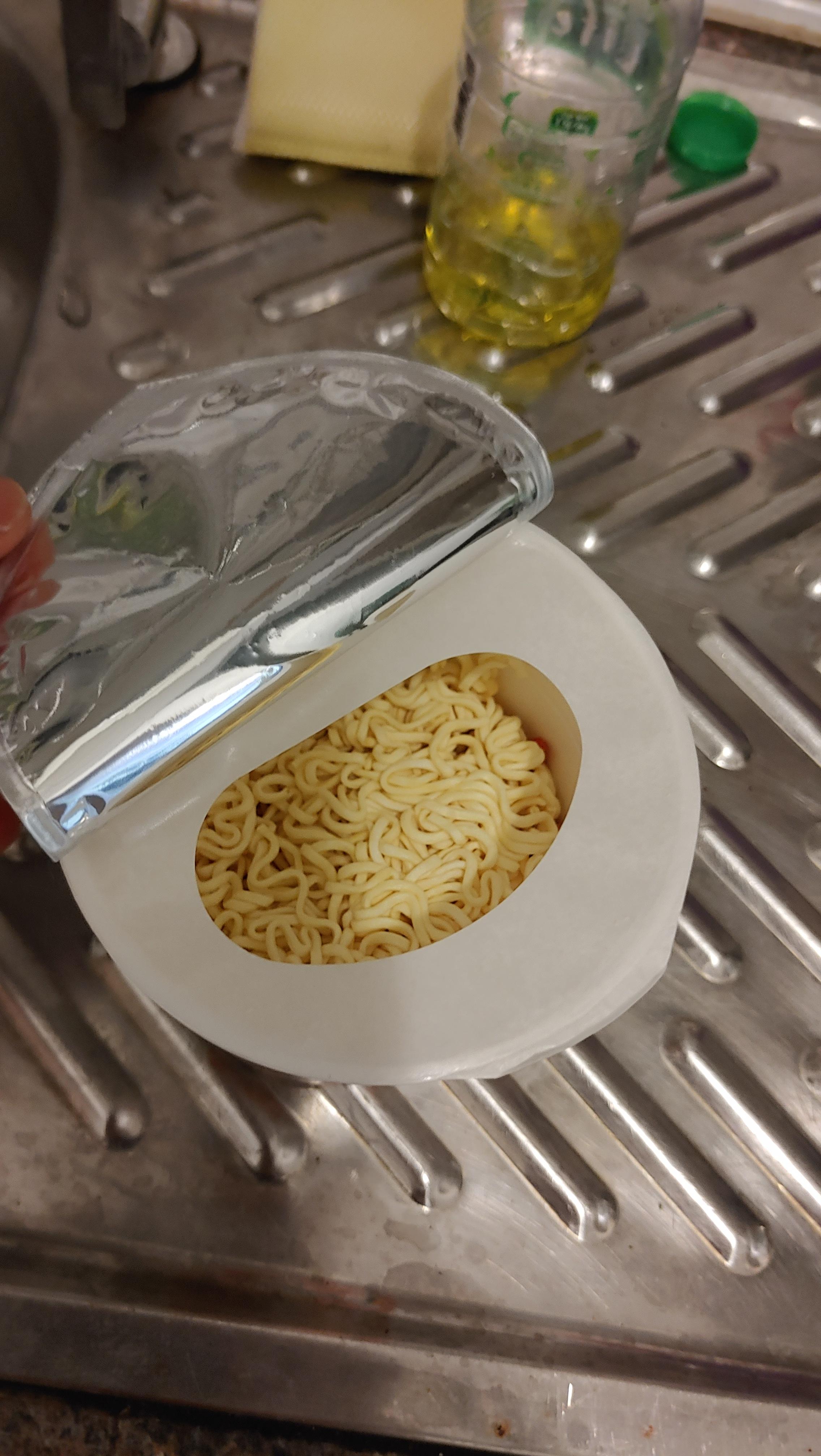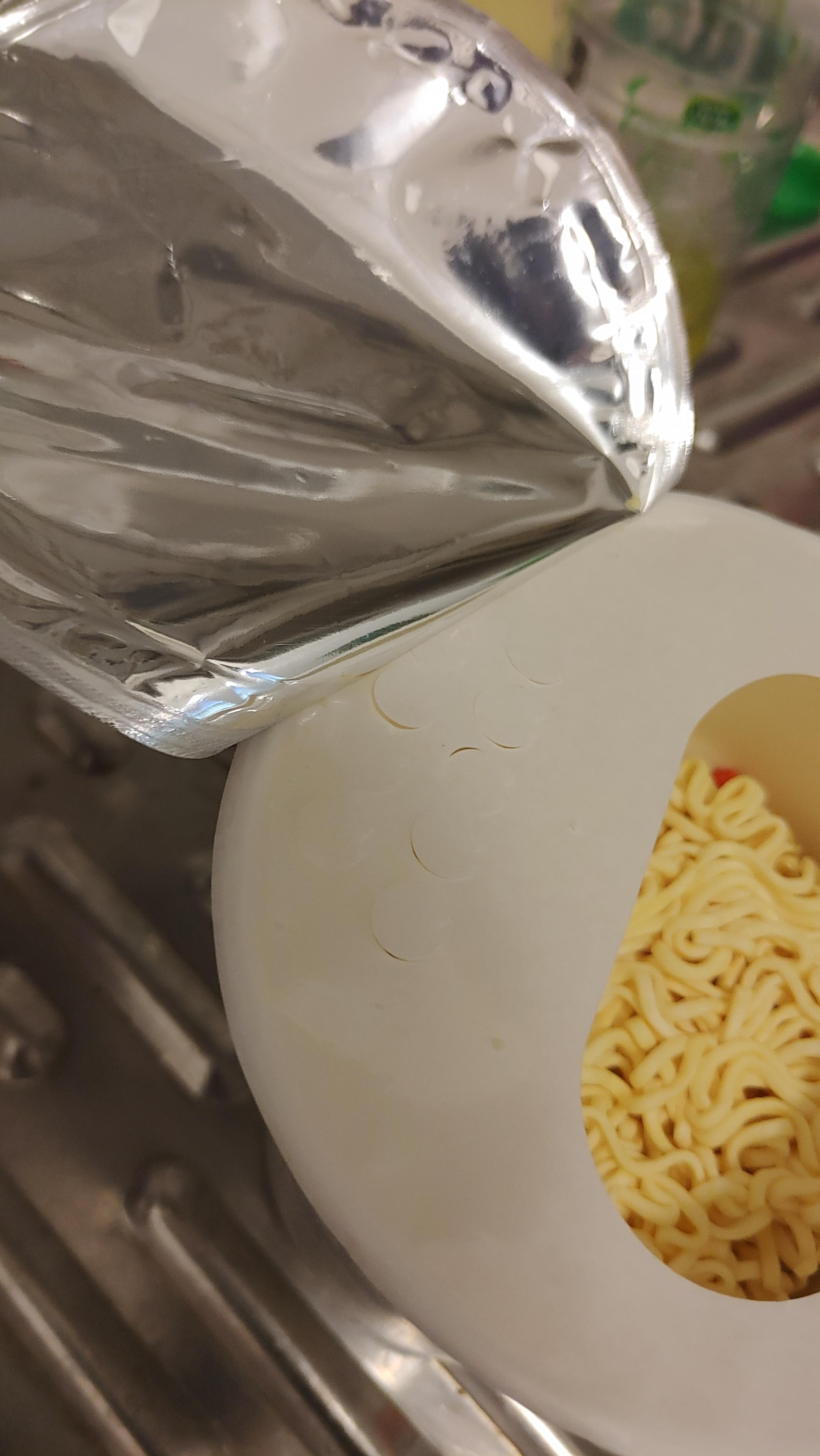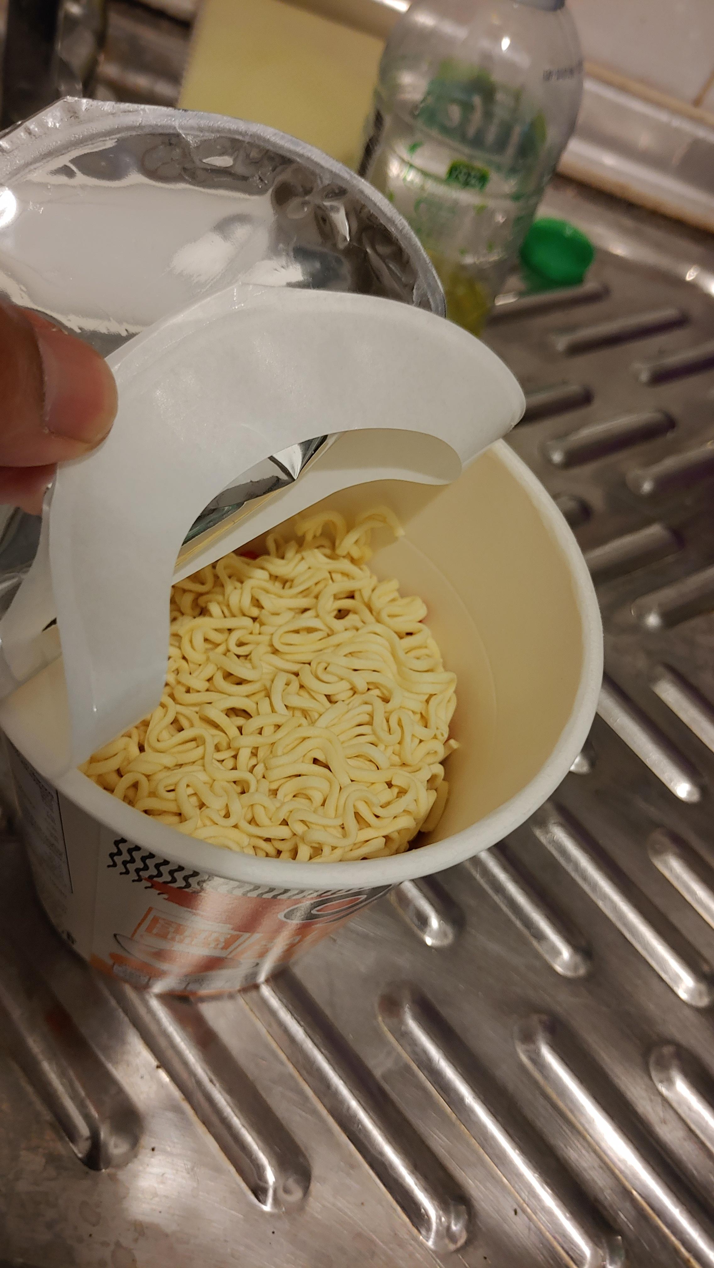 사진처럼 은박뚜껑 아래에 하얀 비닐뚜껑이 있다. 거기로 물을 붓게 된다.