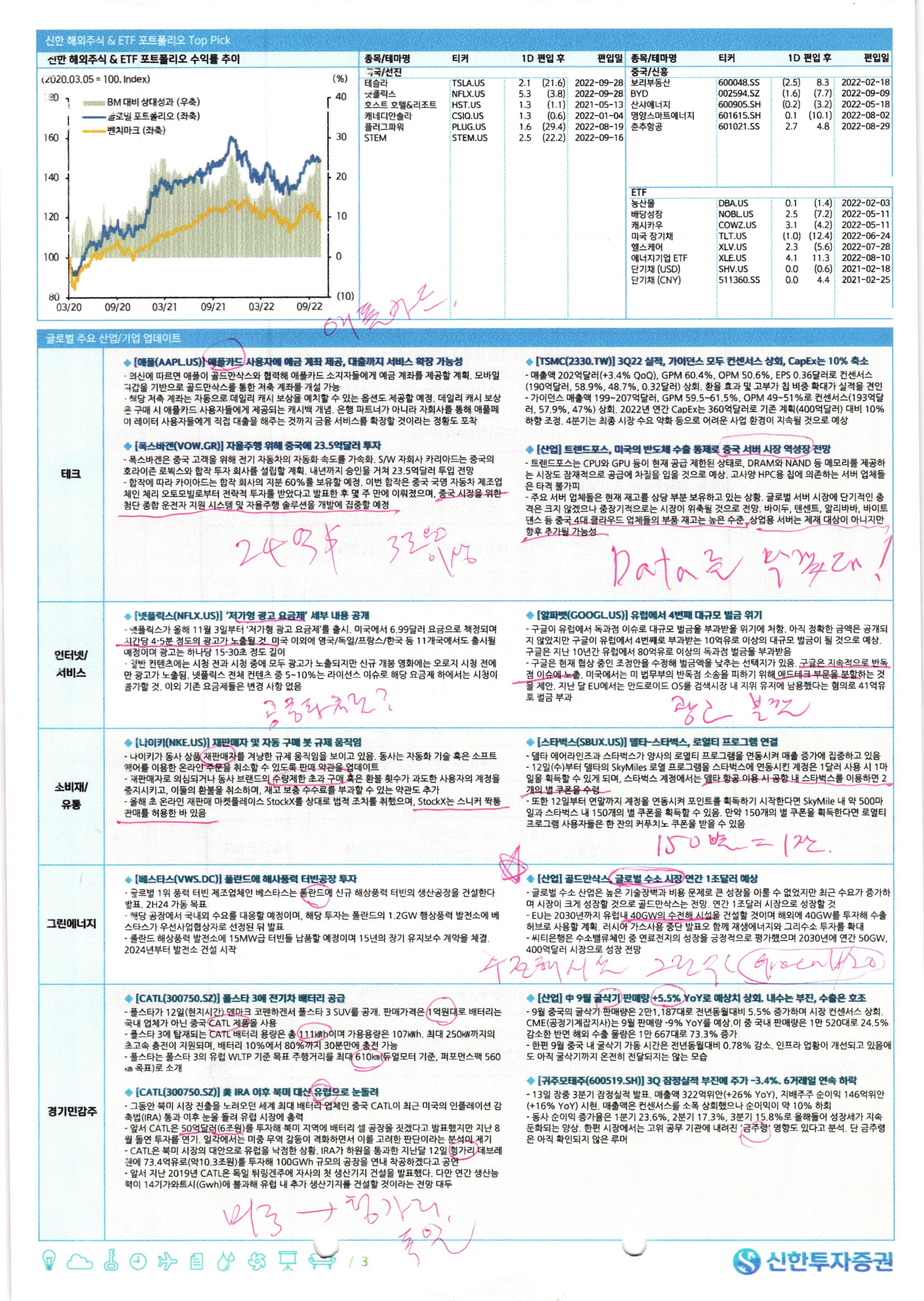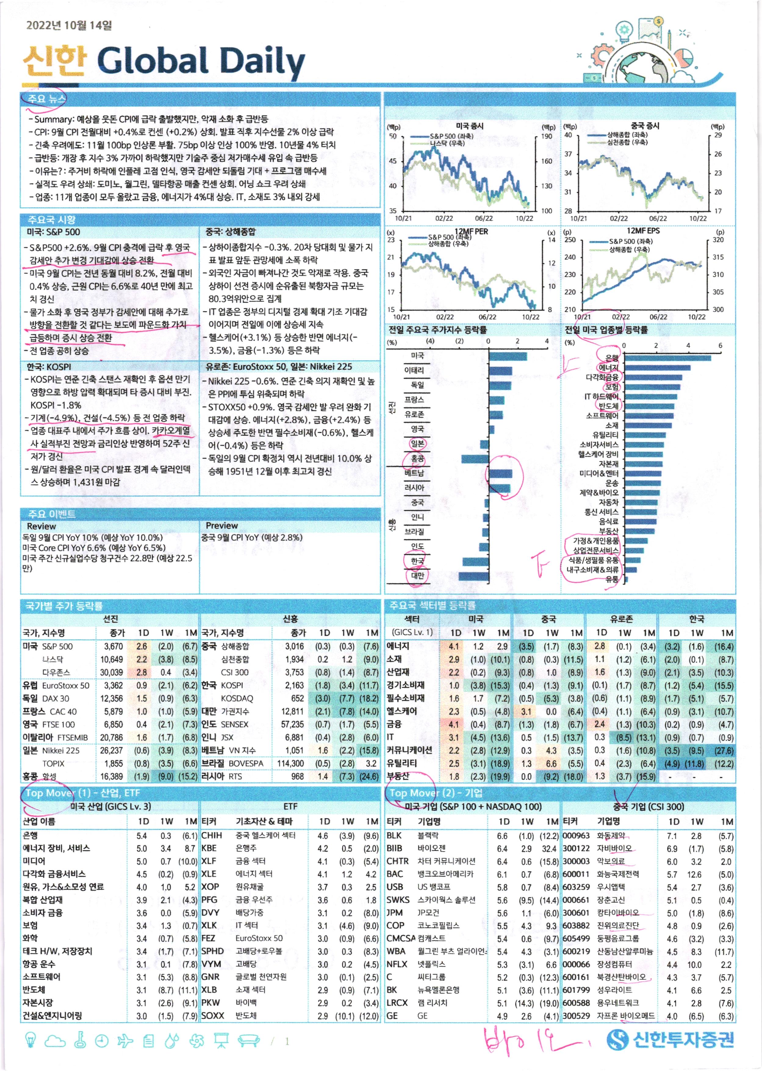 주요 뉴스 주요국 시황 미국: S&P 500 중국: 상해종합 전일 주요국 주가지수 등락률 전일 미국 업종별 등락률 한국: KOSPI 유로존: EuroStoxx 50, 일본: Nikkei 225 주요 이벤트 Review 국가별 주가 등락률 국가, 지수명 종가 1D 1W 1M 국가, 지수명 종가 1D 1W 1M 1D 1W 1M 1D 1W 1M 1W 1M 1D 1W 1M 미국 S&P 500 3,670 2.6 (2.0) (6.7) 중국 상해종합 3,016 (0.3) (0.3) (7.6) 에너지 4.1 1.2 2.9 (3.5) (1.7) (8.3) (0.1) (3.4) (3.2) (1.6) (16.4) 미국 나스닥 10,649 2.2 (3.8) (8.5) 중국 심천종합 1,934 0.2 1.2 (9.0) 소재 2.9 (1.0) (10.1) (0.8) (0.3) (11.5) (1.2) (6.1) (2.0) (0.1) (8.7) 미국 다우존스 30,039 2.8 0.4 (3.4) 중국 CSI 300 3,753 (0.8) (1.4) (8.7) 산업재 2.2 (0.2) (9.3) (0.8) 1.0 (8.9) (1.3) (9.0) (2.1) (3.5) (10.3) 유럽 EuroStoxx 50 3,362 0.9 (2.1) (6.2) 한국 KOSPI 2,163 (1.8) (3.4) (11.7) 경기소비재 1.0 (3.8) (15.3) (0.4) (1.3) (9.1) (1.7) (8.7) (1.2) (5.4) (15.5) 독일 DAX 30 12,356 1.5 (0.9) (6.3) 한국 KOSDAQ 652 (3.0) (7.7) (18.2) 필수소비재 1.6 1.7 (7.2) (0.5) (5.3) (3.8) (1.1) (8.9) (1.7) (5.1) (5.7) 프랑스 CAC 40 5,879 1.0 (1.0) (5.9) 대만 가권지수 12,811 (2.1) (7.8) (14.0) 헬스케어 2.3 (0.5) (4.8) 3.1 0.0 (6.4) (1.1) (6.4) (0.9) (3.1) (10.7) 영국 FTSE 100 6,850 0.4 (2.1) (7.3) 인도 SENSEX 57,235 (0.7) (1.7) (5.5) 금융 4.1 (0.4) (8.7) (1.3) (1.8) (6.7) (1.3) (10.3) (0.2) (0.9) (4.7) 이탈리아 FTSEMIB 20,786 1.6 (1.7) (6.8) 인니 JSX 6,881 (0.4) (2.8) (6.0) IT 3.1 (4.5) (13.6) 0.5 (1.5) (13.7) (8.5) (13.1) (0.9) (0.7) (0.9) 일본 Nikkei 225 26,237 (0.6) (3.9) (8.3) 베트남 VN 지수 1,051 1.6 (2.2) (15.8) 커뮤니케이션 2.2 (2.8) (12.9) 0.3 4.3 (3.5) (1.6) (10.8) (3.5) (9.5) (27.6) 일본 TOPIX 1,855 (0.8) (3.5) (6.6) 브라질 BOVESPA 114,300 (0.5) (2.8) 3.2 유틸리티 2.5 (3.1) (18.9) 1.3 6.6 (5.5) (2.3) (6.4) (4.9) (11.8) (12.2) 홍콩 항셍 16,389 (1.9) (9.0) (15.2) 러시아 RTS 968 1.4 (7.3) (24.6) 부동산 1.8 (2.3) (19.9) 0.0 (9.2) (18.0) (3.7) (15.9) - - - 산업 이름 1D 1W 1M 티커 기초자산 & 테마 1D 1W 1M 티커 기업명 1D 1W 1M 1D 1W 1M 은행 5.4 0.3 (6.1) CHIH 중국 헬스케어 섹터 4.6 (3.9) (9.6) BLK 블랙락 6.6 (1.0) (12.2) 000963 화동제약 7.1 2.8 (5.7) 에너지 장비, 서비스 5.0 3.4 8.7 KBE 은행주 4.2 0.5 (2.0) BIIB 바이오젠 6.4 2.9 32.4 300122 자비바이오 6.9 (1.7) (5.8) 미디어 5.0 0.7 (10.0) XLF 금융 섹터 4.1 (0.3) (5.4) CHTR 차터 커뮤니케이션 6.4 0.6 (15.8) 300003 악보의료 6.0 3.2 2.0 다각화 금융서비스 4.5 (0.2) (0.9) XLE 에너지 섹터 4.1 1.2 4.2 BAC 뱅크오브아메리카 6.1 0.7 (6.8) 600011 화능국제전력 5.7 12.6 (5.0) 원유, 가스&소모성 연료 4.0 1.0 5.2 XOP 원유채굴 3.7 0.3 2.5 USB US 뱅코프 5.8 0.7 (8.4) 603259 우시앱텍 5.4 2.7 (3.6) 복합 산업재 3.9 2.1 (4.3) PFG 금융 우선주 3.6 0.6 1.8 SWKS 스카이웍스 솔루션 5.6 (9.5) (14.4) 000661 장춘고신 5.1 0.5 (0.4) 소비자 금융 3.6 0.0 (5.9) DVY 배당가중 3.1 0.2 (8.0) JPM JP모건 5.6 1.1 (6.0) 300601 캉타이바이오 5.0 (1.8) (8.6) 보험 3.4 1.3 (0.7) XLK IT 섹터 3.1 (4.6) (9.0) COP 코노코필립스 5.5 4.3 9.3 603882 진위의료진단 4.8 0.9 (2.6) 화학 3.4 (0.7) (5.8) FEZ EuroStoxx 50 3.0 (0.9) (6.6) CMCSA컴캐스트 5.4 0.6 (9.7) 605499 둥펑음료그룹 4.6 (3.2) (3.3) 테크 H/W, 저장장치 3.4 (1.7) (7.1) SPHD 고배당+로우볼 3.0 0.3 (8.3) WBA 월그린 부츠 얼라이언스 5.4 4.3 (3.1) 600219 산동남산알루미늄 4.5 8.3 (11.7) 항공 운수 3.1 0.1 (7.8) VYM 고배당 3.0 0.2 (4.5) NFLX 넷플릭스 5.3 (3.1) 6.6 000066 장성컴퓨터 4.4 10.0 2.2 소프트웨어 3.1 (5.3) (8.8) GNR 글로벌 천연자원 3.0 (0.1) (2.5) C 씨티그룹 5.2 (0.3) (12.3) 600161 북경샨탄바이오 4.3 3.7 (5.7) 반도체 3.1 (8.7) (11.1) XLB 소재 섹터 2.9 (0.9) (7.1) BK 뉴욕멜론은행 5.1 (3.6) (11.1) 601799 성우라이트 4.1 6.6 2.5 자본시장 3.1 (2.6) (9.1) PKW 바이백 2.9 0.2 (3.4) LRCX 램 리서치 5.1 (14.3) (19.0) 600588 용우네트워크 4.1 2.8 (7.6) 건설&엔지니어링 3.0 (1.5) (7.9) SOXX 반도체 2.9 (10.1) (12.0) GE GE 4.9 2.6 (4.1) 300529 자프론 바이오메드 4.0 (6.5) (6.3) 1D 2.8 1.1 1.6 주요국 섹터별 등락률 섹터 Preview 독일 9월 CPI YoY 10% (예상 YoY 10.0%) 중국 9월 CPI YoY (예상 2.8%) 미국 Core CPI YoY 6.6% (예상 YoY 6.5%) 미국 주간 신규실업수당 청구건수 22.8만 (예상 22.5 만) 티커 중국 기업명 한국 1.3 중국 기업 (CSI 300) 2.4 0.3 Top Mover (2) - 기업 0.3 0.4 (GICS Lv. 1) (0.6) (0.4) (0.1) 유로존 미국 산업 (GICS Lv. 3) ETF 미국 기업 (S&P 100 + NASDAQ 100) 선진 신흥 Top Mover (1) - 산업, ETF 미국 신한 Global Daily 2022년 10월 14일 / 1 (4) (2) 0 2 4 미국 이태리 독일 프랑스 유로존 영국 일본 홍콩 베트남 러시아 중국 인니 브라질 인도 한국 대만 선진 신흥 (%) - S&P500 +2.6%. 9월 CPI 충격에 급락 후 영국 감세안 추가 변경 기대감에 상승 전환 - 미국 9월 CPI는 전년 동월 대비 8.2%, 전월 대비 0.4% 상승, 근원 CPI는 6.6%로 40년 만에 최고 치 경신 - 물가 소화 후 영국 정부가 감세안에 대해 추가로 방향을 전환할 것 같다는 보도에 파운드화 가치 급등하며 증시 상승 전환 - 전 업종 공히 상승 - 상하이종합지수 -0.3%. 20차 당대회 및 물가 지 표 발표 앞둔 관망세에 소폭 하락 - 외국인 자금이 빠져나간 것도 악재로 작용. 중국 상하이 선전 증시에 순유출된 북향자금 규모는 80.3억위안으로 집계 - IT 업종은 정부의 디지털 경제 확대 기조 기대감 이어지며 전일에 이에 상승세 지속 - 헬스케어(+3.1%) 등 상승한 반면 에너지(- 3.5%), 금융(-1.3%) 등은 하락 -KOSPI는 연준 긴축 스탠스 재확인 후 옵션 만기 영향으로 하방 압력 확대되며 타 증시 대비 부진. KOSPI -1.8% - 기계(-4.9%), 
