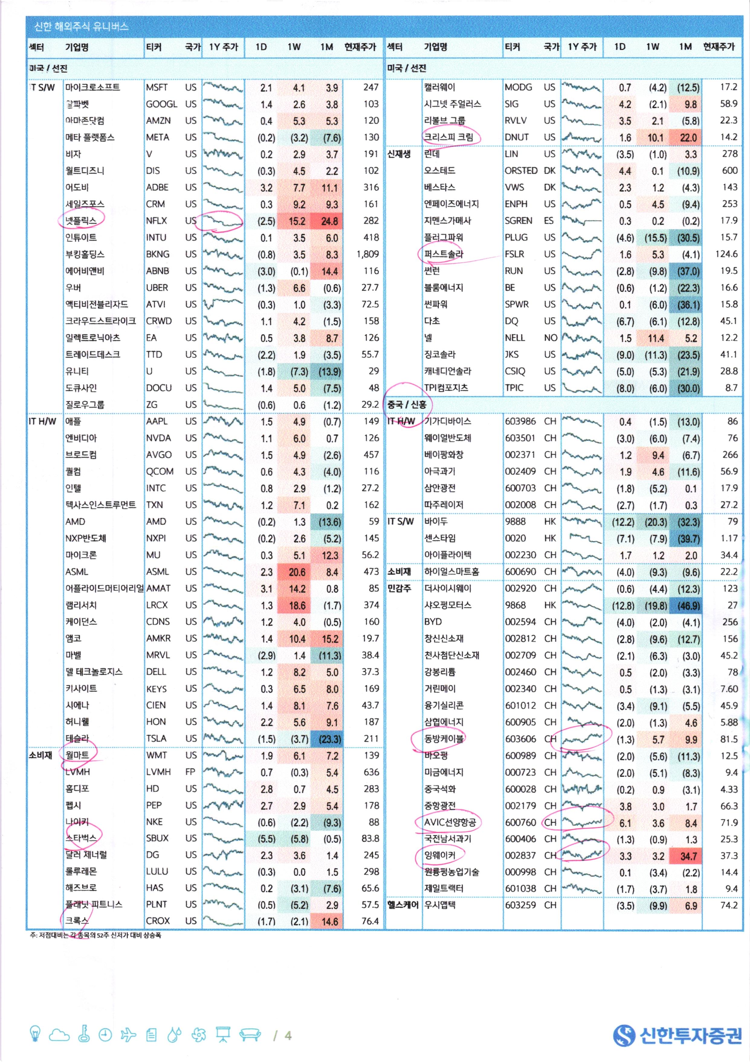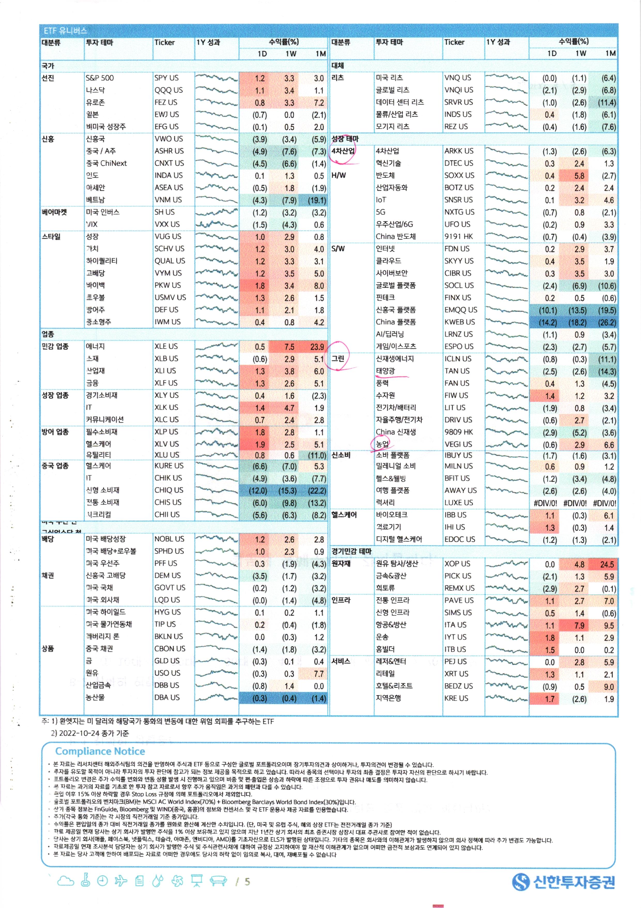 주요 뉴스 주요국 시황 미국: S&P 500 중국: 상해종합 전일 주요국 주가지수 등락률 전일 미국 업종별 등락률 한국: KOSPI 유로존: EuroStoxx 50, 일본: Nikkei 225 주요 이벤트 Review 국가별 주가 등락률 국가, 지수명 종가 1D 1W 1M 국가, 지수명 종가 1D 1W 1M 1D 1W 1M 1D 1W 1M 1W 1M 1D 1W 1M 미국 S&P 500 3,797 1.2 3.2 2.8 중국 상해종합 2,978 (2.0) (3.5) (3.6) 에너지 0.5 7.3 14.8 (1.7) (2.8) (6.6) 1.6 2.0 (1.1) (0.5) (9.7) 미국 나스닥 10,953 0.9 2.6 0.8 중국 심천종합 1,932 (1.8) (3.3) (1.6) 소재 (0.6) 2.9 1.5 (1.0) (4.5) (8.7) 1.8 2.5 0.8 0.4 (3.5) 미국 다우존스 31,500 1.3 4.4 6.5 중국 CSI 300 3,633 (2.9) (5.5) (5.8) 산업재 1.4 3.7 2.4 (1.7) (3.2) (3.1) 1.6 2.6 1.1 0.7 (6.8) 유럽 EuroStoxx 50 3,528 1.5 2.5 5.4 한국 KOSPI 2,236 1.0 0.7 (2.4) 경기소비재 0.5 1.8 (6.1) (2.6) (7.1) (9.0) (0.2) (2.8) (2.2) (2.0) (13.4) 독일 DAX 30 12,931 1.6 2.2 5.3 한국 KOSDAQ 689 2.1 1.0 (5.6) 필수소비재 1.8 2.8 (1.0) (5.2) (9.9) (11.5) (1.7) (4.3) (1.0) (0.3) (7.5) 프랑스 CAC 40 6,131 1.6 1.5 6.0 대만 가권지수 12,857 0.3 (0.8) (8.9) 헬스케어 1.9 2.5 4.9 (2.8) (2.7) 8.2 (0.7) 0.6 2.7 4.7 3.4 영국 FTSE 100 7,014 0.6 1.4 (0.1) 인도 SENSEX 59,832 0.9 2.4 3.0 금융 1.3 2.7 1.5 (3.1) (5.4) (8.1) 2.1 (3.1) (1.5) (1.3) (4.9) 이탈리아 FTSEMIB 21,983 1.9 3.1 4.4 인니 JSX 7,053 0.5 3.2 (1.7) IT 1.4 4.7 (0.6) (0.1) 0.7 (1.6) 4.9 (2.1) 2.5 1.3 3.5 일본 Nikkei 225 26,975 0.3 0.7 (0.7) 베트남 VN 지수 986 (3.3) (6.2) (18.0) 커뮤니케이션 0.9 2.5 0.6 (1.0) (0.5) 1.0 (1.6) (4.6) (0.3) 1.0 (19.5) 일본 TOPIX 1,887 0.3 0.4 (1.5) 브라질 BOVESPA 116,013 (3.3) 2.1 3.8 유틸리티 0.8 0.6 (12.5) (1.8) (2.9) (2.0) 1.4 2.7 (0.3) (2.3) (15.4) 홍콩 항셍 15,181 (6.4) (8.6) (15.3) 러시아 RTS 1,063 1.2 3.4 (6.9) 부동산 (0.1) (1.1) (9.7) 0.0 (1.9) (17.0) 0.7 (8.8) - - - 산업 이름 1D 1W 1M 티커 기초자산 & 테마 1D 1W 1M 티커 기업명 1D 1W 1M 1D 1W 1M 유통업 3.8 2.7 7.5 XLV 헬스케어 섹터 1.9 2.5 5.1 COST 코스트코 3.9 7.1 6.6 601808 중해유복 8.7 9.2 7.4 건설&엔지니어링 3.0 6.0 6.7 FTXR 나스닥 운송 1.8 1.4 3.1 DLTR 달러트리 3.8 8.6 5.5 600588 용우네트워크 6.8 6.8 14.5 바이오테크 2.9 3.0 9.7 XLP 필수소비재 섹터 1.8 2.8 1.1 AMGN 암젠 3.7 3.3 15.1 600893 중항엔진 6.5 3.9 3.7 전문 소매업 2.8 0.9 4.7 PKW 바이백 1.8 3.4 8.0 KHC 크래프트 하인즈 3.7 2.9 7.7 600760 중항심양항공 6.1 3.6 8.4 음식료 소매 2.7 6.5 6.4 IYT 운송 1.7 1.1 2.6 MRNA 모더나 3.7 (4.5) 7.6 002049 자광국미 5.5 7.2 8.7 음료 2.6 2.7 1.8 KBE 은행주 1.7 (1.9) 2.4 VRTX 버텍스 3.5 4.5 9.5 000768 중항항공기 5.5 3.4 (6.3) 항공 운수 2.6 7.0 13.1 IYK 미국 소비재 1.7 2.7 0.3 DXCM 덱스컴 3.4 (0.8) 22.7 601698 중국위성통신 4.9 4.7 4.9 멀티라인 리테일 2.3 6.8 4.3 XHB 홈빌더 1.6 (0.5) 1.0 ABT 애보트 3.4 (5.1) (2.4) 002179 중항광전 3.8 3.0 1.7 건축 제품 2.2 1.3 2.3 PHO 수자원 1.6 1.2 1.9 ODFL 올드 도미니언 프레이트 3.4 0.8 8.5 688111 북경킹소프트 3.2 18.2 32.2 자동차 부품 2.1 4.2 6.6 IYZ 통신 업종 1.5 2.4 (0.1) ORLY 오라일리 오토모티브 3.3 4.4 11.7 601633 장성자동차 2.9 (1.6) (5.1) 헬스케어 서비스 2.1 4.8 6.2 ITB 주택건축 1.5 0.0 (0.1) REGN 리제네론 3.3 0.2 5.7 600085 북경동인당 2.7 5.5 21.4 다각화 통신서비스 2.0 3.9 (1.9) PFG 금융 우선주 1.5 2.3 10.5 ADBE 어도비 3.2 7.7 11.1 600489 중금황금 2.5 (0.5) (2.6) 도로&철도 2.0 (1.6) (1.5) IXJ 글로벌 헬스케어 1.5 1.7 4.5 AMAT 어플라이드 머티리얼즈 3.1 14.2 0.8 300124 회천기술 2.2 (2.4) 13.3 에너지 장비, 서비스 2.0 17.4 40.3 XLK IT 섹터 1.4 4.7 1.9 DHR 다나허 2.9 (3.2) (5.1) 688561 Qi An Xin 2.2 6.8 5.4 생명과학 1.8 (1.5) (1.4) USMV 로우볼 1.3 2.6 1.0 KO 코카콜라 2.9 3.4 (1.8) 600547 산동황금광업 1.9 (0.3) (3.3) 미국 산업 (GICS Lv. 3) ETF 미국 기업 (S&P 100 + NASDAQ 100) 선진 신흥 Top Mover (1) - 산업, ETF 미국 티커 중국 기업명 한국 2.8 중국 기업 (CSI 300) 1.5 0.8 Top Mover (2) - 기업 1.3 2.1 (GICS Lv. 1) 1.5 1.3 1.0 유로존 Preview 독일 10월 경기기대지수 (예상 75.0) 독일 10월 ifo 기업환경지수 (예상 83.3) 미국 8월 주택가격지수 (전월 YoY 13.9%) 미국 10월 CB 소비자신뢰지수 (예상 106.5) 미국 10월 리치몬드 제조업지수 (전월 -8) 유럽 10월 제조업 PMI 46.6 (예상 47.8) 독일 10월 제조업 PMI 45.7 (예상 47.0) 프랑스 10월 제조업 PMI 47.4 (예상 47.1) 영국 10월 제조업 PMI 45.8 (예상 48.0) 미국 10월 제조업 PMI 49.9 (예상 51.0) 1D 0.7 1.0 1.9 주요국 섹터별 등락률 섹터 신한 Global Daily 2022년 10월 25일 / 1 (10) (5) 0 5 이태리 프랑스 독일 유로존 미국 영국 일본 홍콩 러시아 한국 인도 인니 대만 중국 브라질 베트남 선진 신흥 (%) - S&P500 +1.2%. 주요 빅테크 기업 실적 기대 감에 상승 - 경제지표는 부진. 10월 S&P 마킷 제조업, 서비 스업 PMI 예비치는 각각 49.9, 46.6으로 컨센 하회 - 중국 당국의 반시장적 조치 지속 우려에 중국기 업 주식 포진한 나스닥(+0.9%) 상승폭 제한. 핀듀오듀오(-24.6%) 징동닷컴(-13.0%) 등 급락 - 상하이종합지수 -2.0%. 지도부 교체에 따른 정책 불확실성 및 소비 지표 부진에 하락 - 측근 인사로 구성된 시진핑 3기 집권 체제의 경제 운영 불확실성에 투심 위축 - 중국 3분기 GDP는 전년 동기 대비 3.9% 증가해 컨센 상회한 반면 소매판매와 고정자산투자는 컨 센 하회 - 모든 업종 하락한 가운데 필수소비재(-5.2%), 금 융(-3.1%) 등 손실 주도 -KOSPI는 Fed 속도조절 기대와 시장안정조치에 도 중국증시 개장 후 상승폭 축소 . KOSPI +1.0 % - 비금속광물(+3.3%), 의료정밀(+3.2%) 등 상 승. 보험(-0.9%), 운수장비(-1.8%) 등