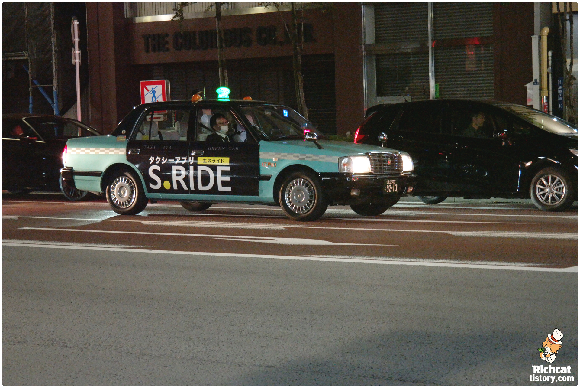 밤을 달리는 일본 택시. S.RIDE 에스라이드. 차가 약간 고풍스런 디자인이다. 그런데...하이브리드인지??? 매우 조용하다.