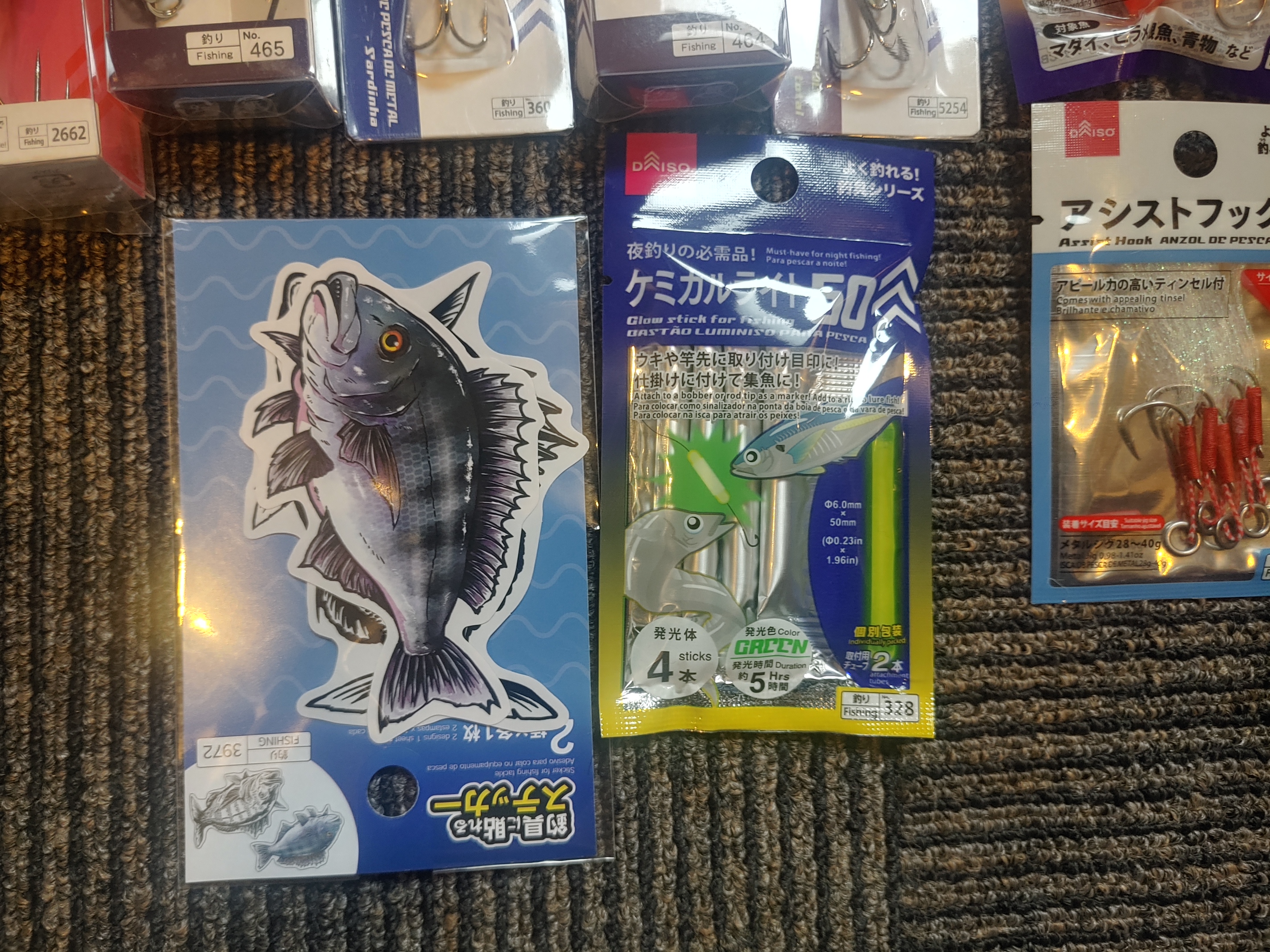 그리고 야광스틱. 한국의 찌낚시에 쓰는 것보다 훨씬 큼. 훅도 100엔인데...품질 좋음.