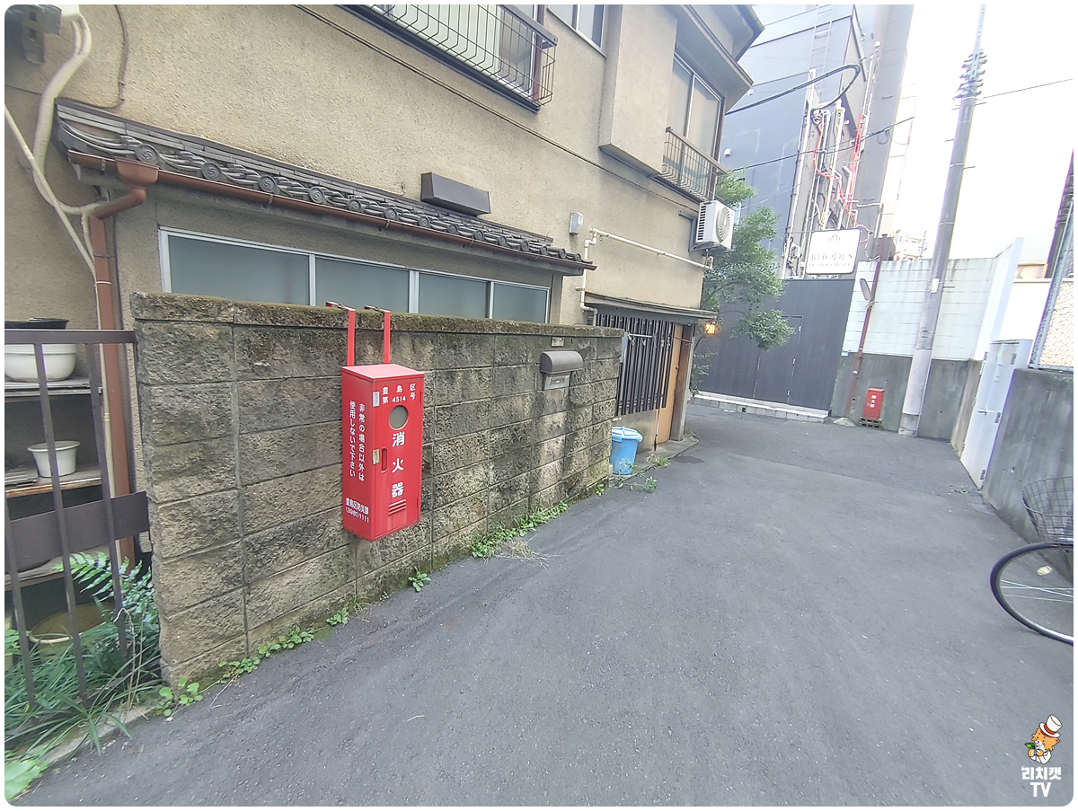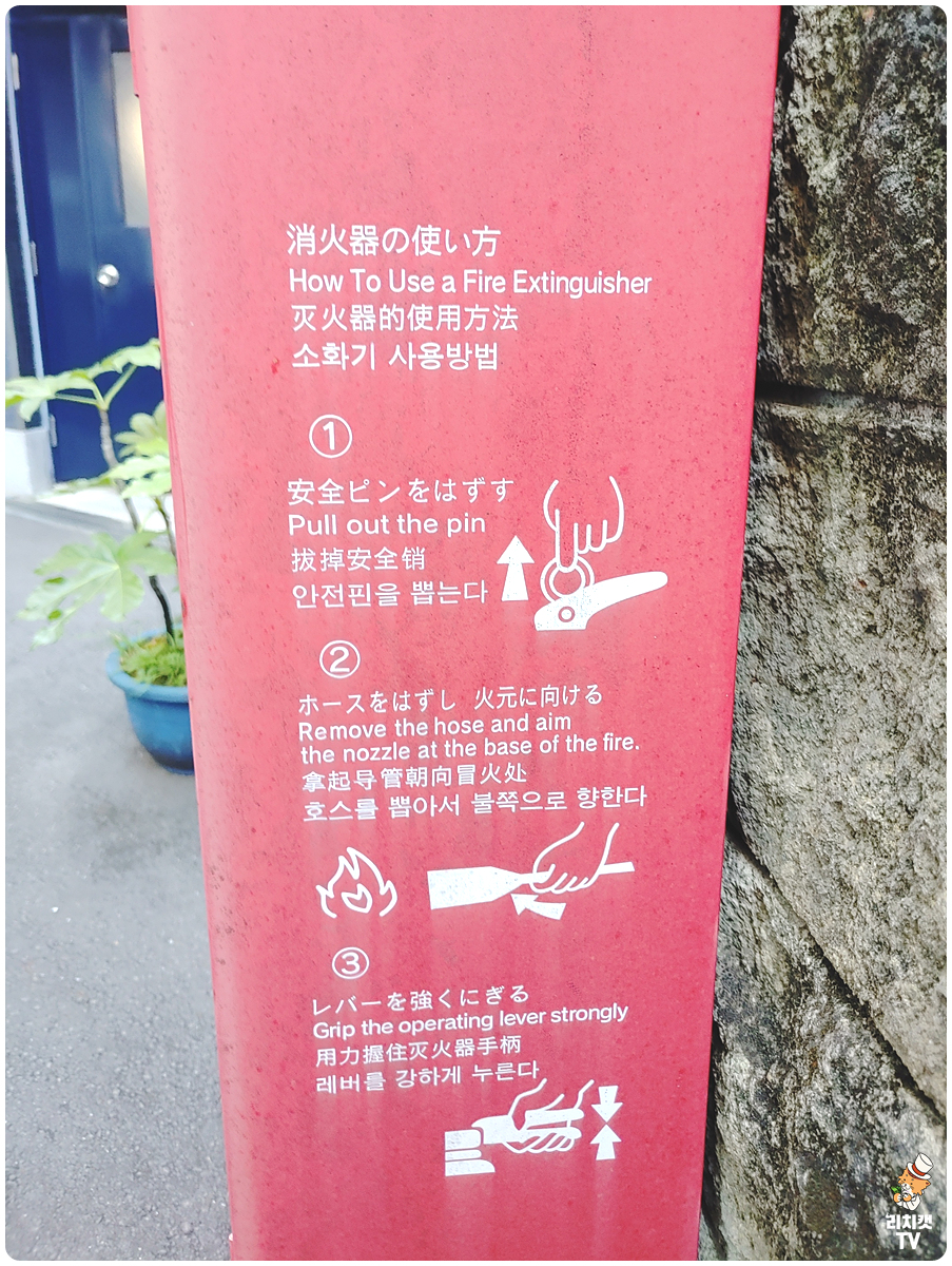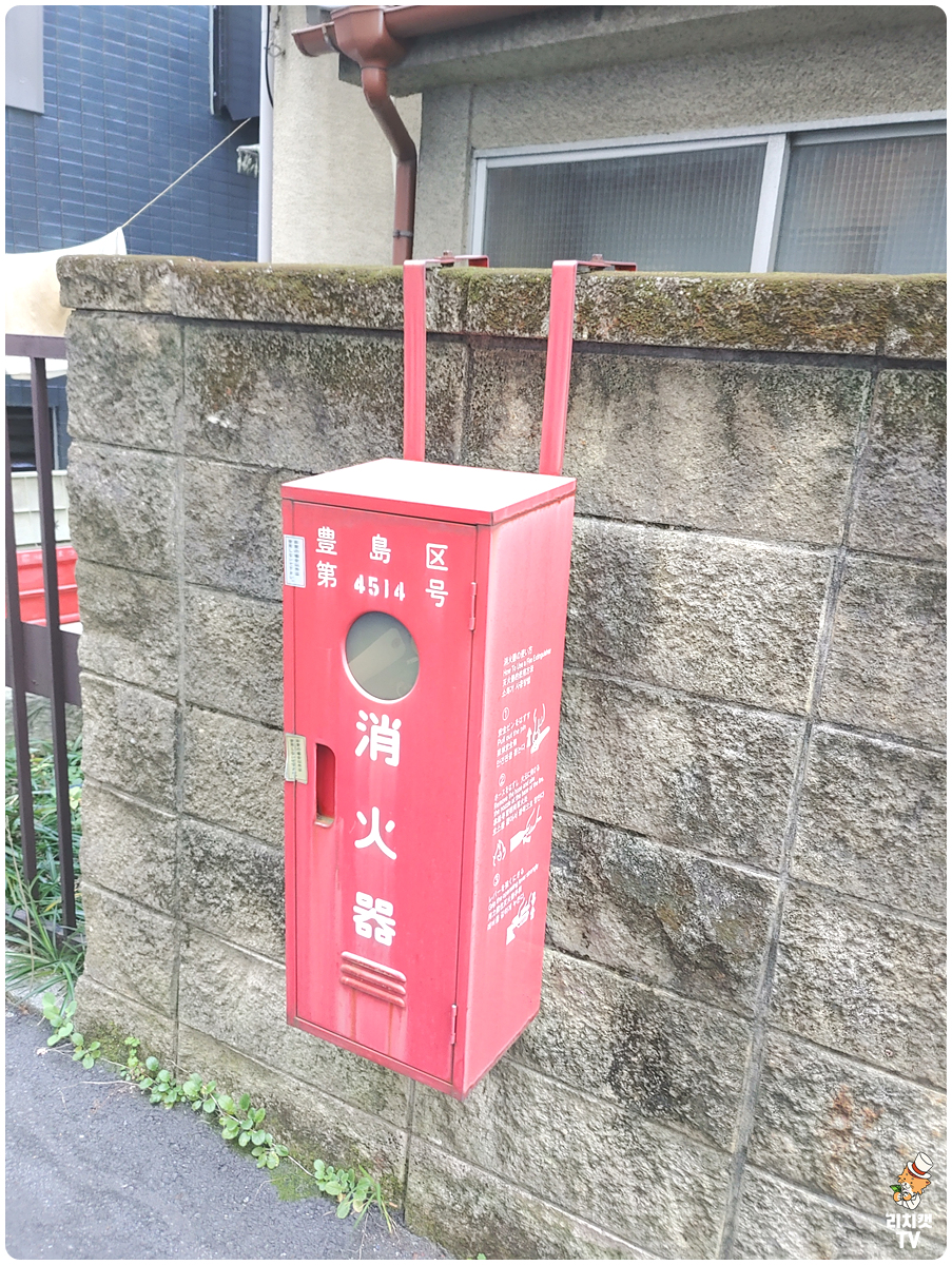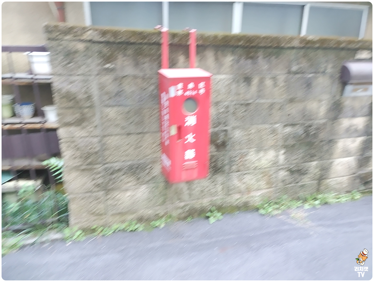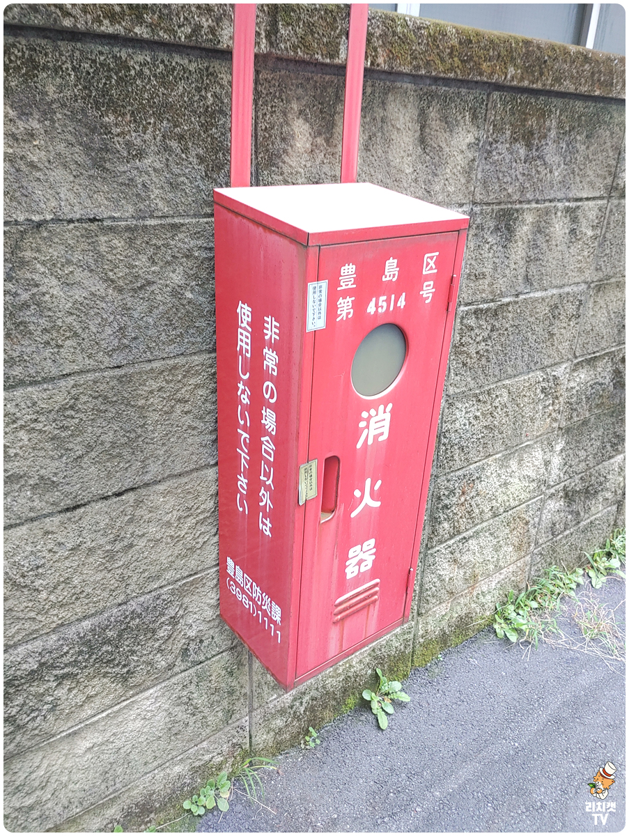 잠수함호텔 앞 골목에 있는 소화기. 길거리 골목에 소화기가 담벼락에 걸려있는 구조. 특이하다.