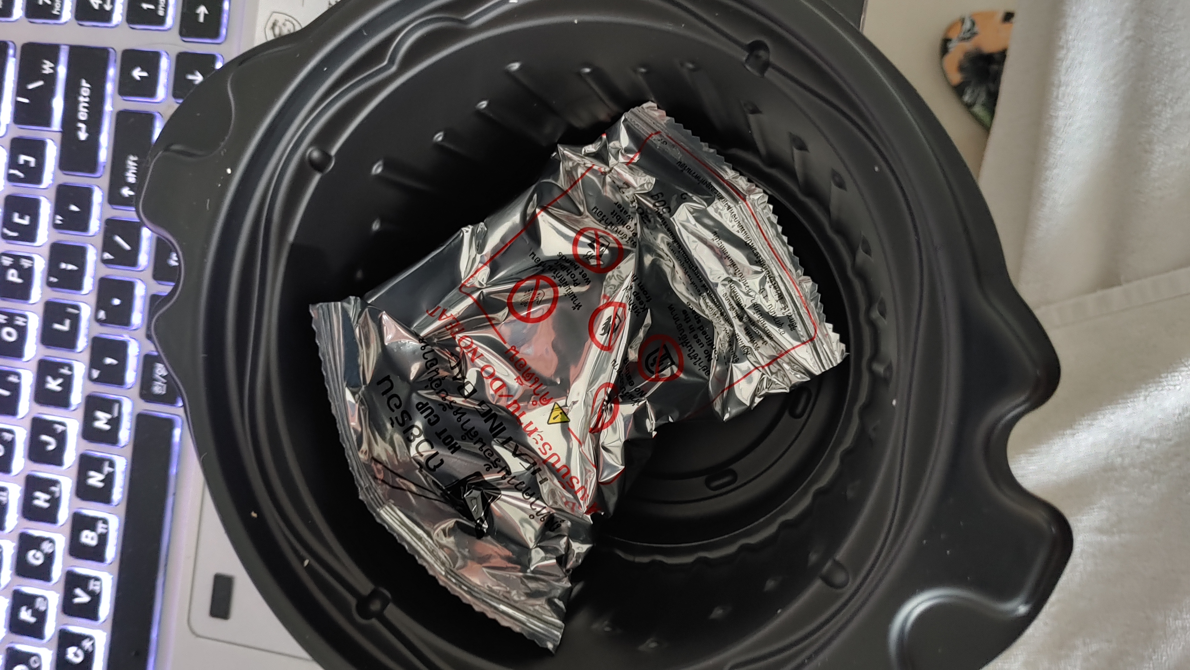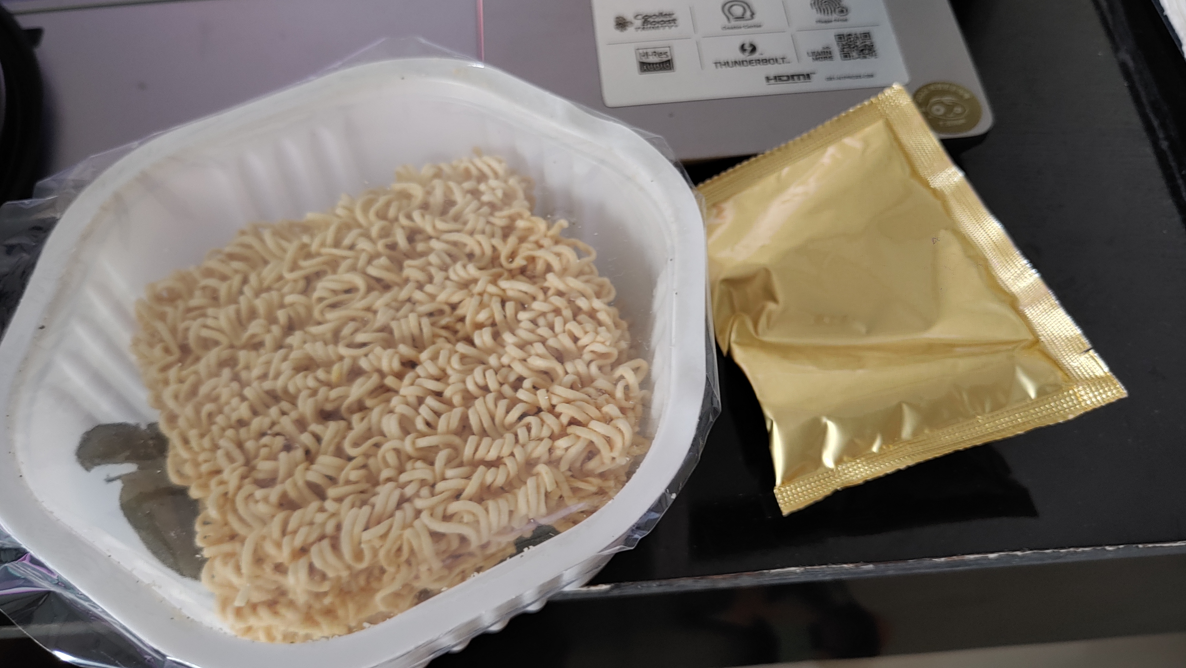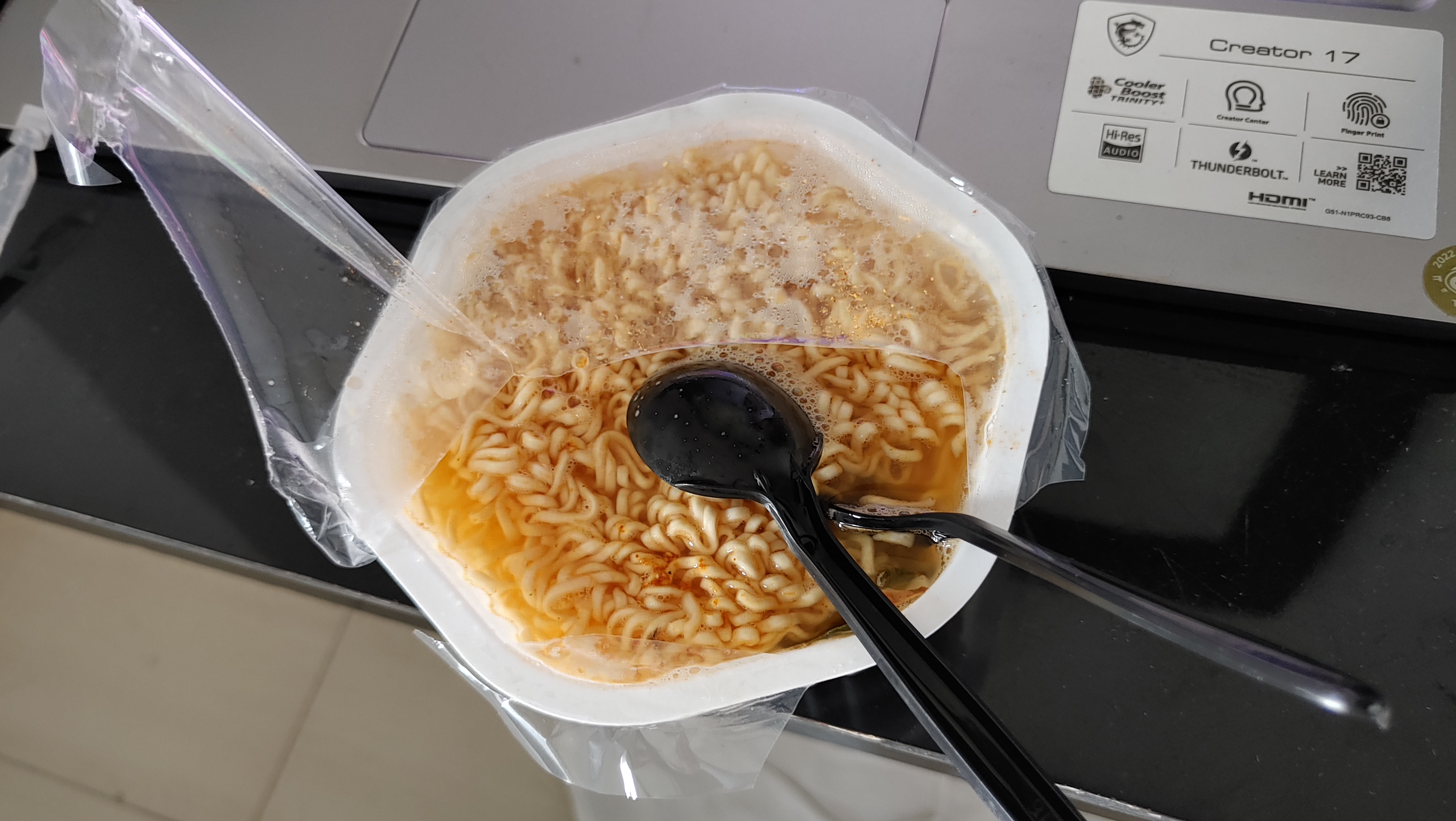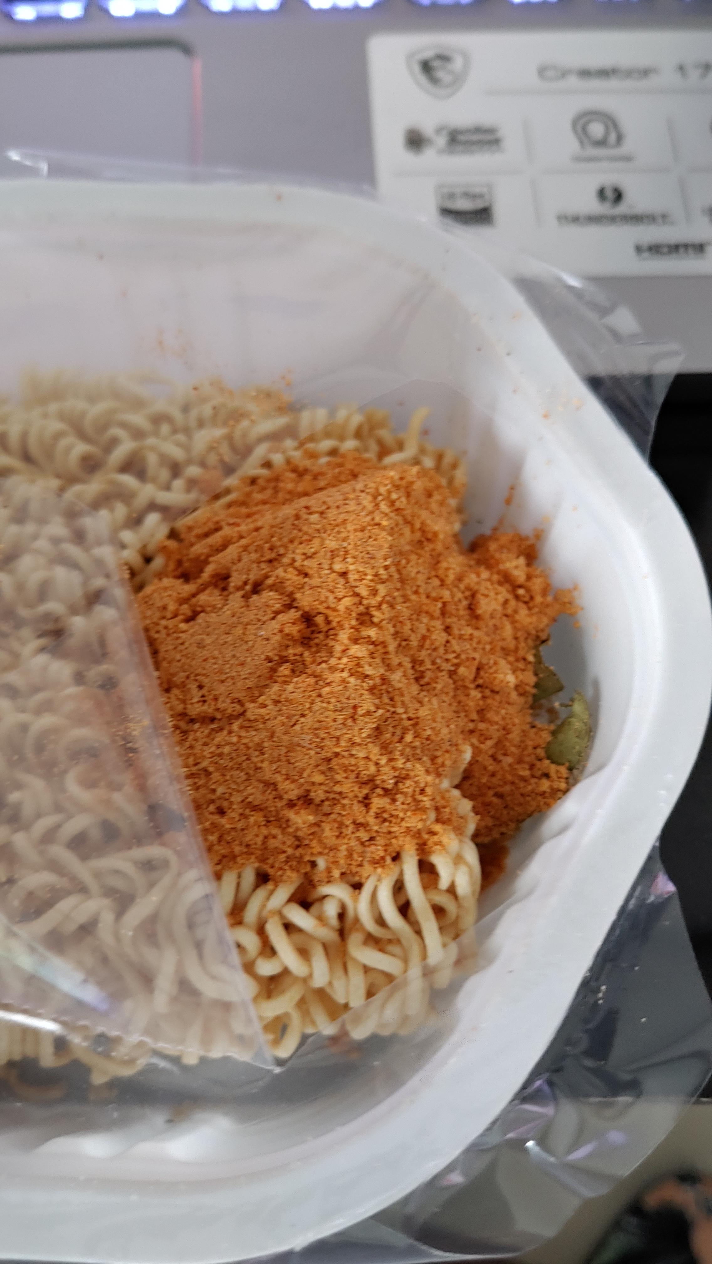 그런데...그 라면이 들어있는 플라스틱 용기를 들어올리니...아래에 더 큰 스프(?)가 있다.