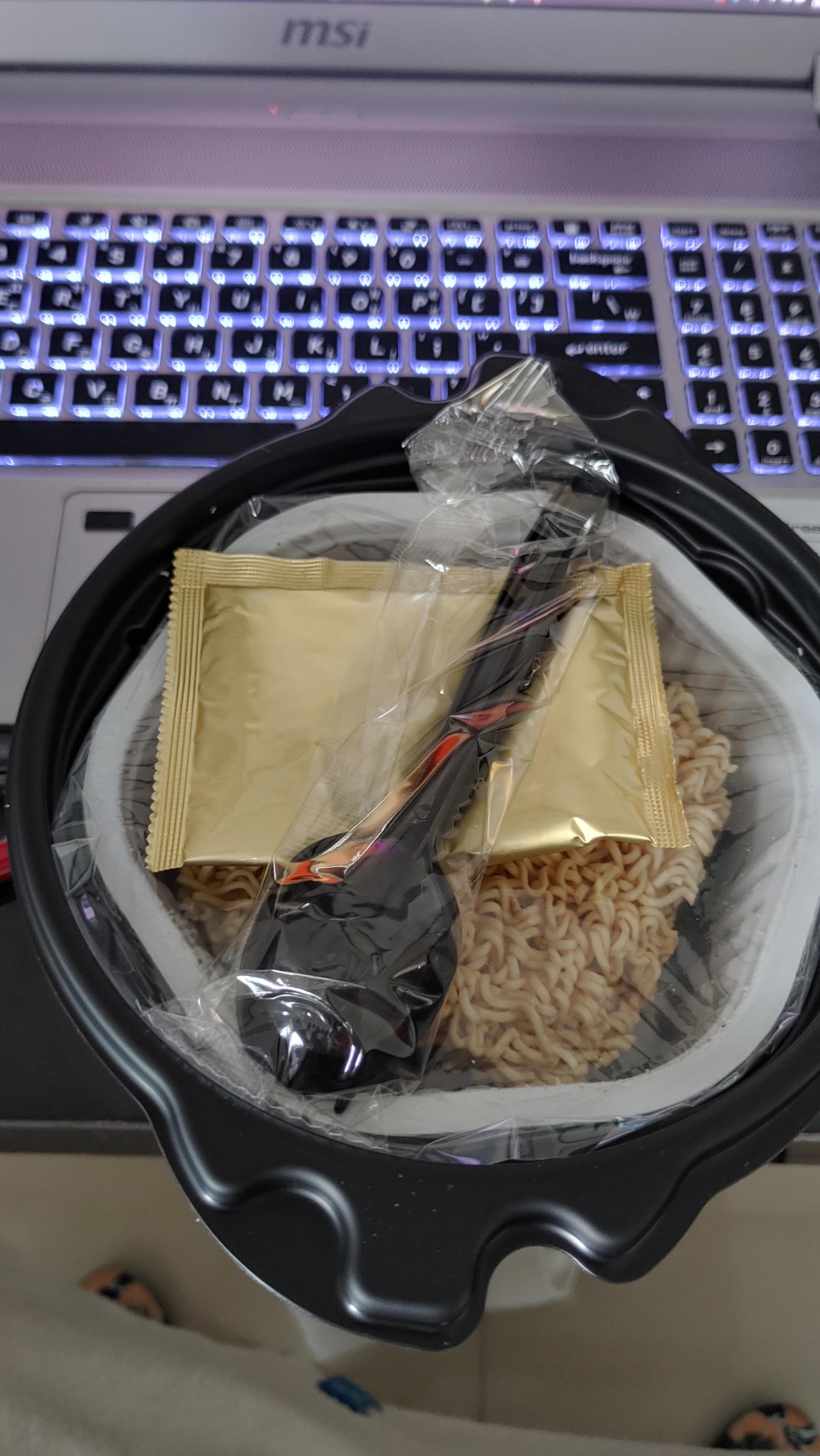 열어보니...작은 라면과 스프 그리고 포크,스푼이 나타났다.
