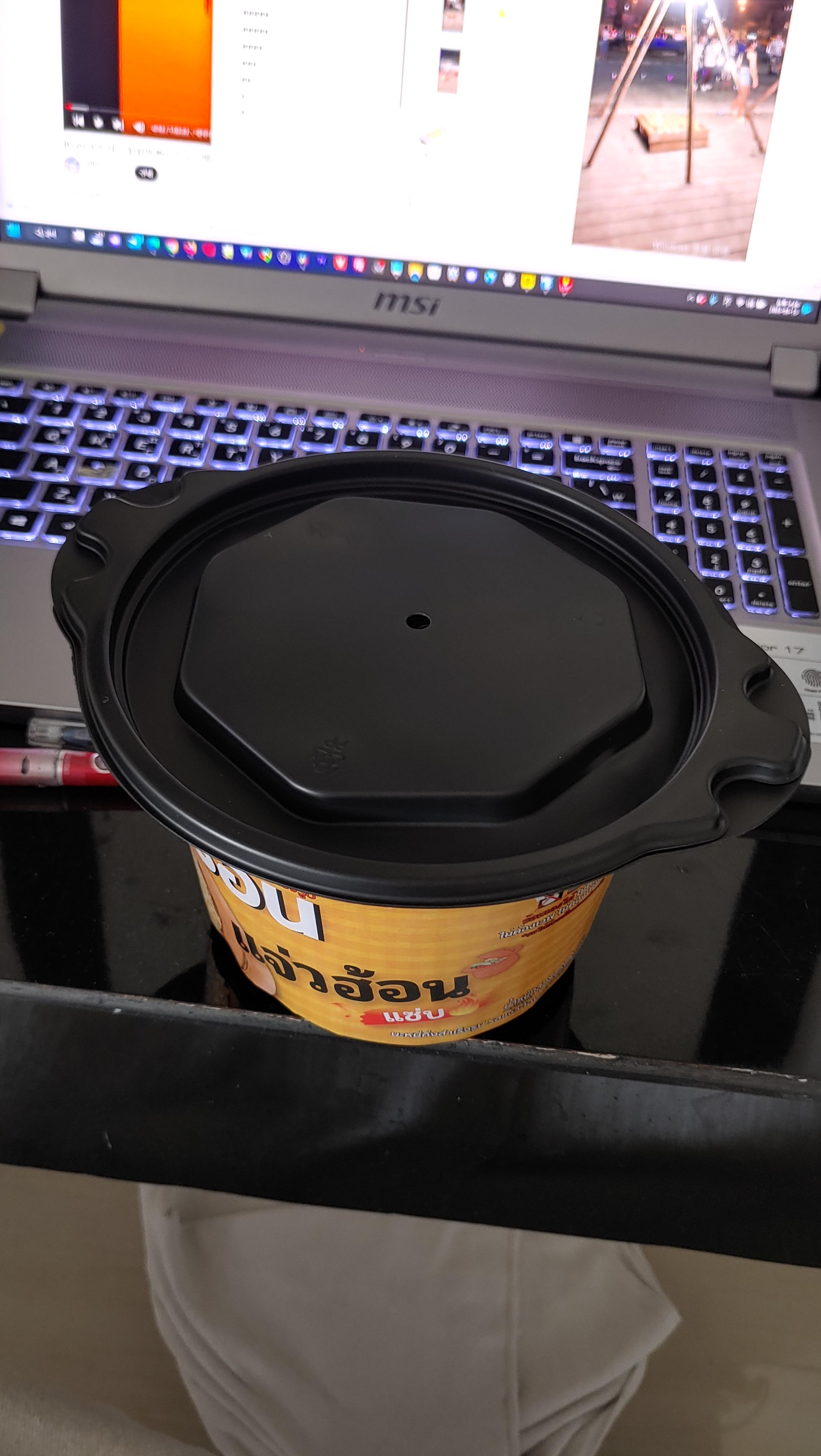 이때??? 갑자기...이건 뭐지? 컵라면 용기 뚜껑에 구멍을???