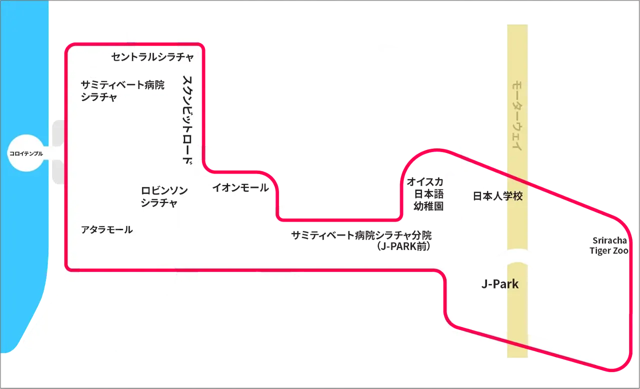 럭스 시라차를 중심으로 거의 시라차 전역을 커버하는 압도적인 운항 범위. 같은 명소의 왕복뿐만 아니라 쇼핑을 한 후 카페에 들러 커피 타임 등 다채로운 어레인지가 가능.