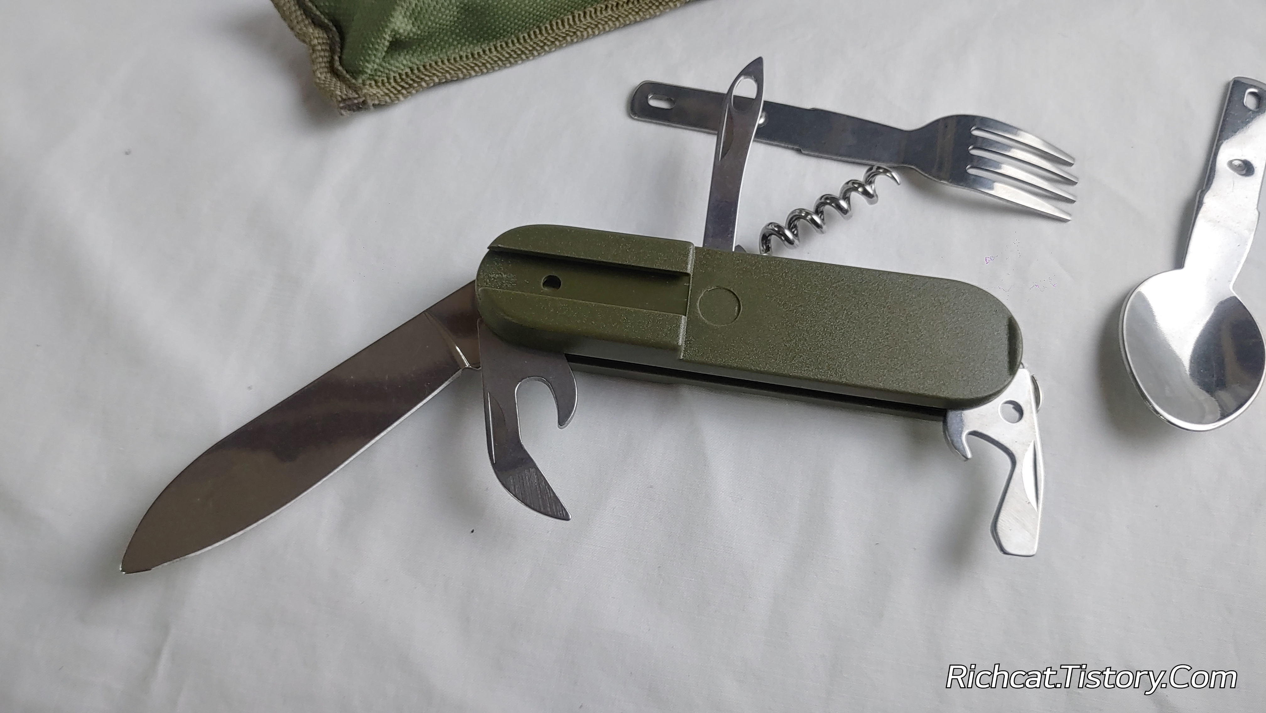 알리쇼핑 리뷰 : 캠핑용 다용도칼. 맥가이버 칼.(수저랑 포크 있음) 2,300원. 가격에 비해 쓸만함. 빅토리녹스,거버 같은 브랜드 제품을 기대하지는 마시고...물론 기대도 안하실듯...