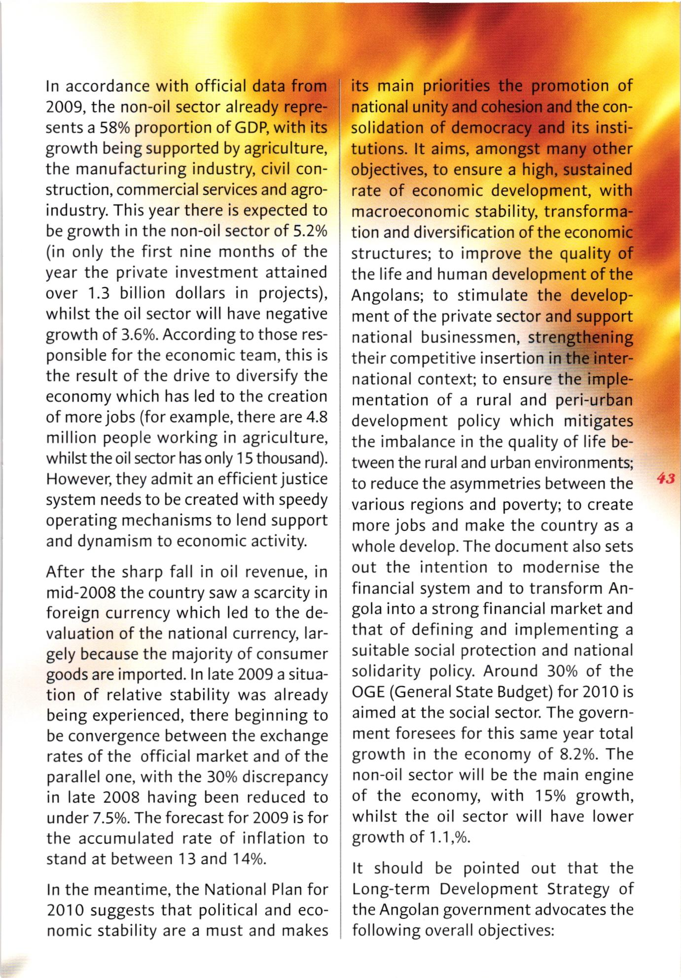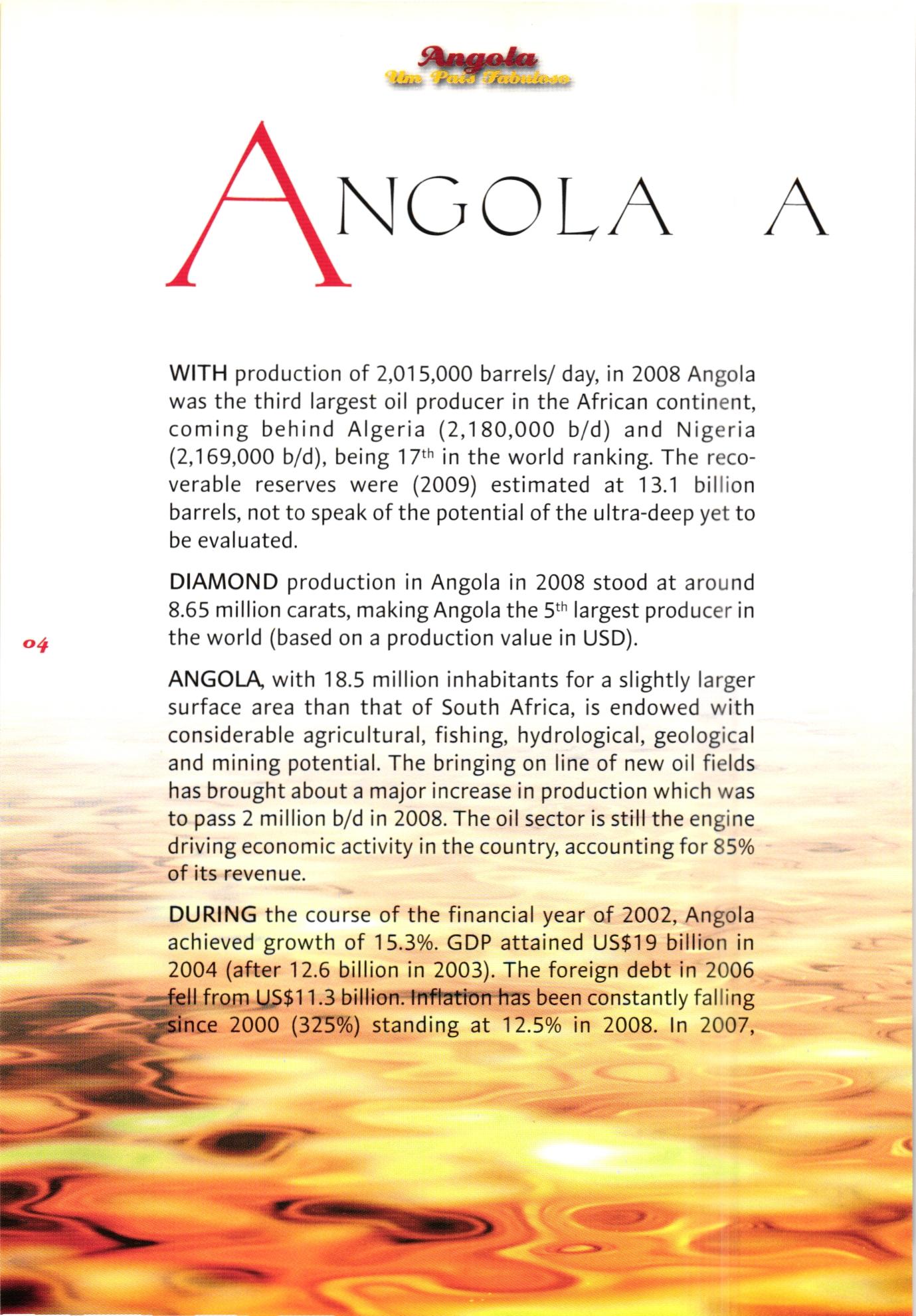 요약하자면, 앙골라는 석유와 다이아몬드 산업이 중요한 역할을 하고 있으며, 경제 발전과 민주주의 실현을 위해 노력하고 있습니다. 인종, 부족 간의 갈등과 빈곤 문제가 남아 있지만, 사회 안전과 여성의 권리에 대한 관심이 높아지면서 나아지고 있습니다. 문화 분야에서는 쿠이사와 같은 독특한 문화적 특성을 지니고 있으며, 교육 분야에서는 교육 기회를 확대하고 인프라 구축을 통해 교육 환경을 개선하고 있습니다.