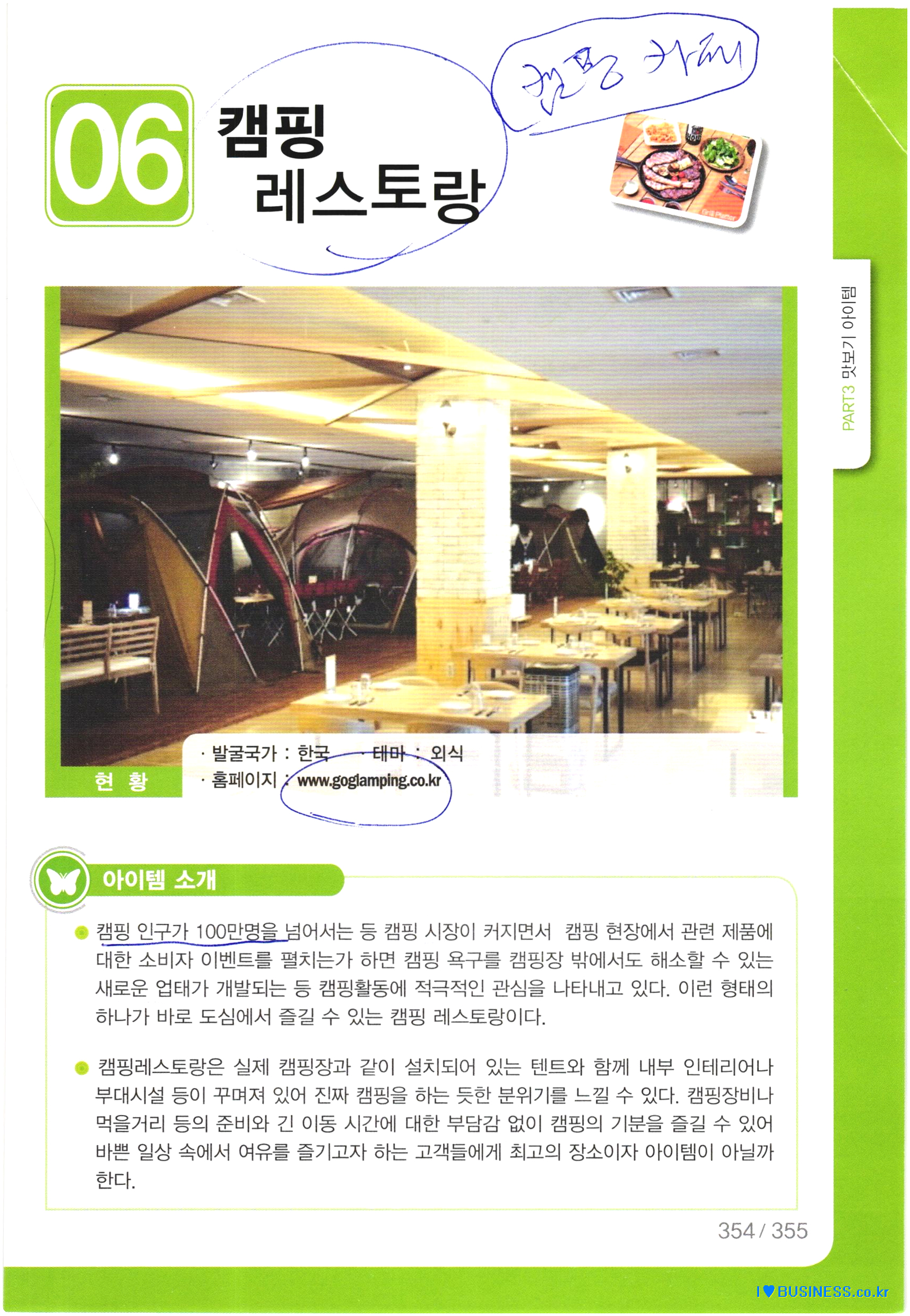 Camping restaurants and camping cafes have recently become more popular in Korea, and representative companies include 'Camping Brunch' and 'Baobab' at 'Changnyeong Art Valley Camping Land'.