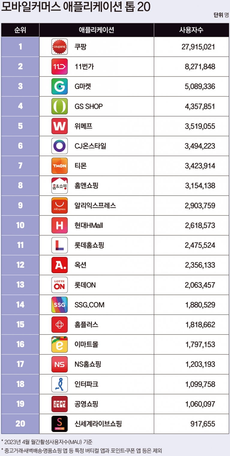 사용자수를 기준으로 연령대별 인기 앱을 조사한 결과에서도 쿠팡은 전 연령대에서 고른 지지로 1위를 차지했다. 11번가 역시 전 연령대에서 사용자수 2위에 올랐다. 알리익스프레스(AliExpress)의 선전도 눈에 띈다. 2020년(5월 기준) 조사에선 순위에 들지 못했던 알리익스프레스는 올 4월 현재 연령대별 사용자수에서 10대 이하에서 3위, 20대에선 5위, 30대에선 7위를 차지했다. 반면 40대 이상에선 톱 10 안에 이름을 올리지 못했다. 알리익스프레스는 중국 알리바바그룹이 운영하는 모바일커머스 플랫폼으로, 중국 생산 제품을 해외에 판매하는 직구 앱이다. 반중 감정에 비교적 구애받지 않는 젊은 층을 중심으로 알리익스프레스의 가격파괴 전략이 먹히고 있다는 분석이다.