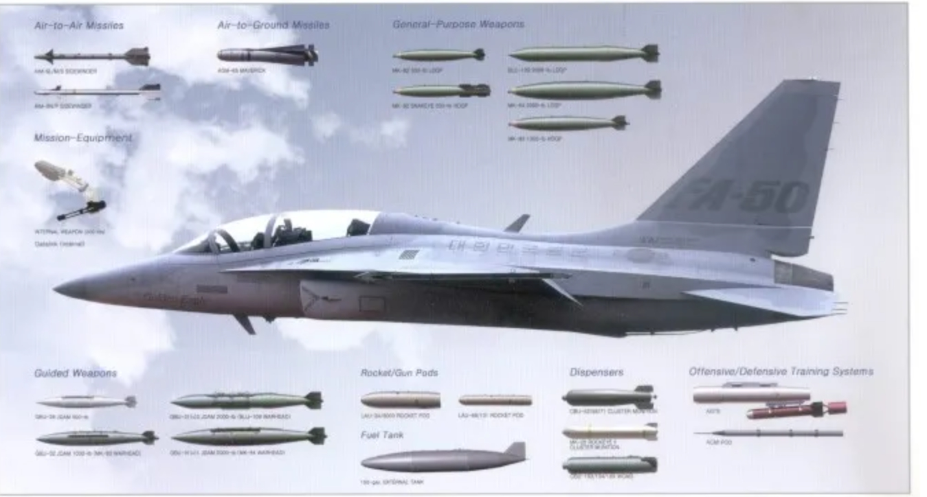Missiles: AIM-9 Side Winder, AGM-65 Maverick, IRIS-T, KEPD 350K-2, AIM-120 AMRAAM