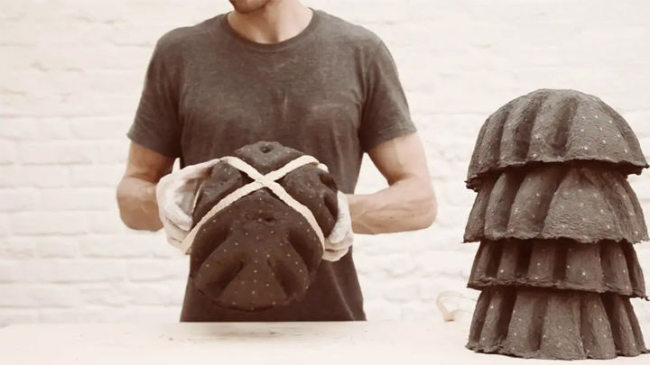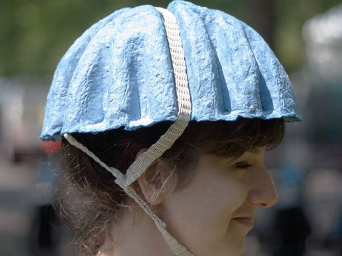 이 헬멧은 영국의 젊은 디자이너 이지스 쉬퍼가 런던 시민들을 위해 개발한 재활용 헬멧입니다. 이 헬멧의 소재는 신문지인데요. 매일 버려지는 신문지를 모아서 물과 섞어 만듭니다.