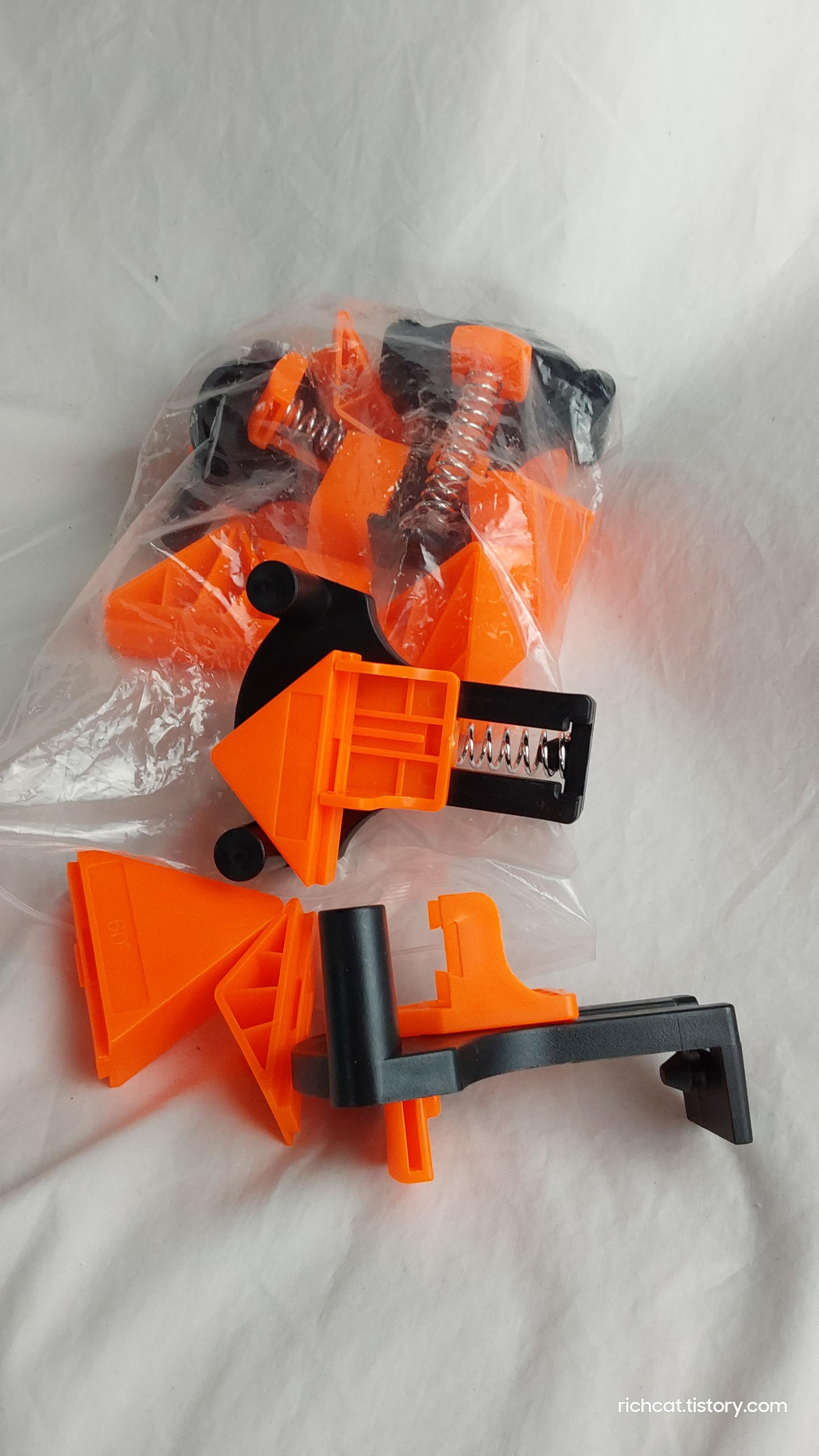 목공용 부속 나무길이 접합을 해놓고 본드로 접합시이 도구로 물어주면은 좀 더 정확하게 90도를 유지하면서 단단하게 접착이 된다.