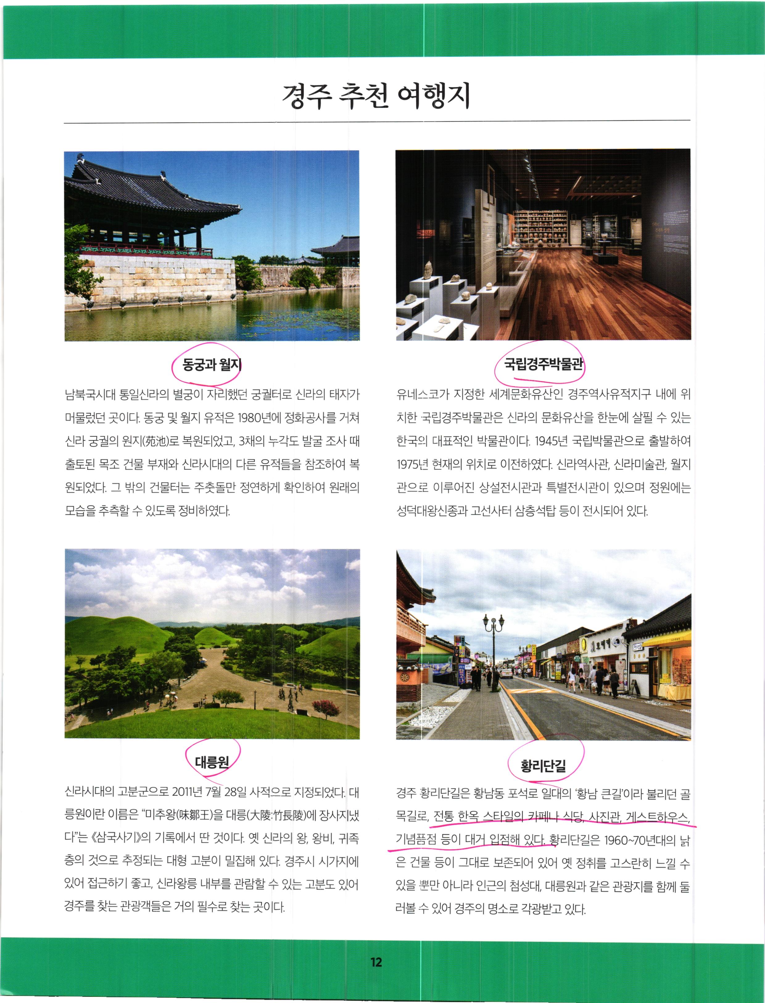 이상으로 동궁과 월지, 국립경주박물관, 대릉원, 황리단길, 경주 안계저수지에 대해 설명하였습니다.