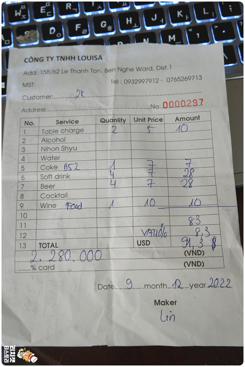 그리고 호치민 일본인거리에 있는 바에서 칵테일,맥주 마시면 나오는 가격. ^&^