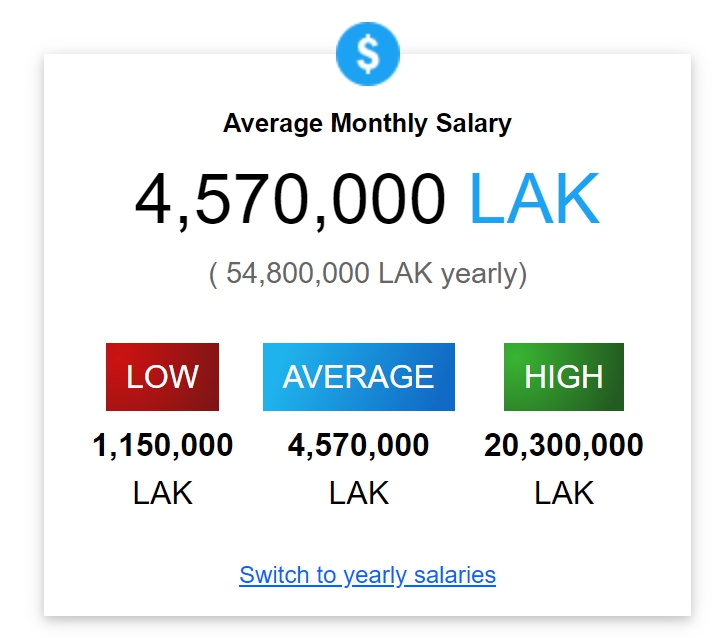 급여 범위는 1,150,000 LAK(최저 평균)부터 20,300,000 LAK(최고 평균, 실제 최대 급여는 더 높음)입니다.