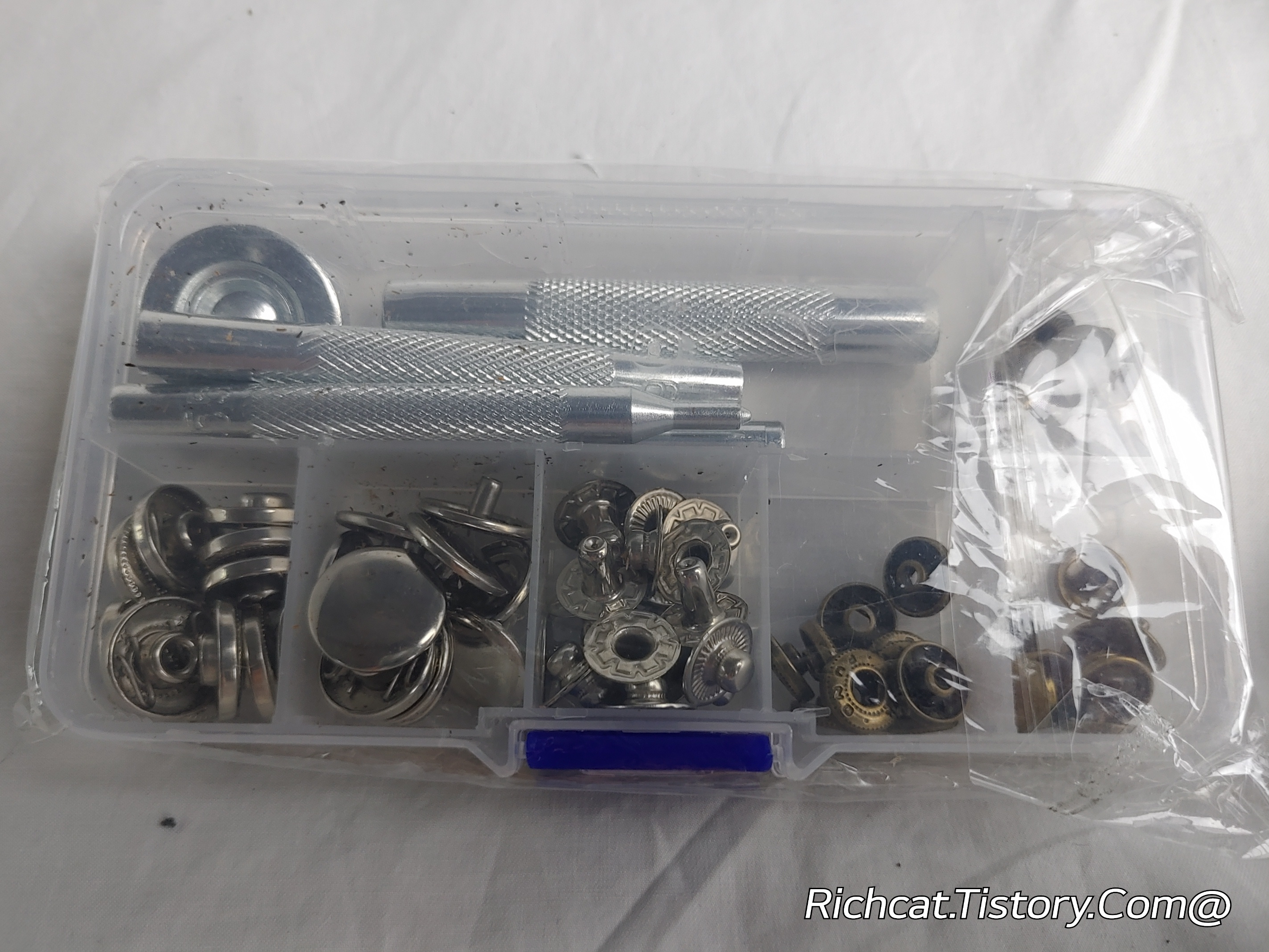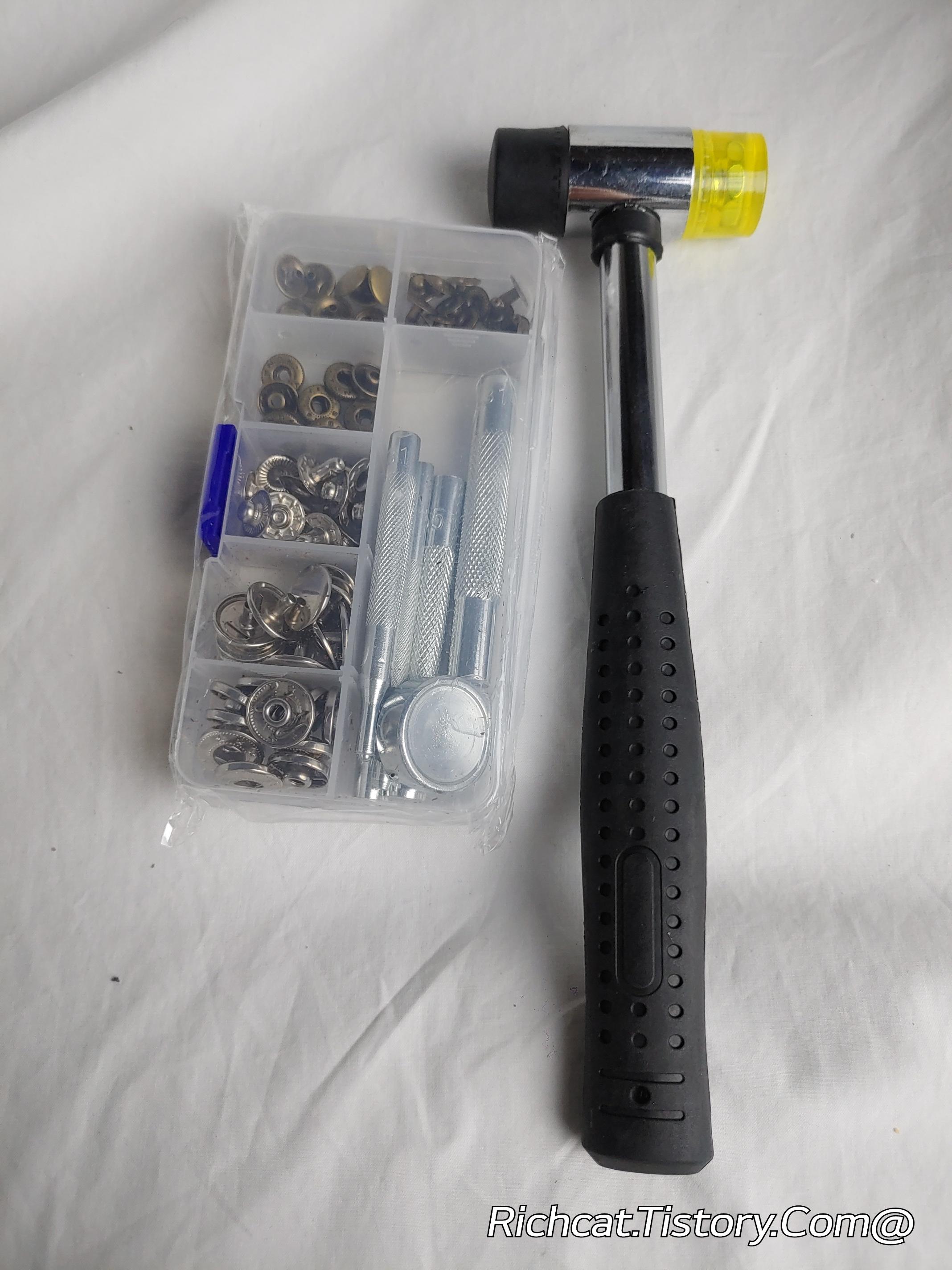 바지에 버튼을 만드는 용도로 쓰는 물건인데 망치까지 다 해서 3,000원 한국에서는 절대로 판매할 수 없는 금액의 가격이다 에코백 등에 단추를 추가할 때 쓸모가 있을 것 같아서 그냥 한번 사 봤다