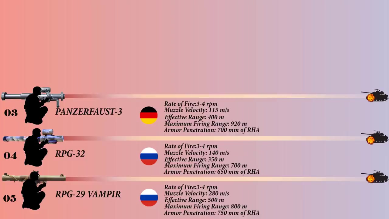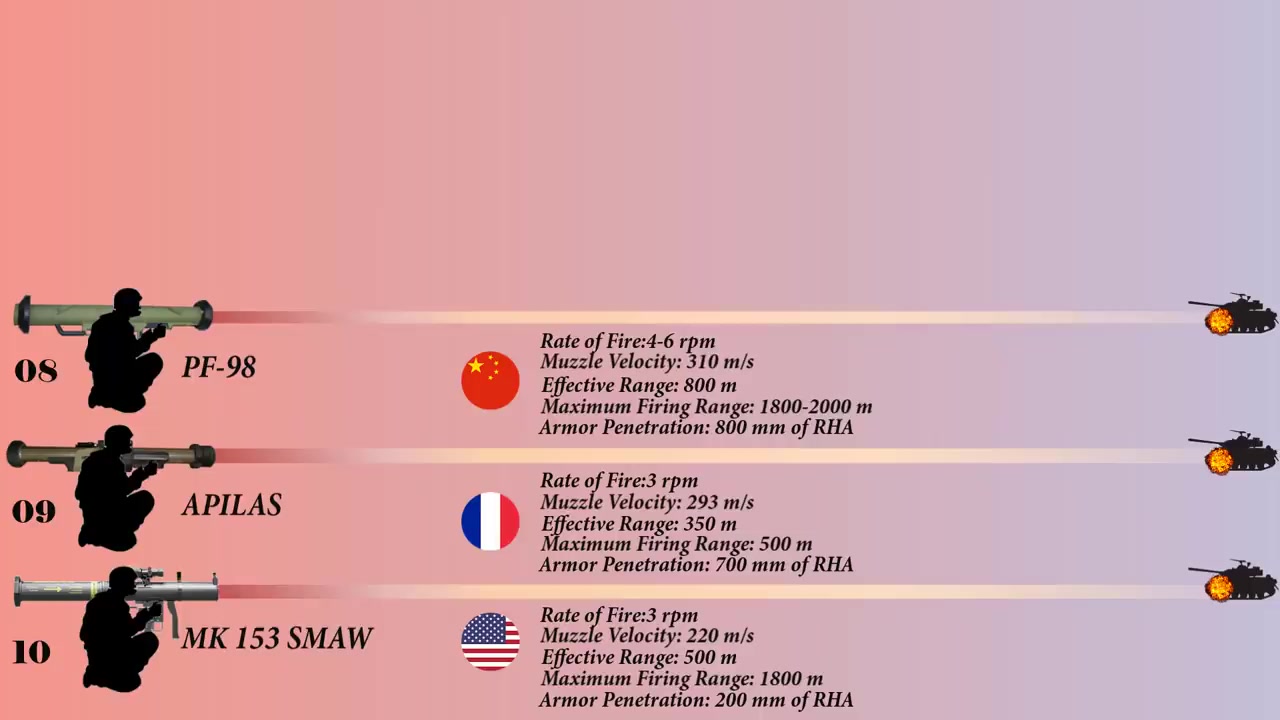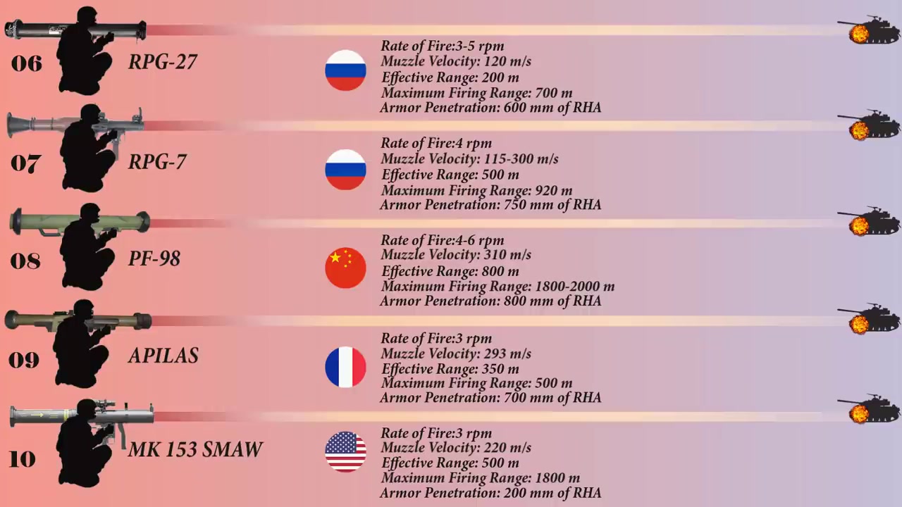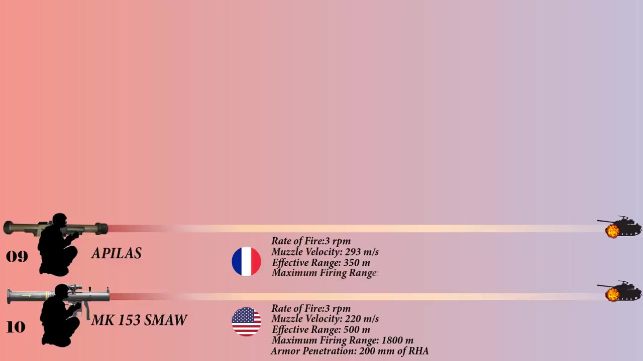 비디오에서는 상위 10개의 안티탱크 로켓 런처를 소개하고 있는데, 10위는 MK1 5:3 어광포 재용공격무기이며 미국의 무장 부대에 1984년에 도입되었습니다.