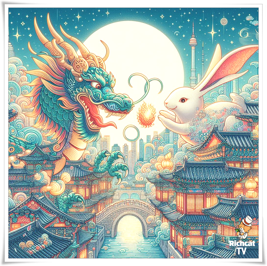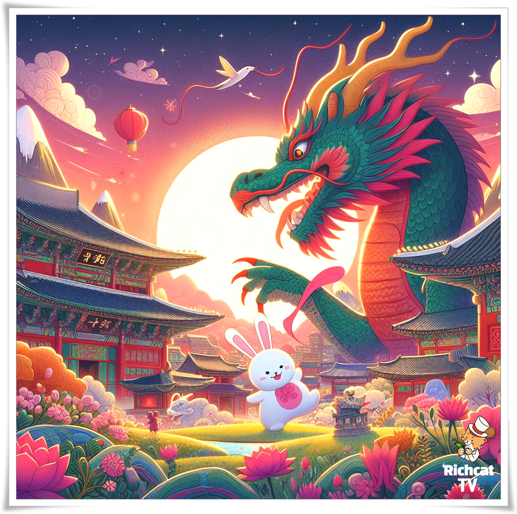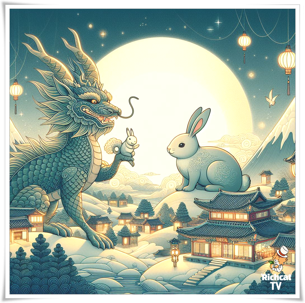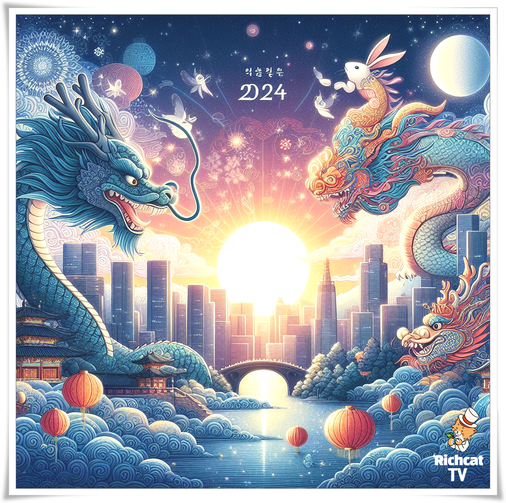 2024 happy new lunar year, with dragon and rabit, in seoul KOREA , Korean traditional art style