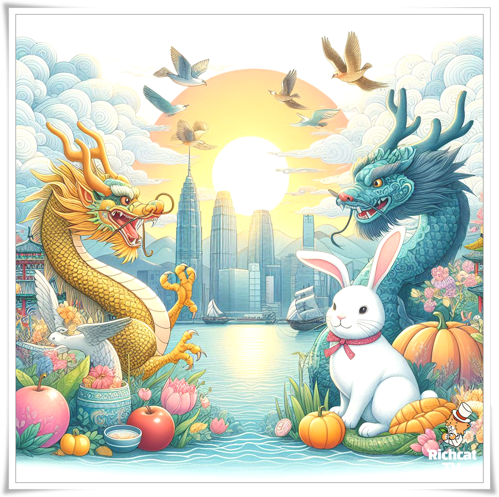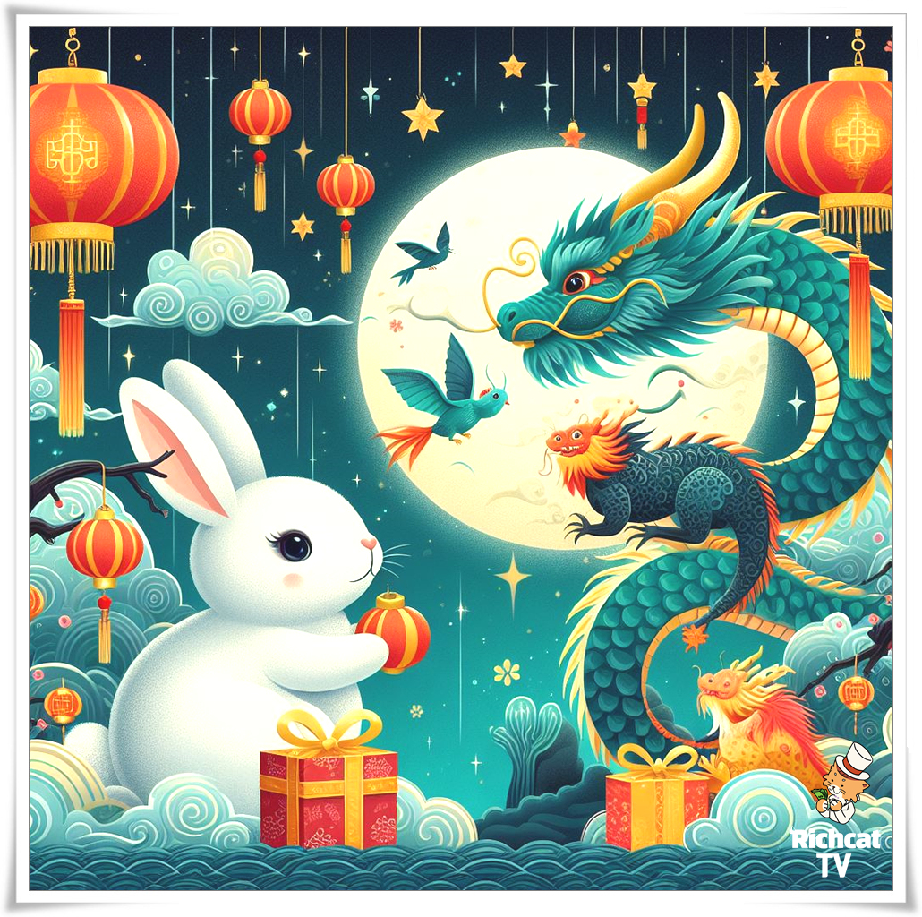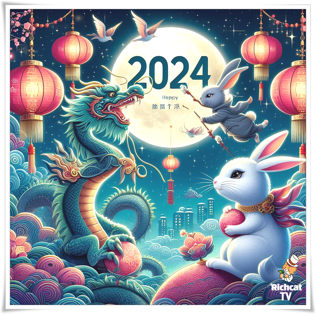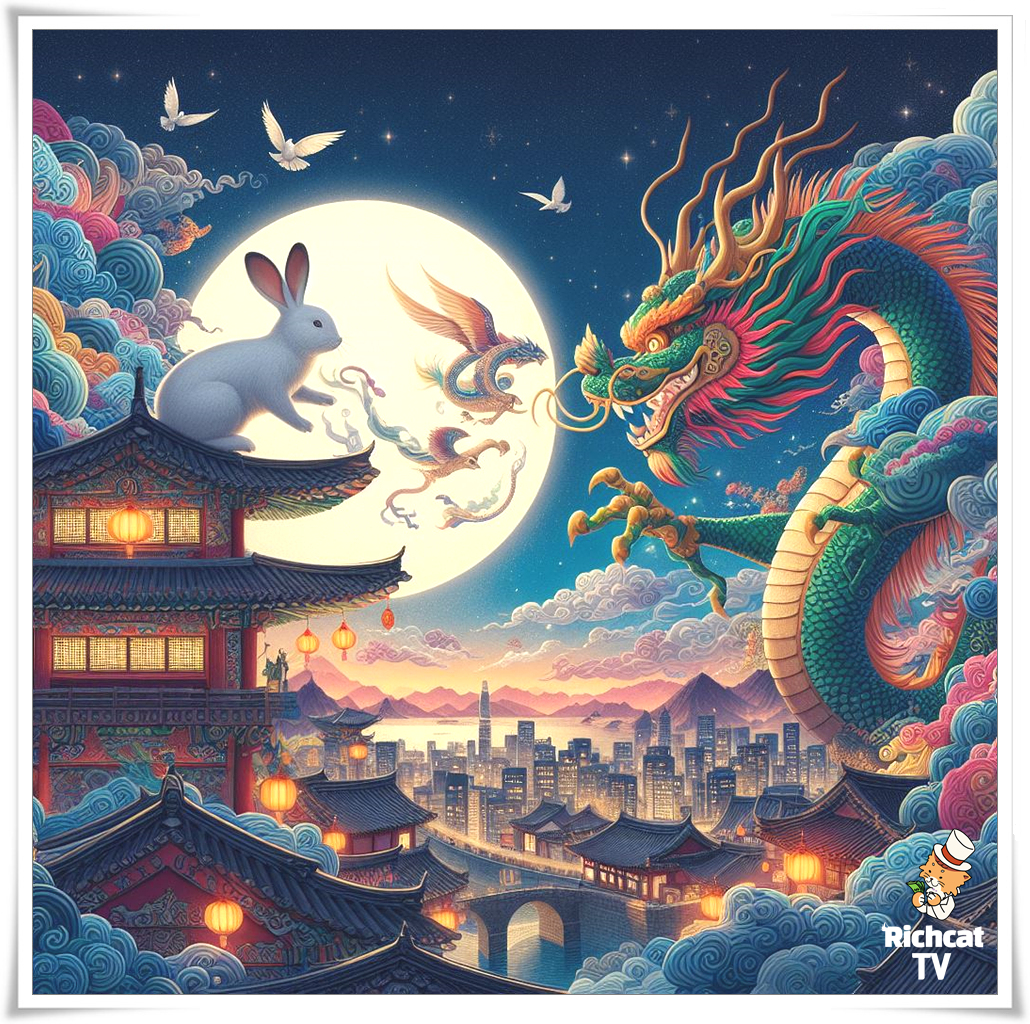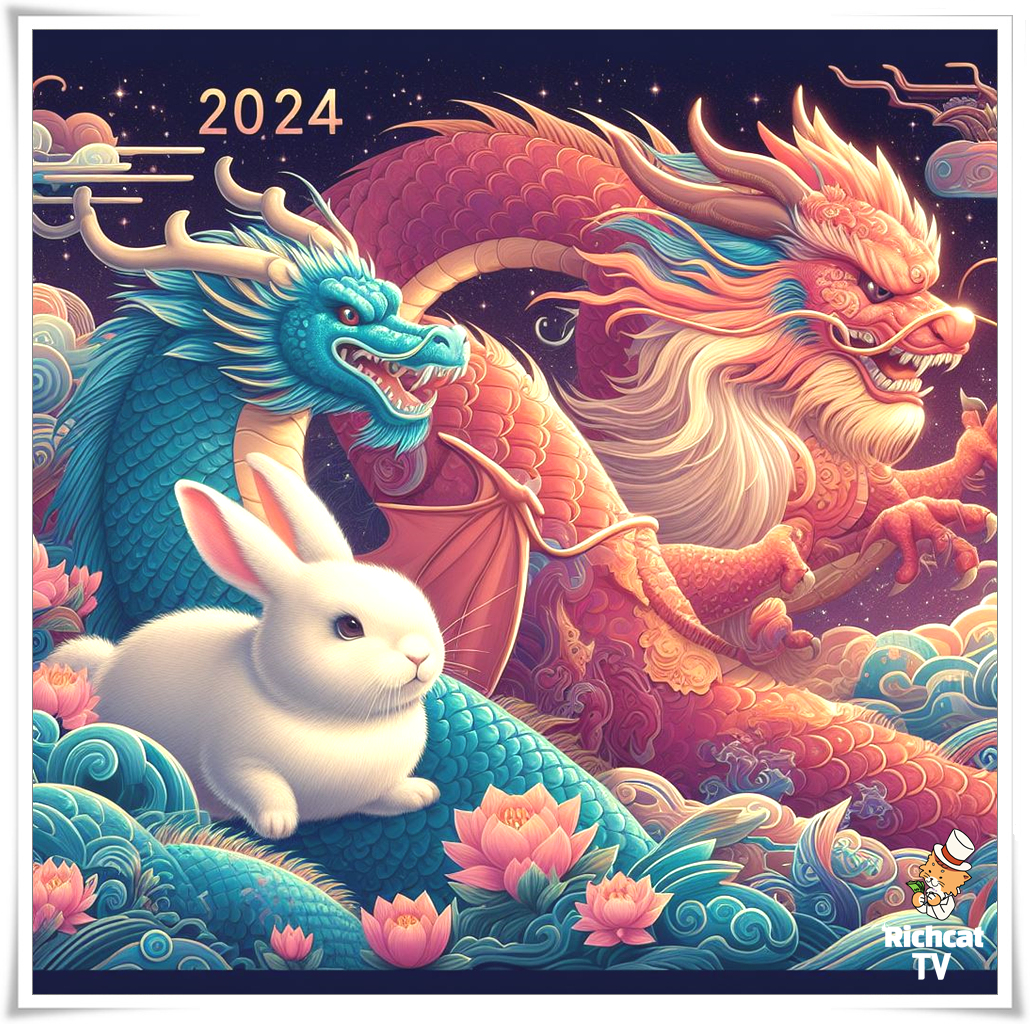 2024 happy new lunar year, with dragon and rabit, in seoul KOREA , Korean traditional art style