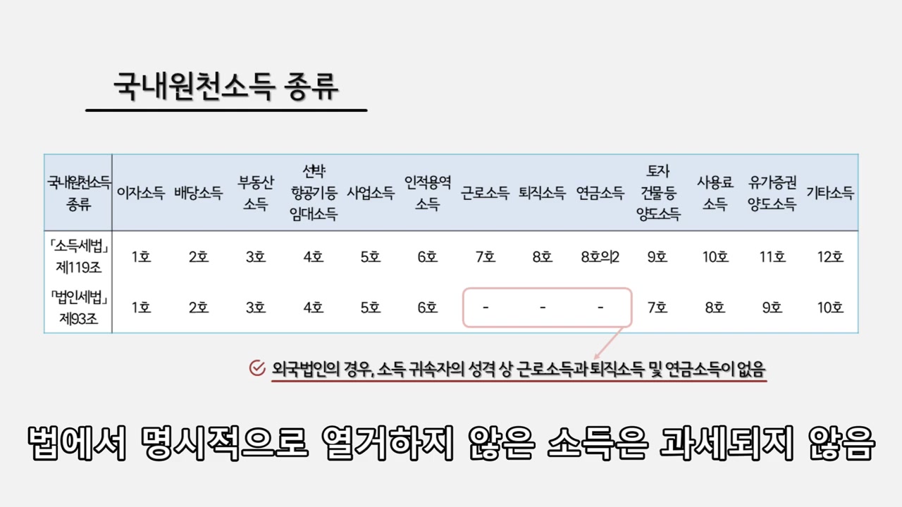 국내세법은 비거주자에게 과세 가능한 국내원천소득 종류를 열거하고 있어요.
