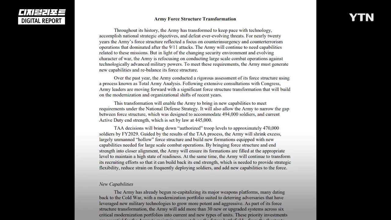 미국 육군이 현지시간 27일 발표한 '육군 전력 구조 변혁' 백서입니다. 미 육군은 중국과 러시아 같은 강대국과의 대규모 전투에 대비해 무인기 대응 부대 등 미래 전쟁과 직결된 분야의 병력 정원을 7천 500명 늘리기로 결정했습니다. 미 육군은 순항미사일, 무인기, 로켓 등의 공격을 방어하는 간접화력방어역량 대대 4개를 신설해 방공력을 강화하고 각 대대에 총 9개의 대 무인기 포대를 배치할 계획이라고 밝혔습니다. 이와 더불어 미 육군은 공중·지상·해상·우주·사이버 등의 영역을 포괄하는 다영역특임단을 5개로 확대하기로 했습니다. 반대로, 이라크와 아프가니스탄에서 테러와의 전쟁을 치르며 비대해진 특수부대 약 3천 명을 감축하기로 했습니다. ABC뉴스는 이같은 육군의 변화는 911테러 이후 대테러전을 하면서 특수부대 규모를 키웠지만 이제 군이 중국과 러시아와 같은 강대국과의 대규모 전투에 더 집중하기 위한 결정이라고 설명했습니다. 또 우크라이나 전쟁을 통해 무인기를 상대할 방공 체계의 중요성이 부각되면서 이런 전력 구조 개편이 이뤄졌다고 평가했습니다. 백서에 따르면 미 육군은 2029 회계연도까지 육군 정원을 2만 4천 명 줄여, 현재 49만 4천 명에서 47만 명까지 감축할 계획이라고 밝혔습니다. 다만 미 육군은 정원 감축은 조직도에 존재하지만 병력은 없는 불필요한 전력 구조를 줄인 것이라고 설명했습니다. 특히 미래 전쟁에서 대규모 전투를 하는 데 필요한 분야의 정원을 확대한 것을 강조했습니다. 미군의 이같은 결정에 대해 뉴욕타임스는 대규모 전투로의 초점 전환은 긍정적으로 평가하면서도, 중동 지역에서의 분쟁이 지속되고 있는 만큼 앞으로 수년간은 대테러전에도 대비해야 할 것이라고 지적했습니다.