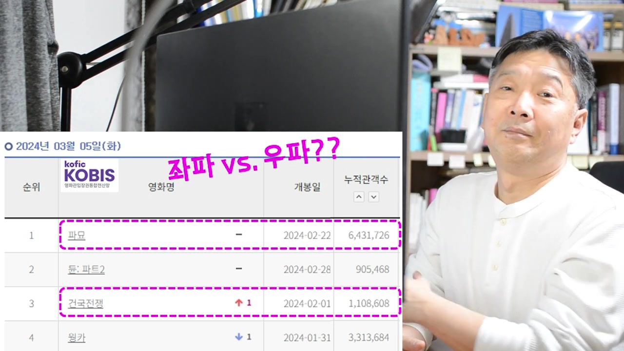 영화 '건국 전쟁'과 '파묘'의 관객 수 및 개봉 일자를 비교하며 '파묘'가 성공적이라고 언급되었어요.