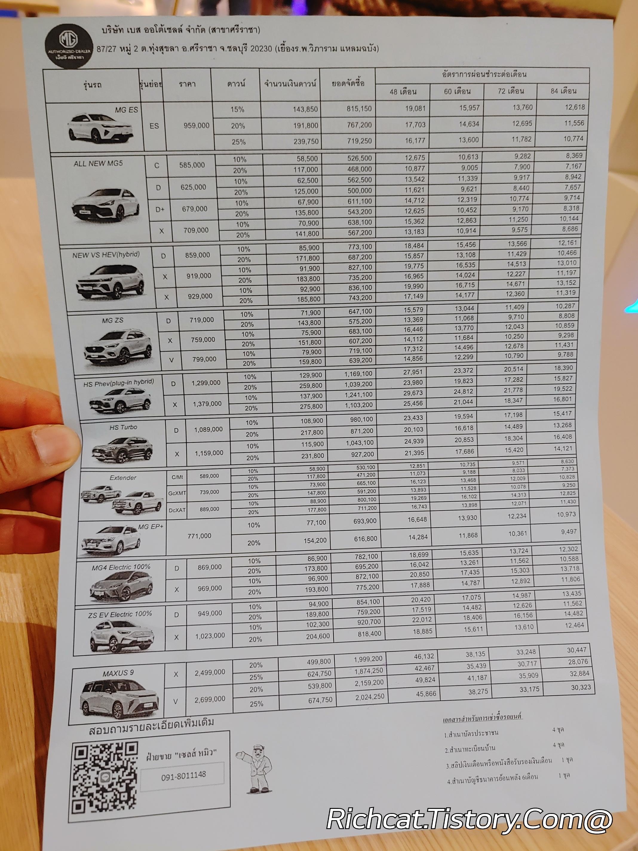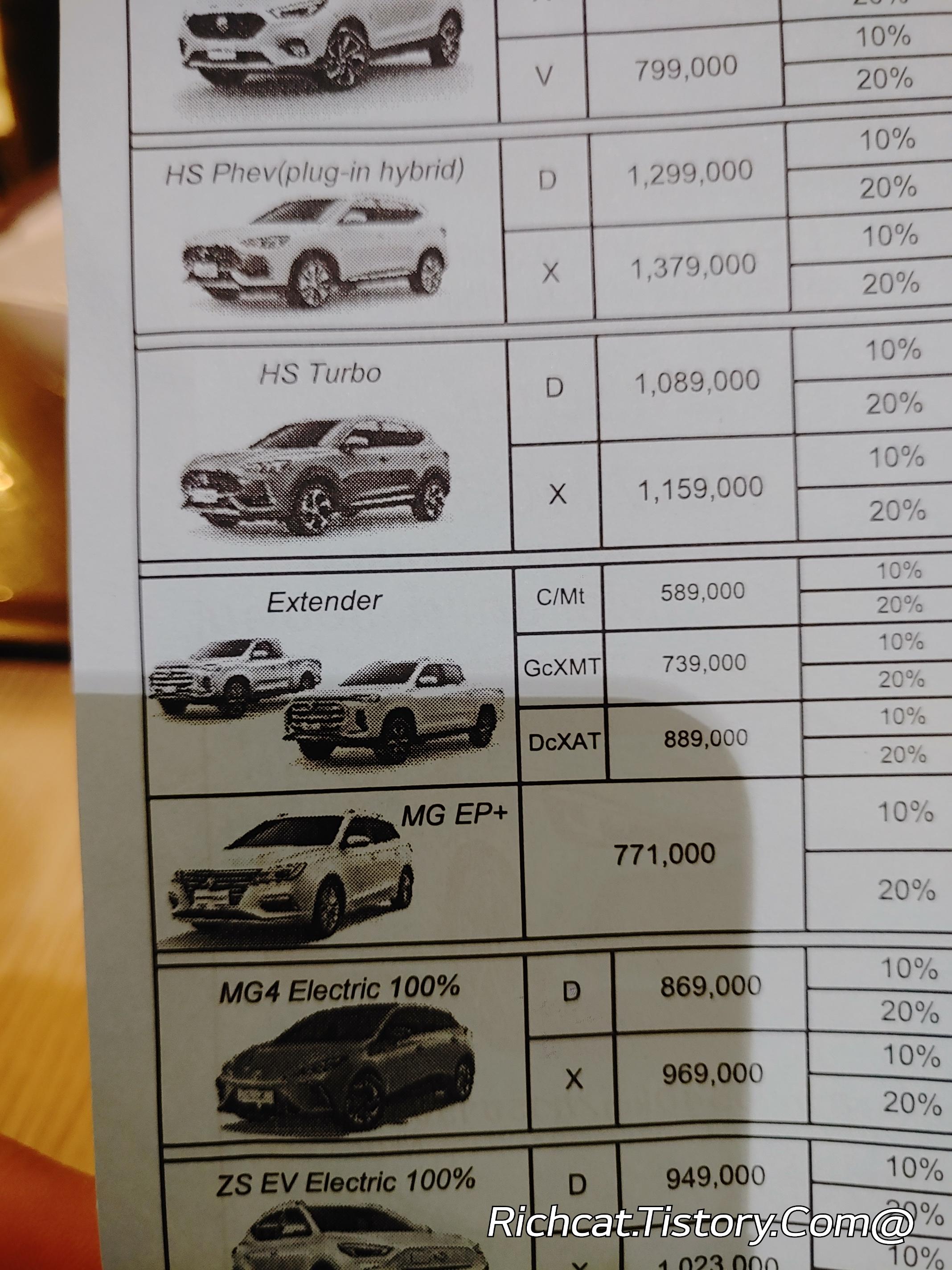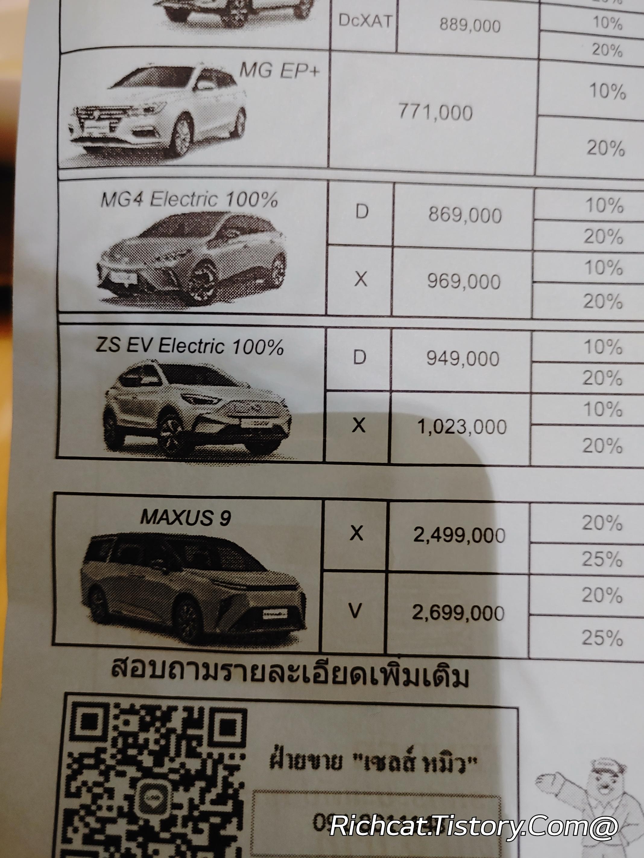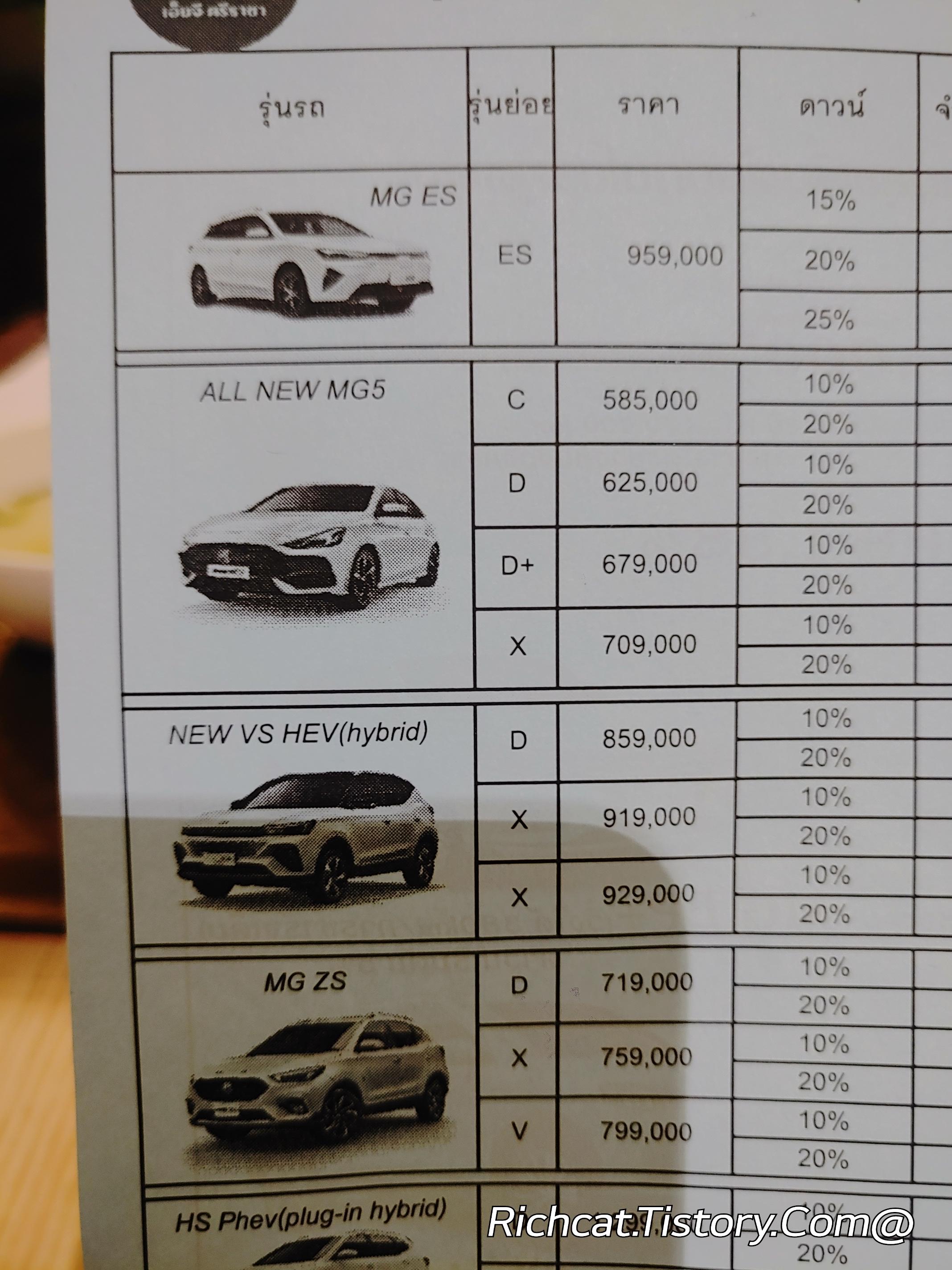 MG자동차 전차종. 태국 판매가격표. 태국물가