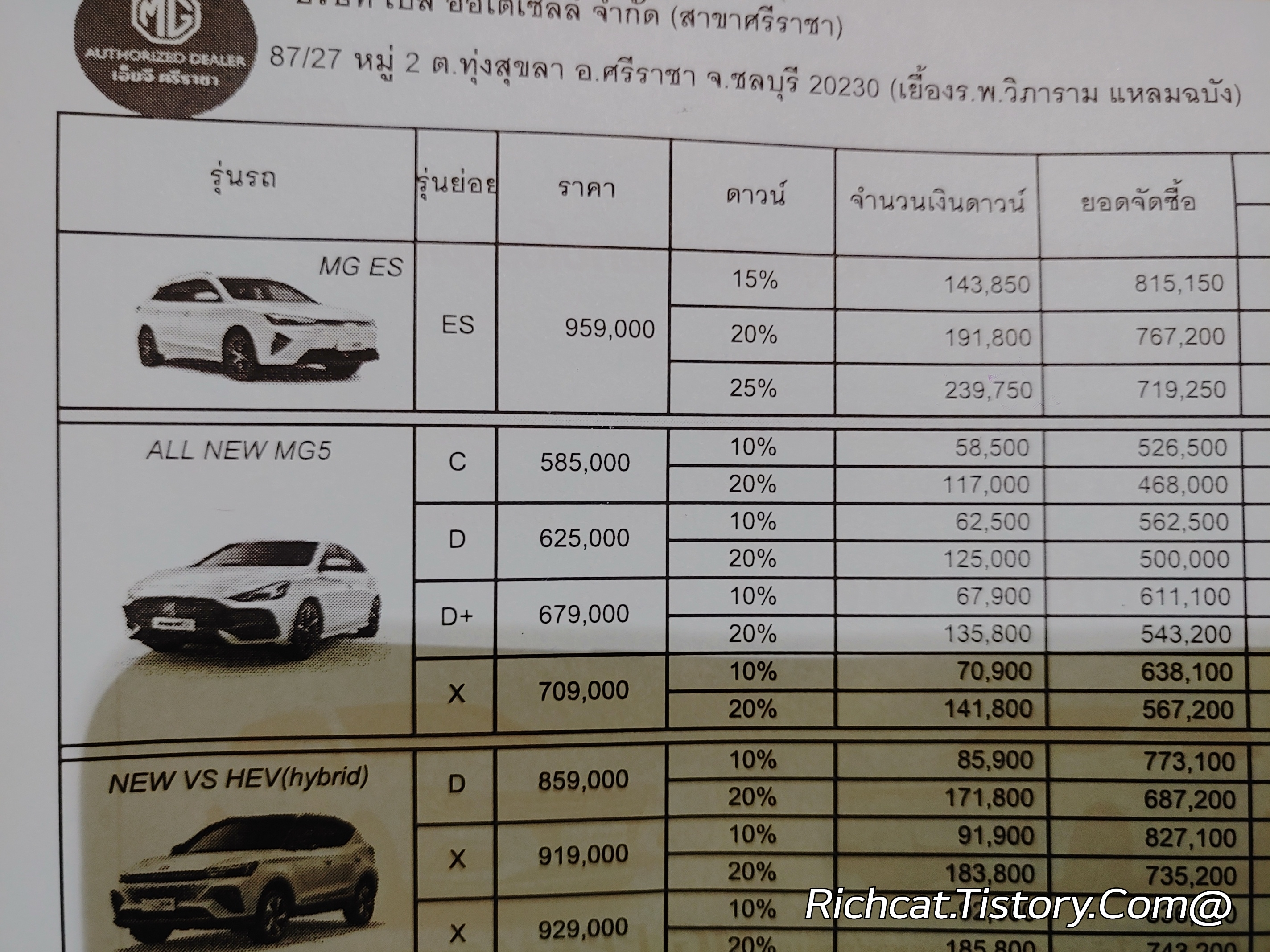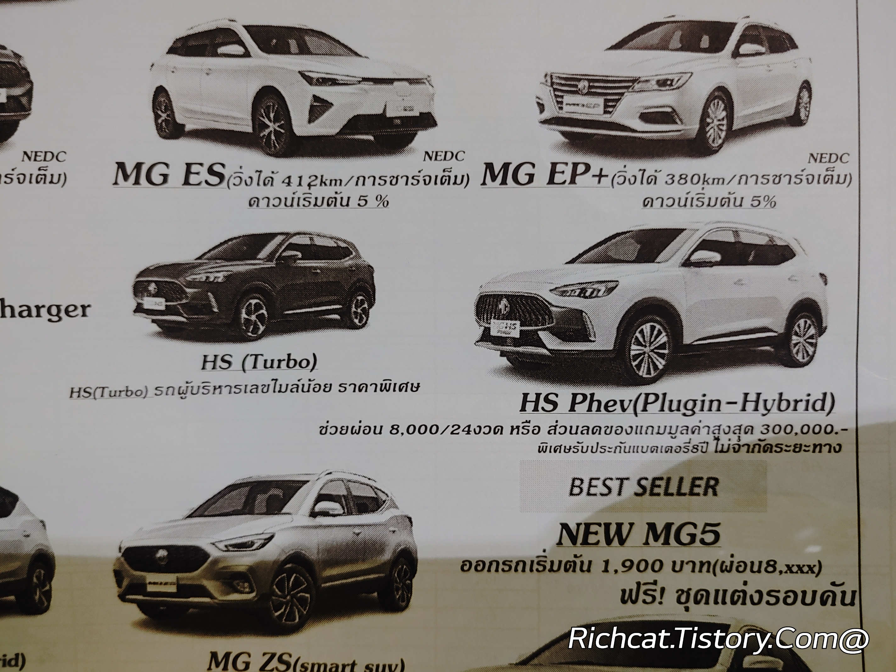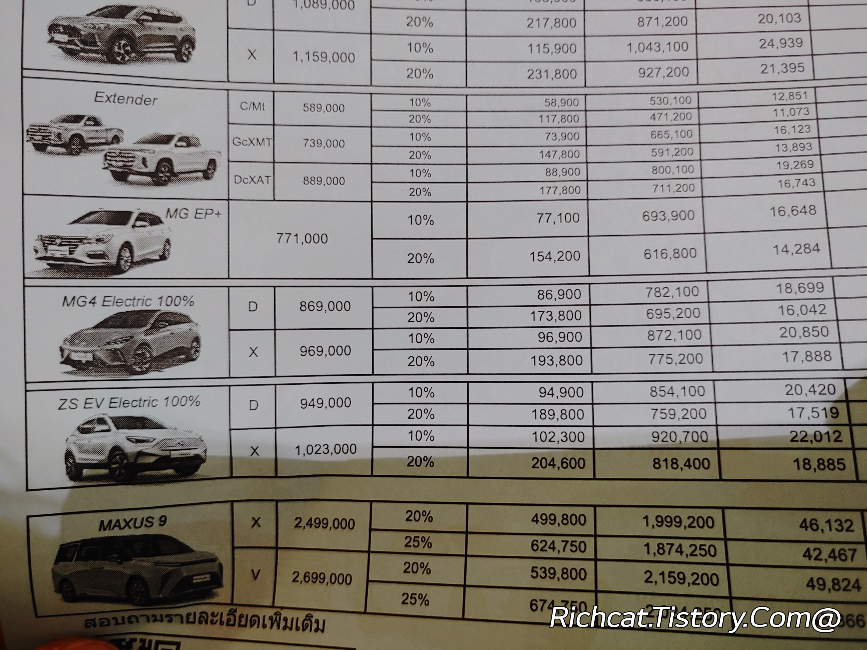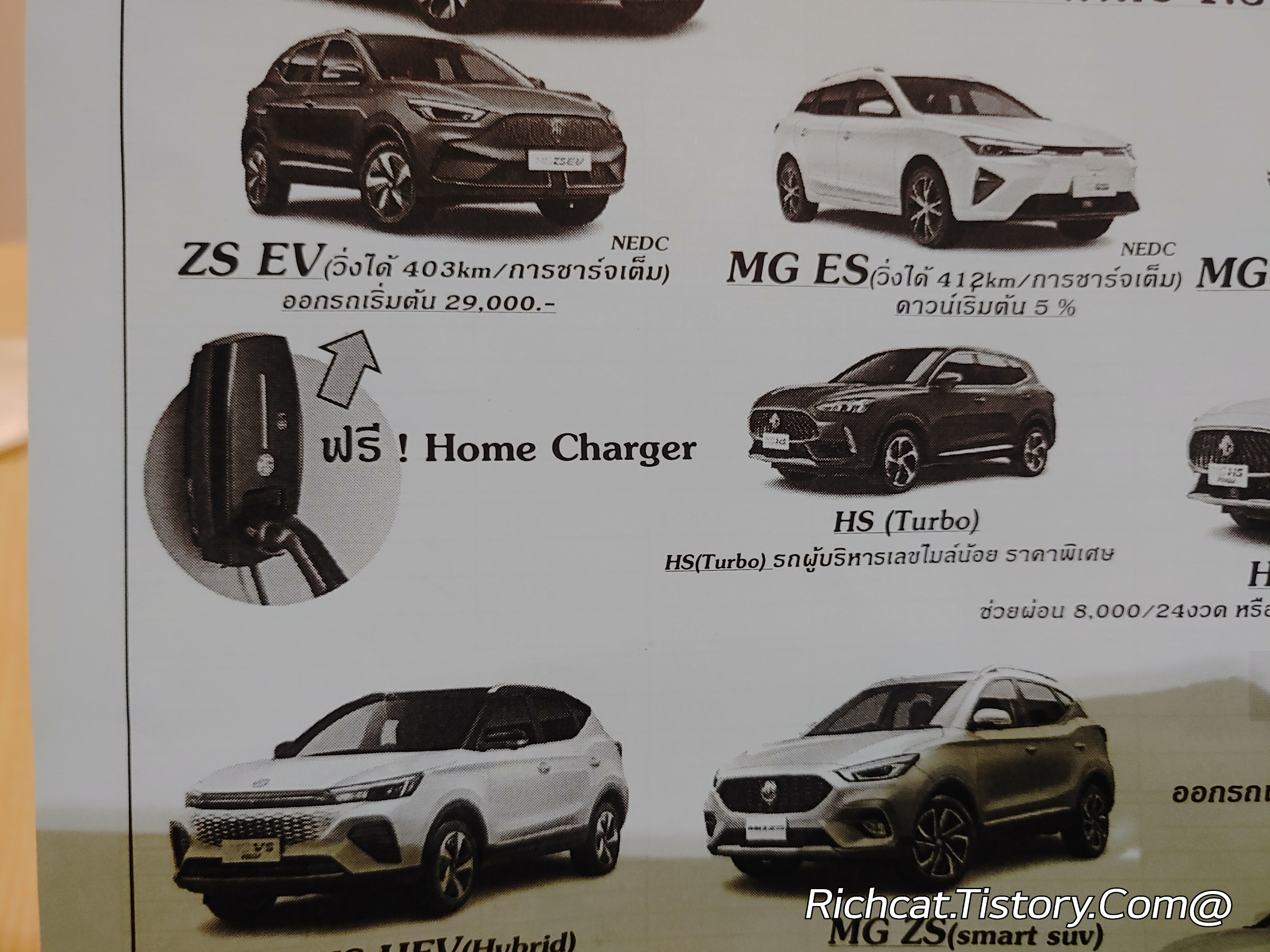 MG자동차 전차종. 태국 판매가격표. 태국물가