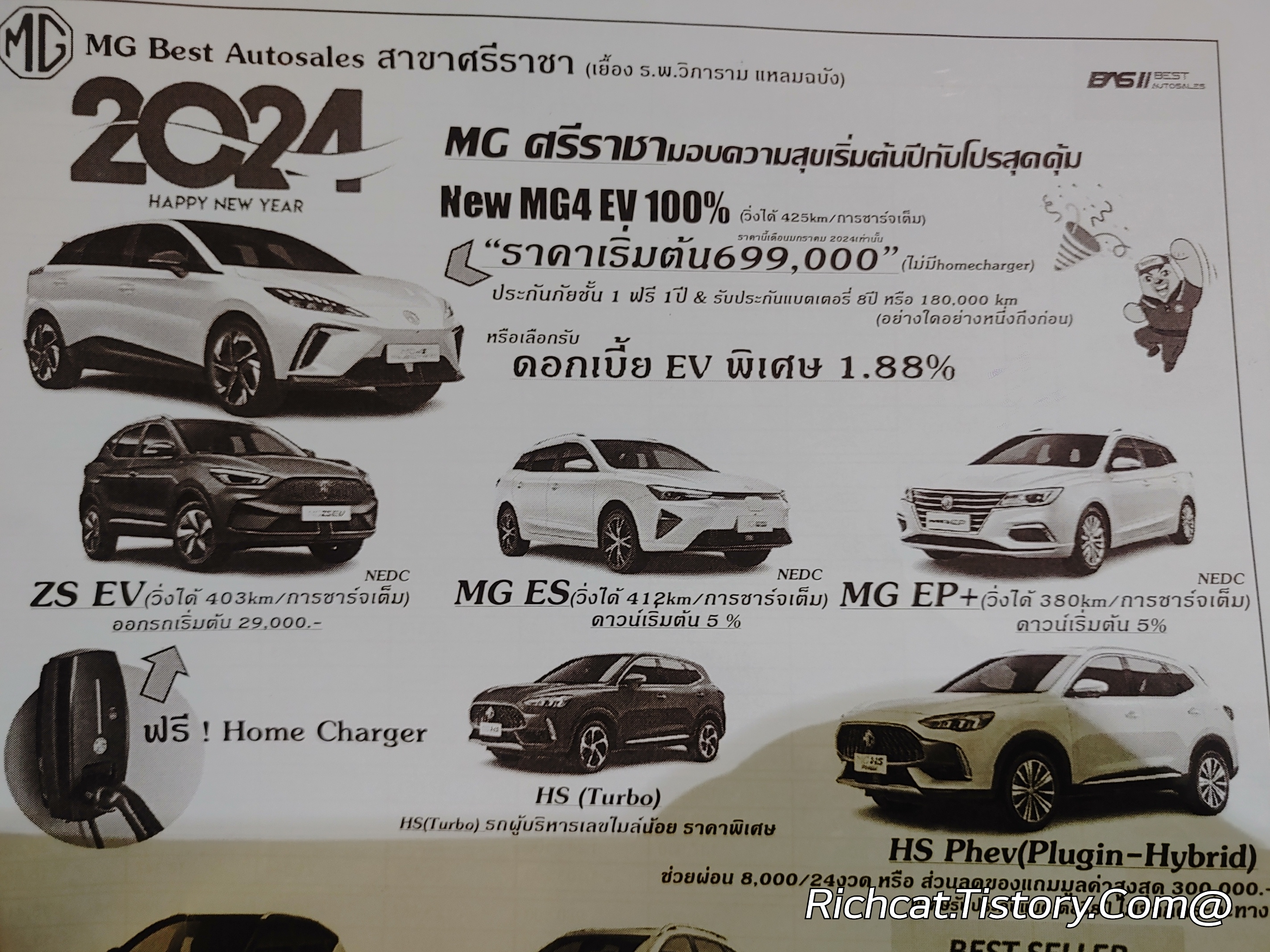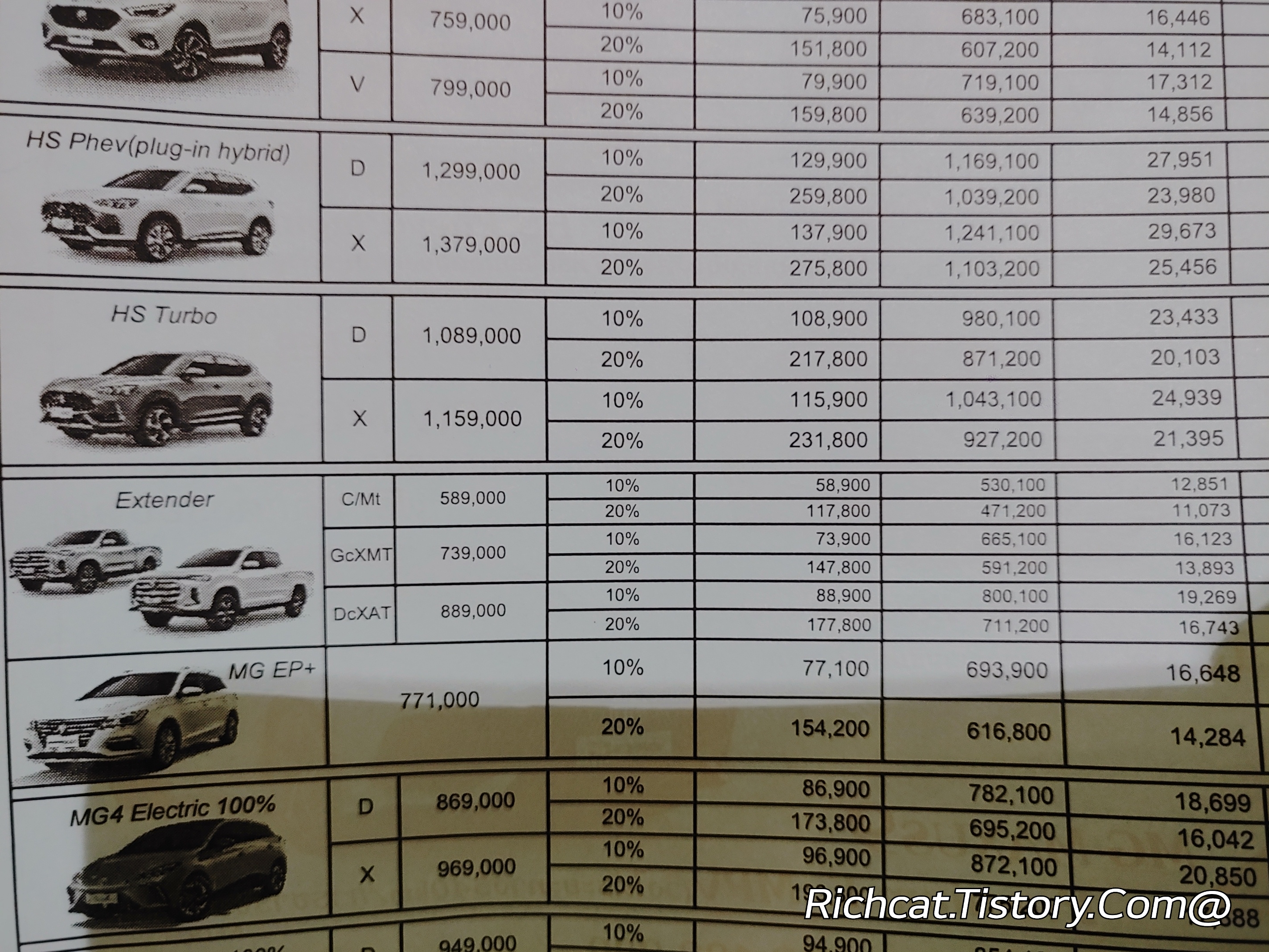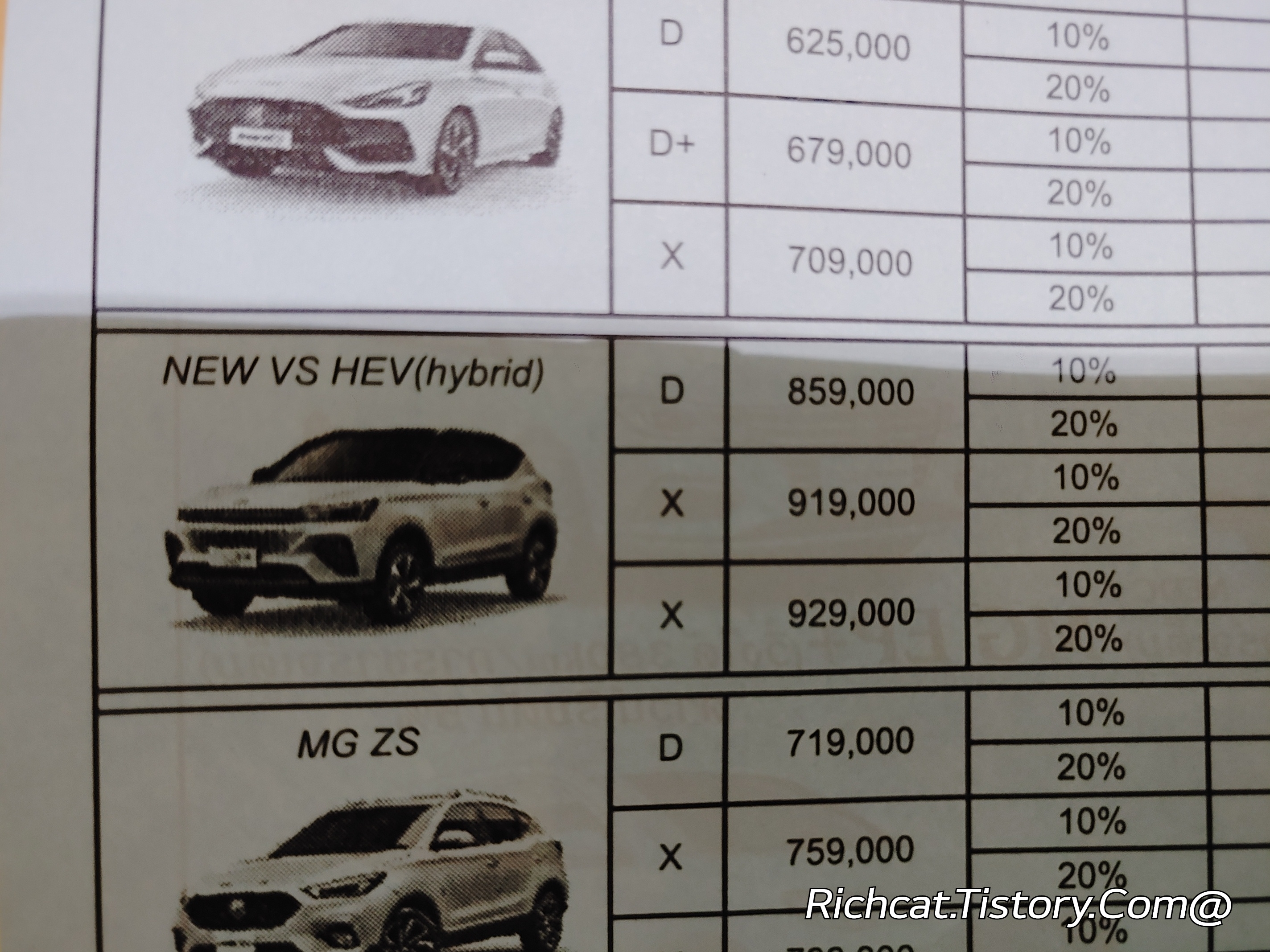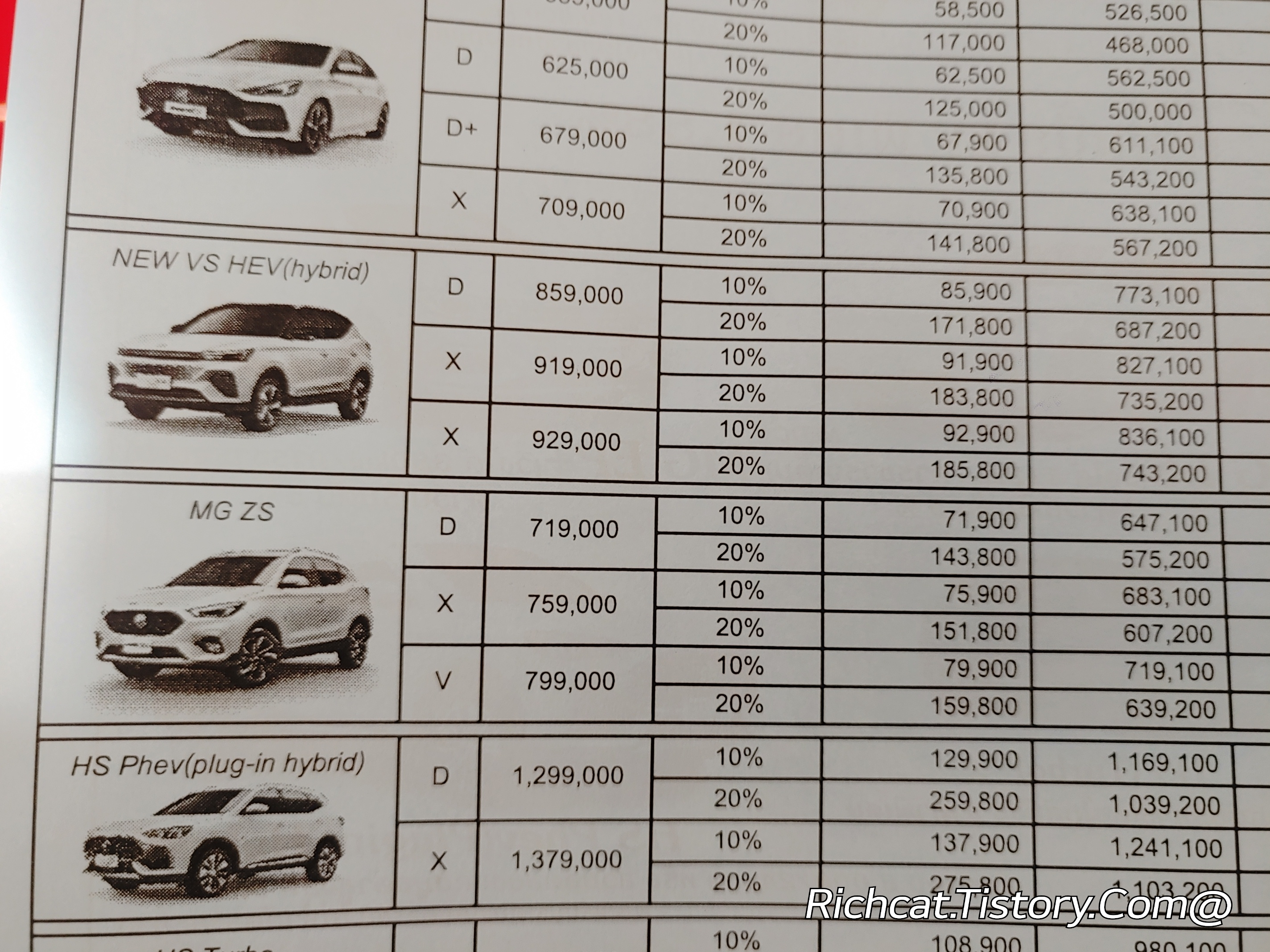 MG자동차 전차종. 태국 판매가격표. 태국물가