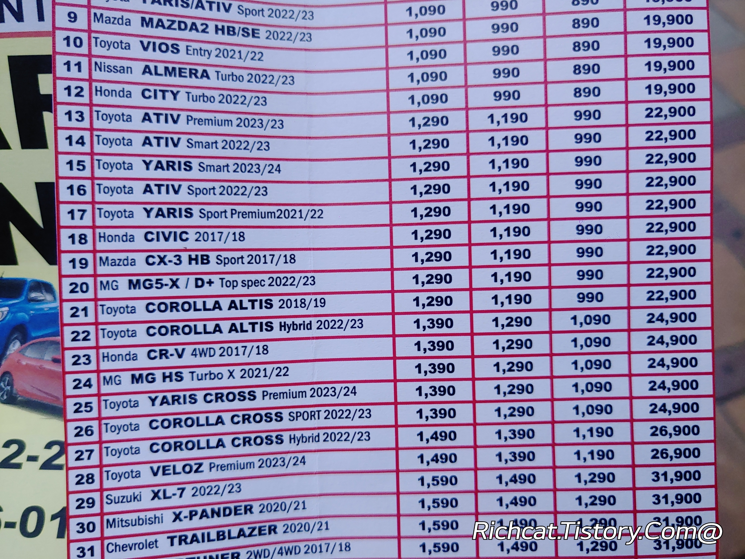 2024년 3월 태국 파타야 렌트카 가격표