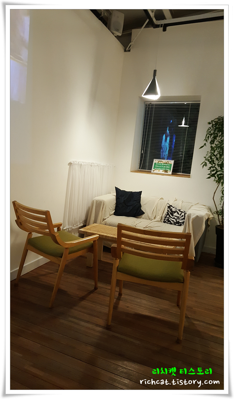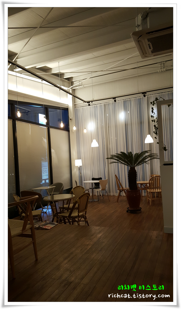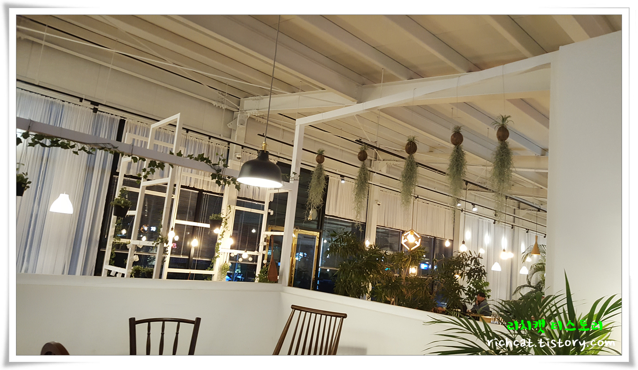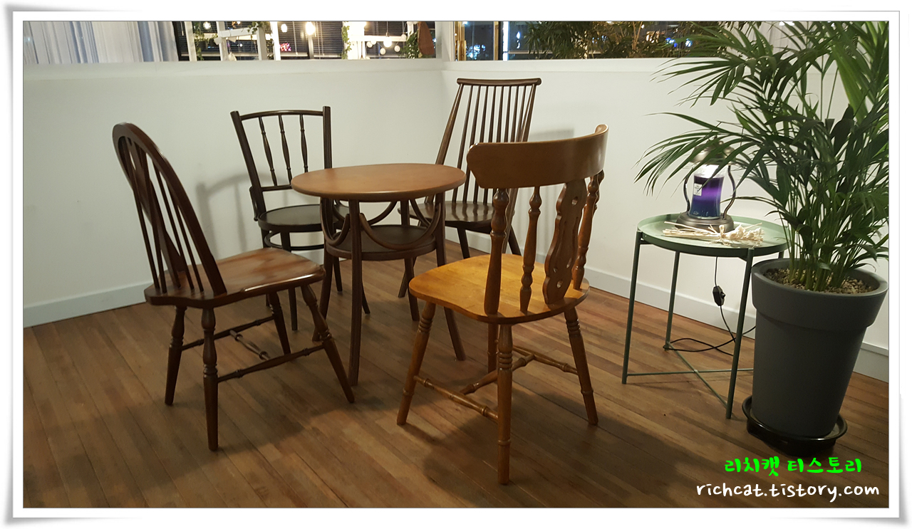 큰 비용 들인 것 같지 않지만...다양한 위치와 형태의 의자외 탁자들로 조화를 이룬 카페테리아.